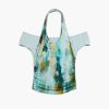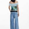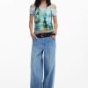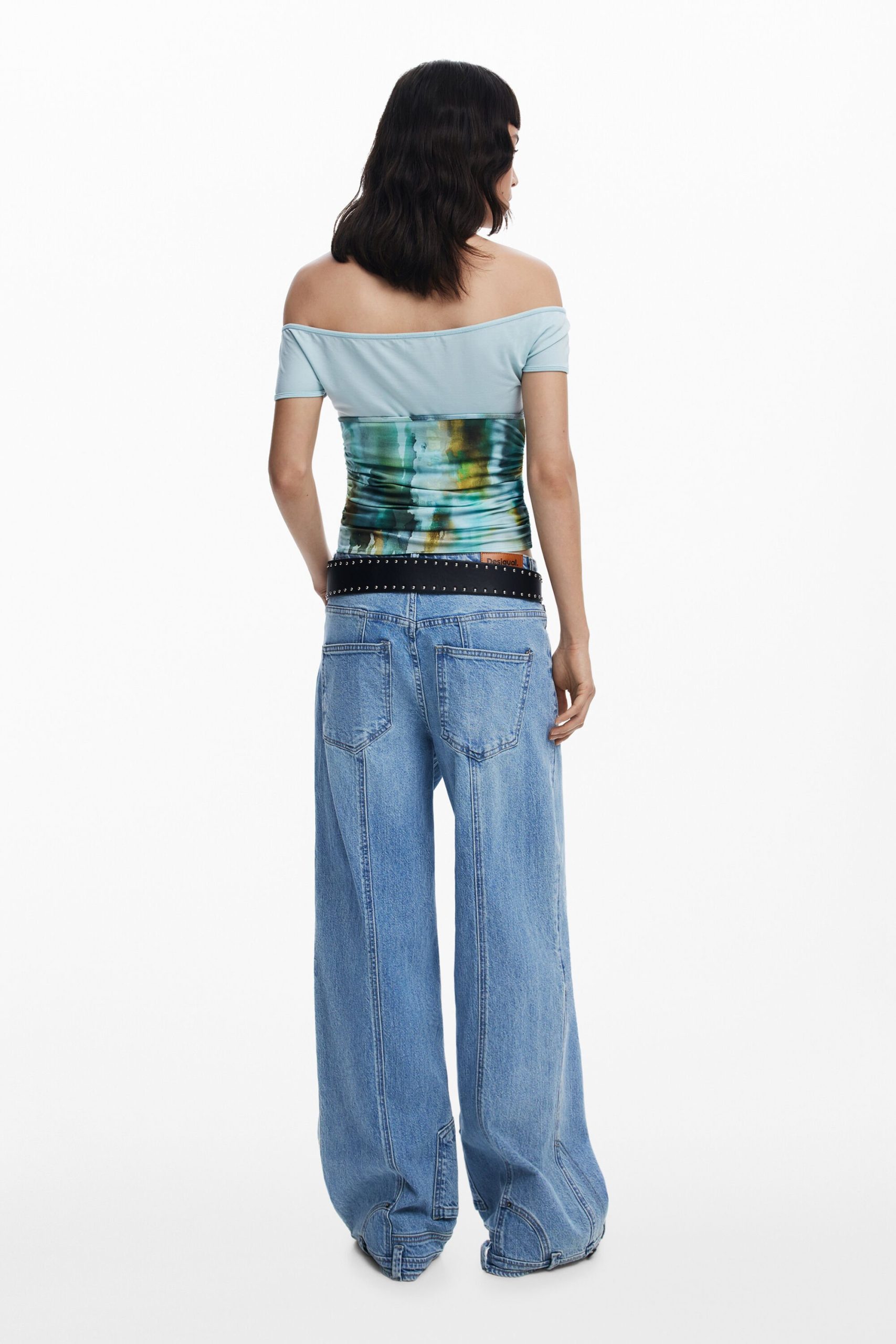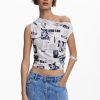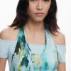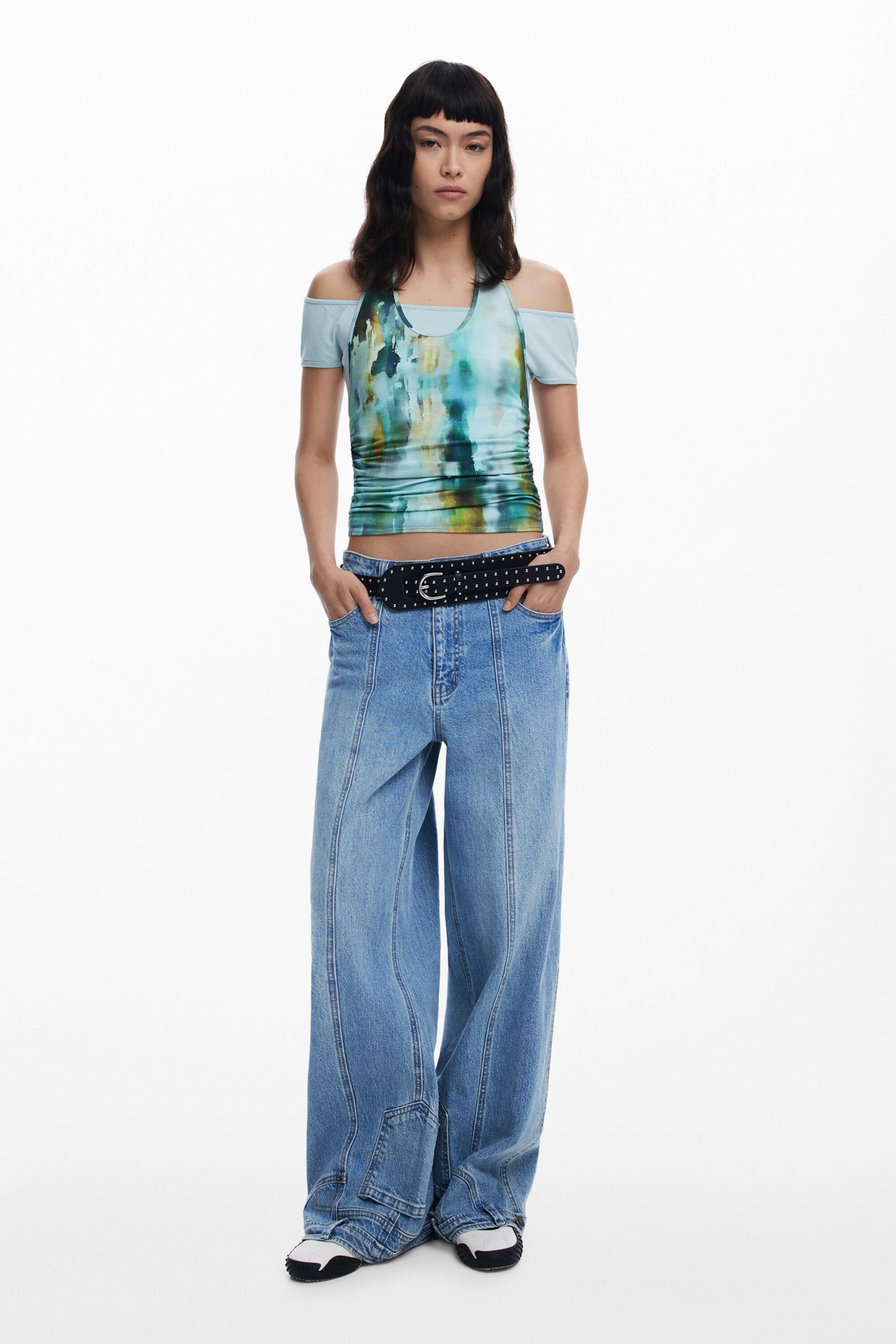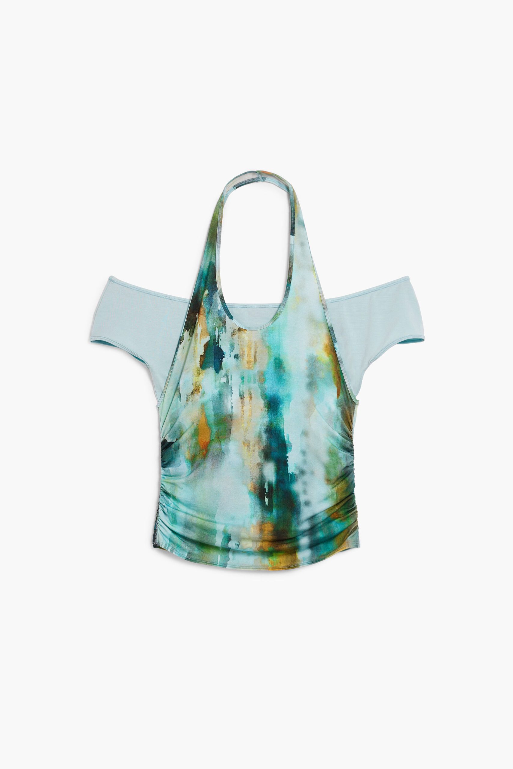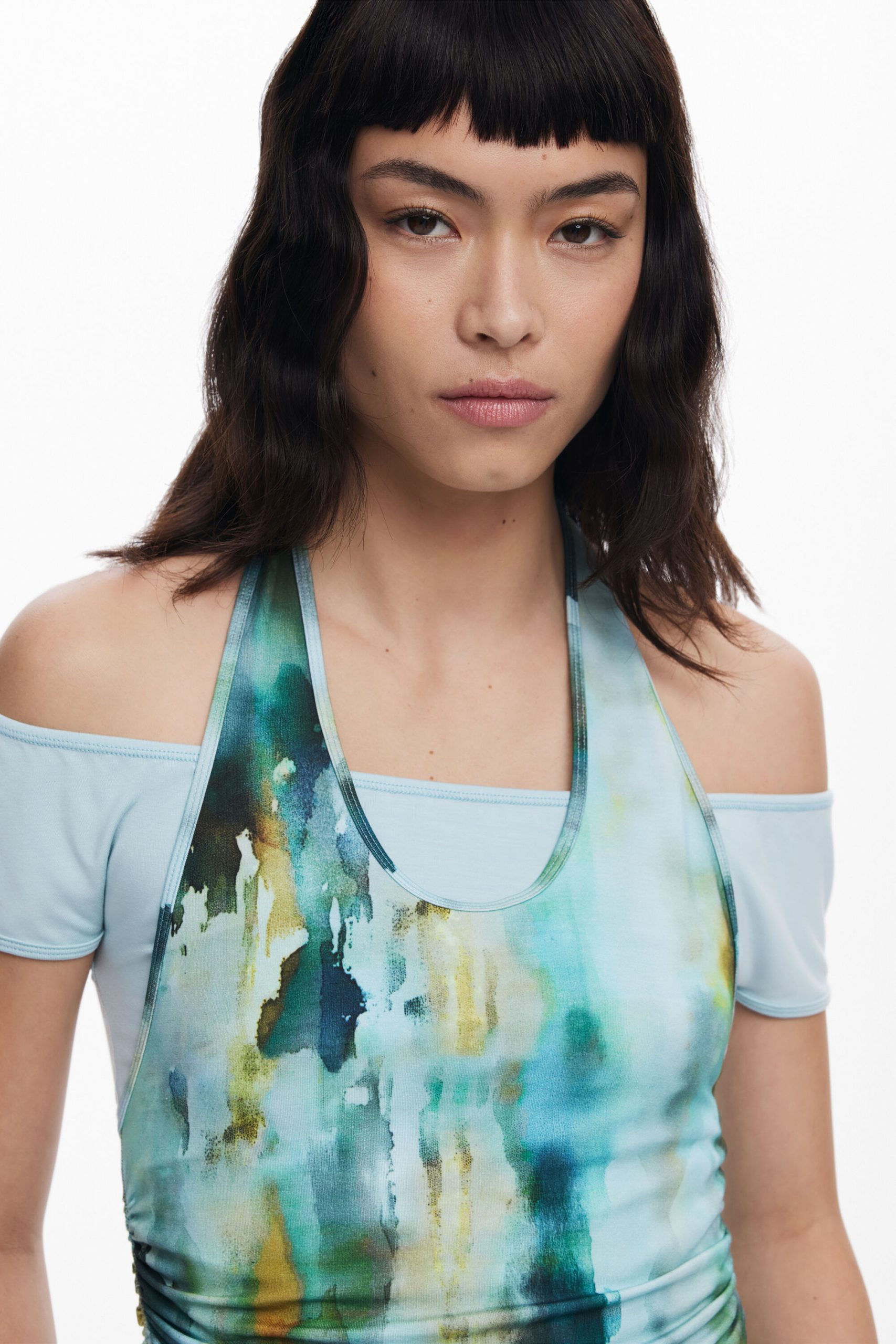 Short-sleeve T-shirt with layering effect, solid color on the inner T-shirt and printed color on the outer top with halter neckline.
