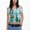 Short-sleeve T-shirt with layering effect, solid color on the inner T-shirt and printed color on the outer top with halter neckline.