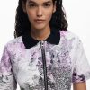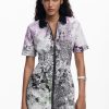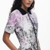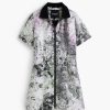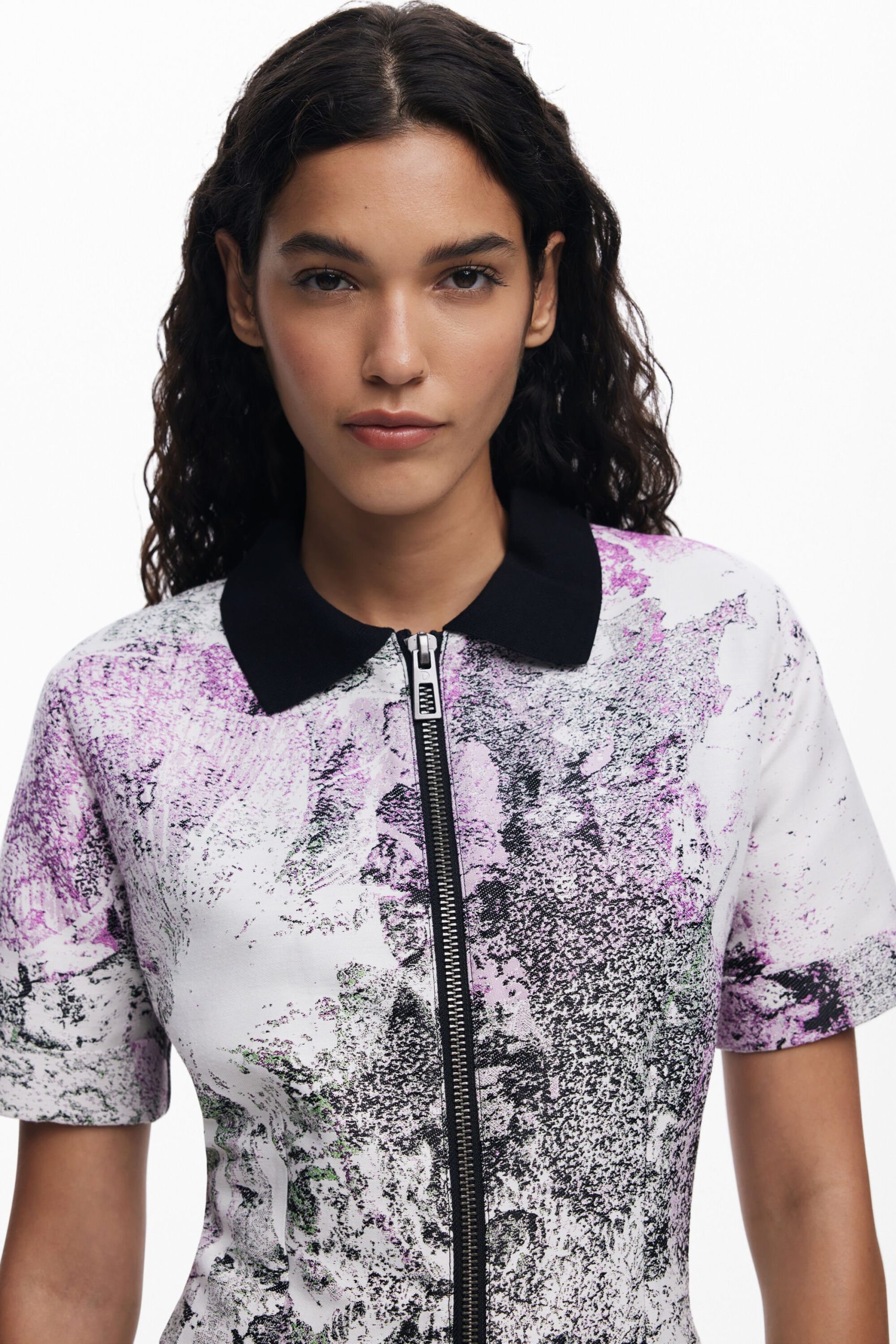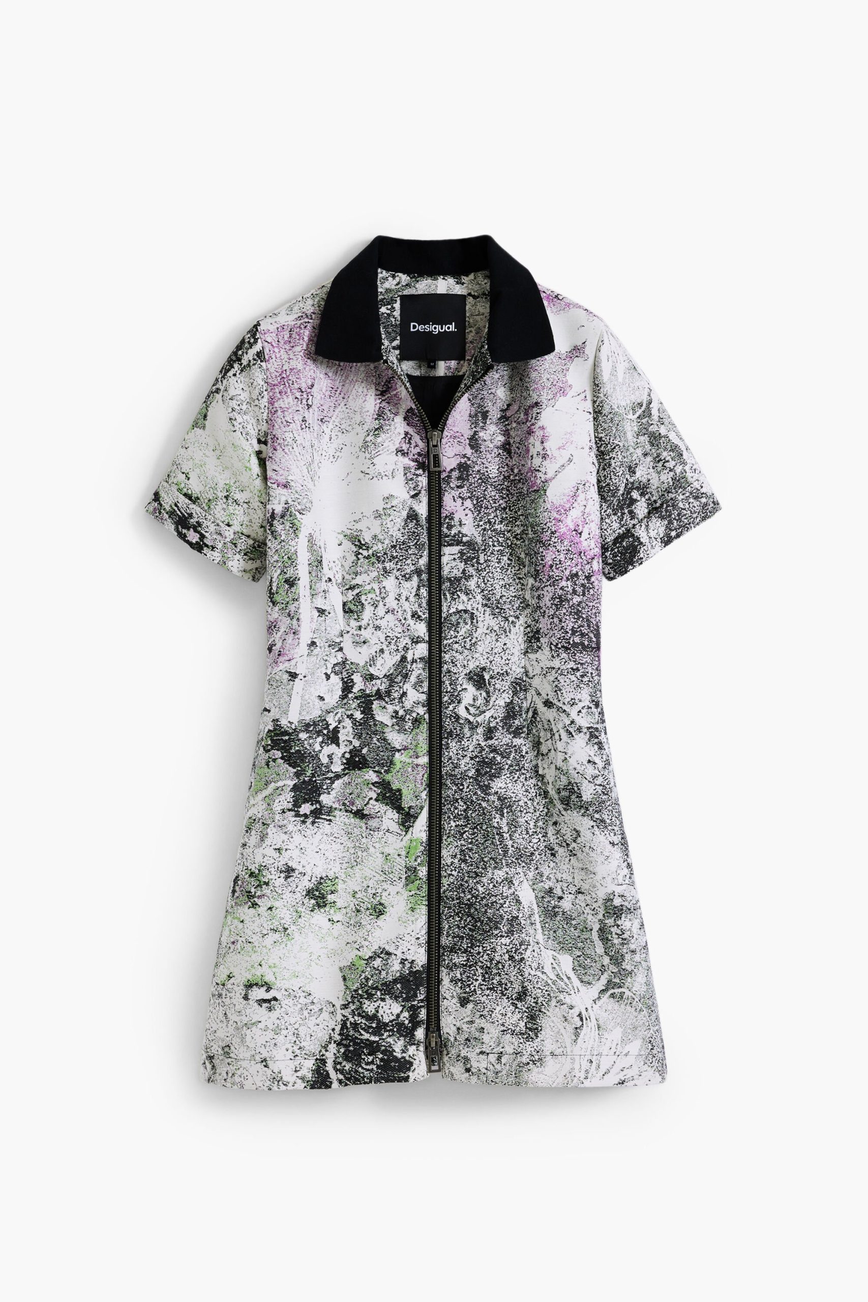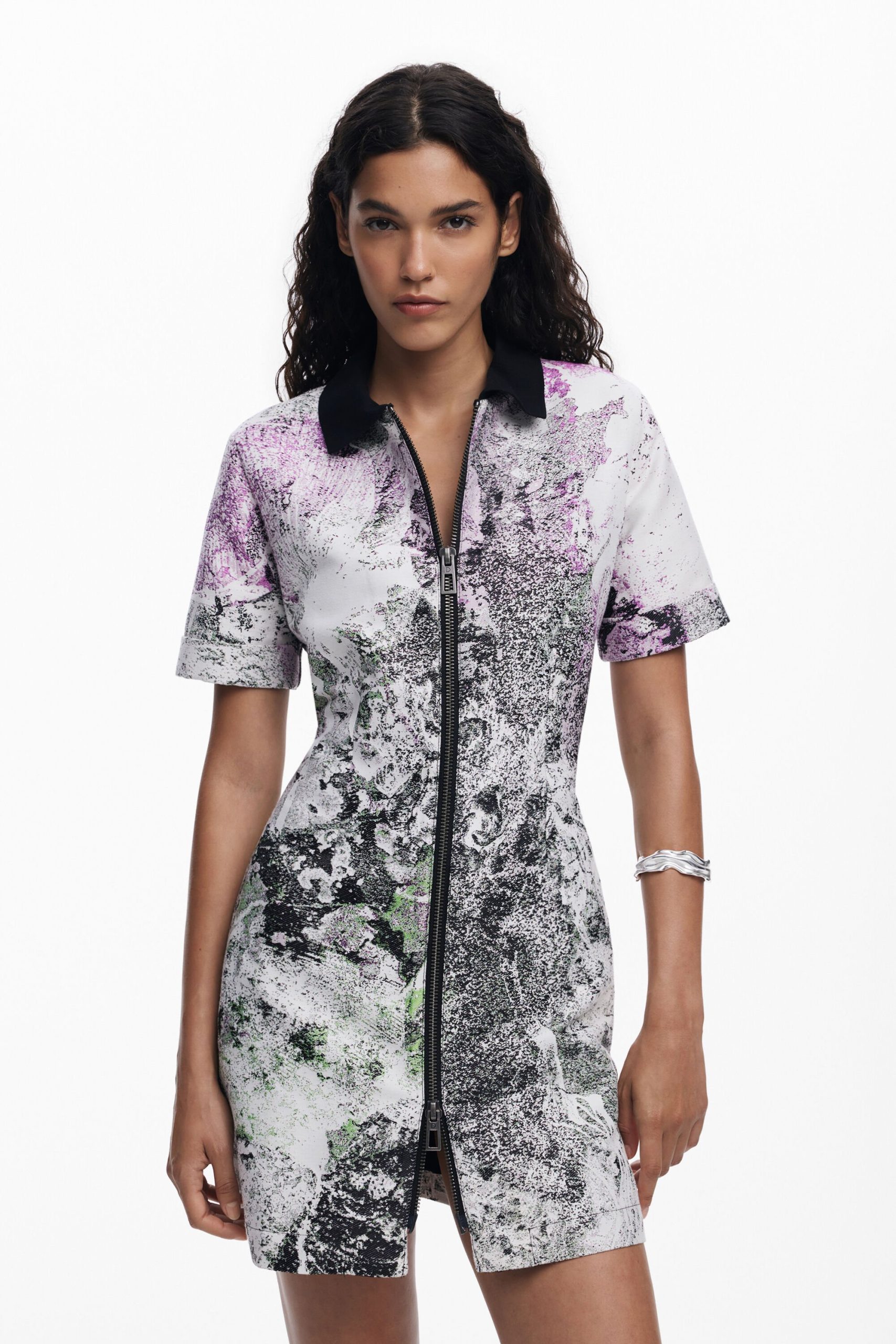 Short marbled dress, with short sleeves, front zipper, lapel collar, and pockets, designed by Monsieur Christian Lacroix.