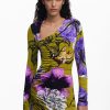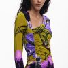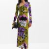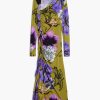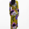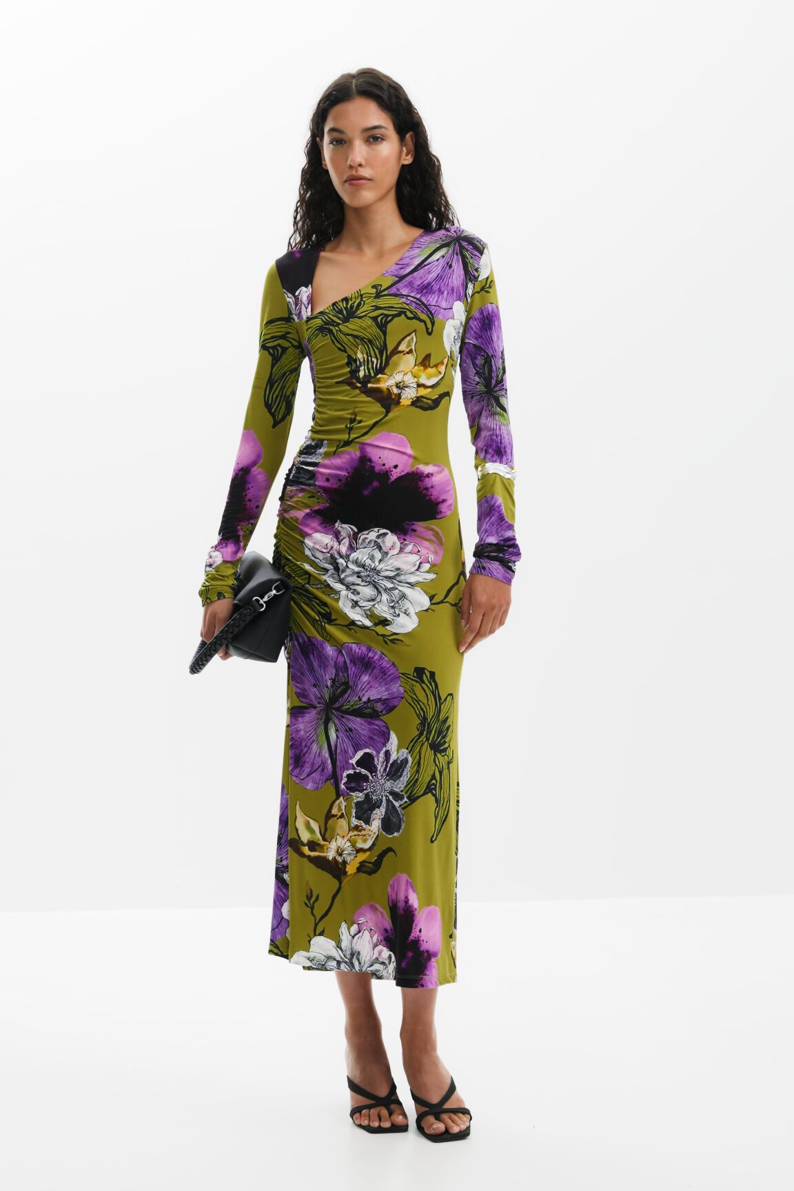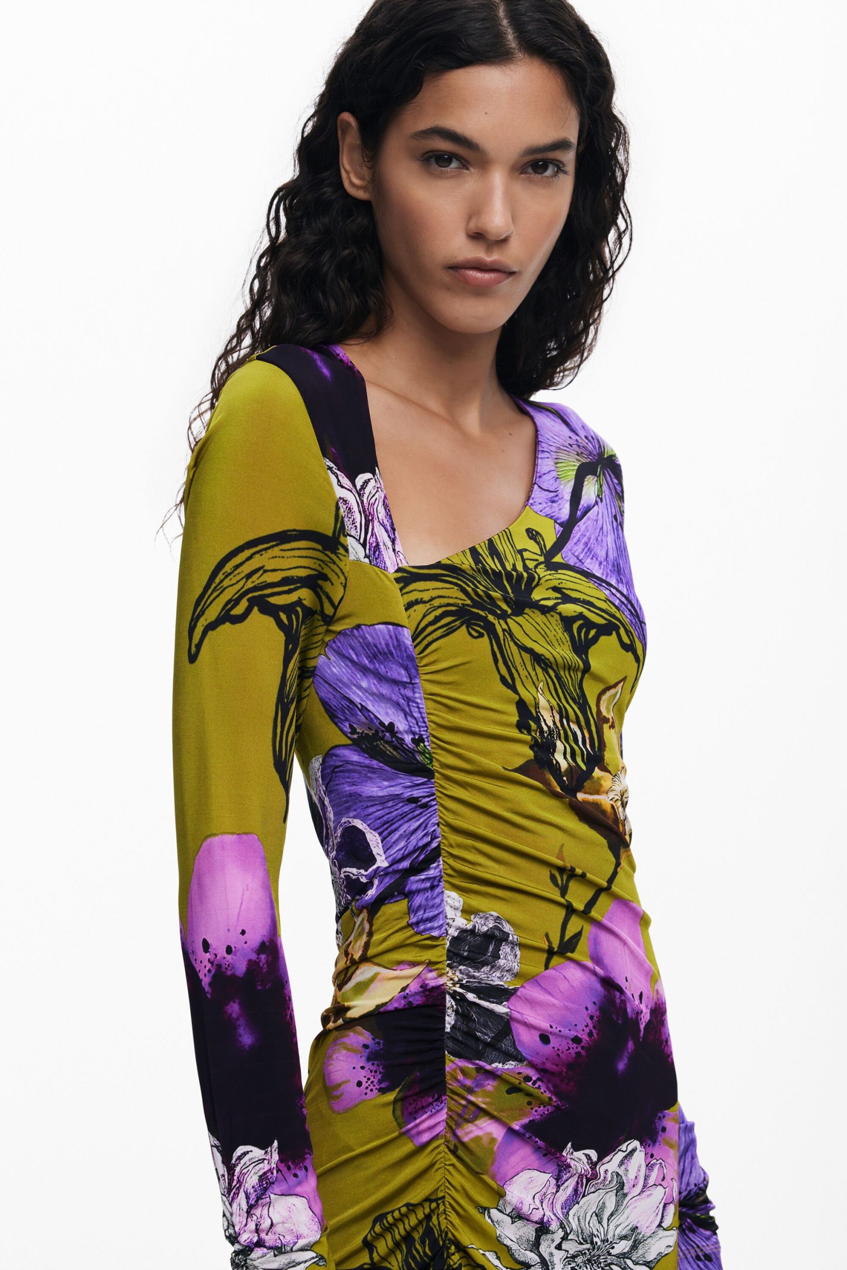 Midi dress, long-sleeved, asymmetric neckline, front ruching, and flared skirt with floral print designed by Monsieur Christian Lacroix.
