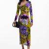 Midi dress, long-sleeved, asymmetric neckline, front ruching, and flared skirt with floral print designed by Monsieur Christian Lacroix.