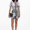 Short marbled dress, with short sleeves, front zipper, lapel collar, and pockets, designed by Monsieur Christian Lacroix.