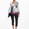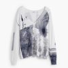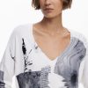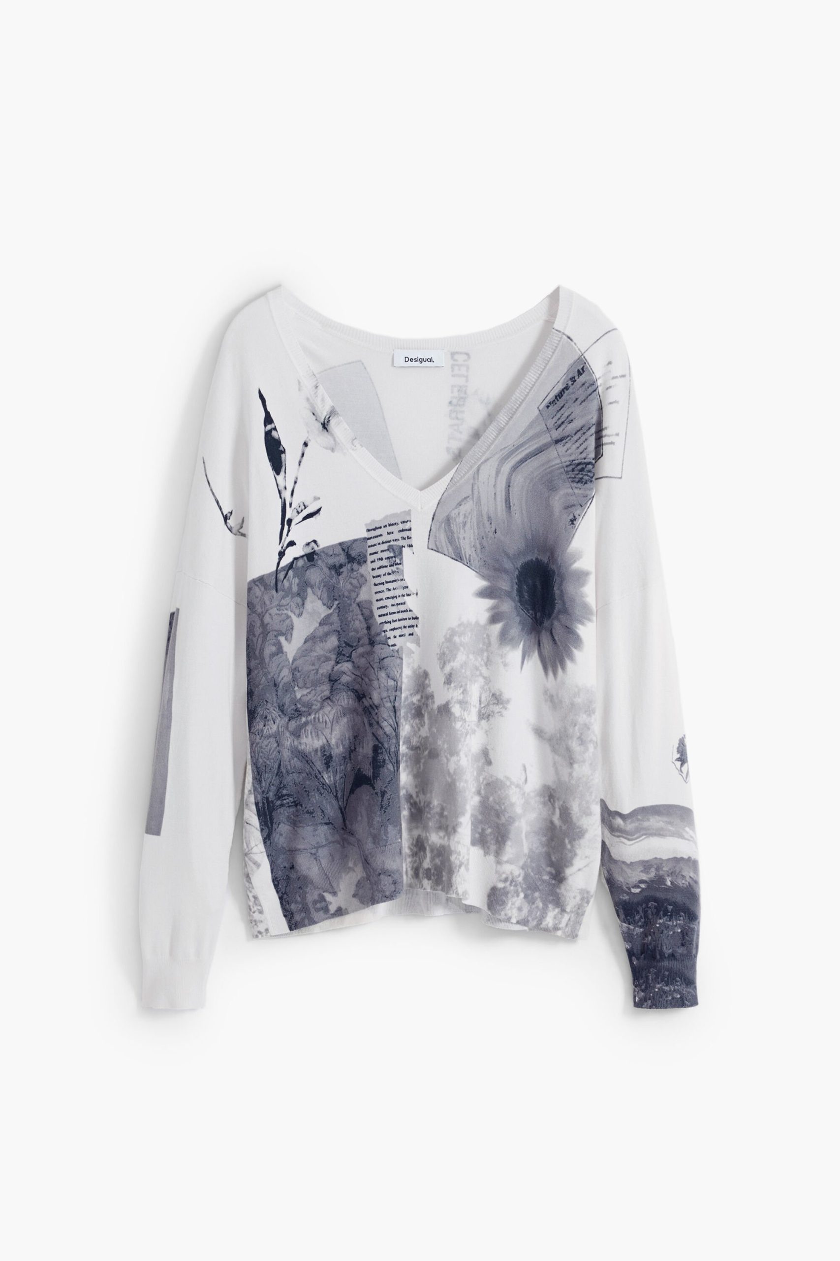 Lightweight sweater with a relaxed fit, long sleeves, and V-neckline, featuring a photo collage-style print.