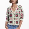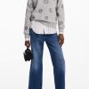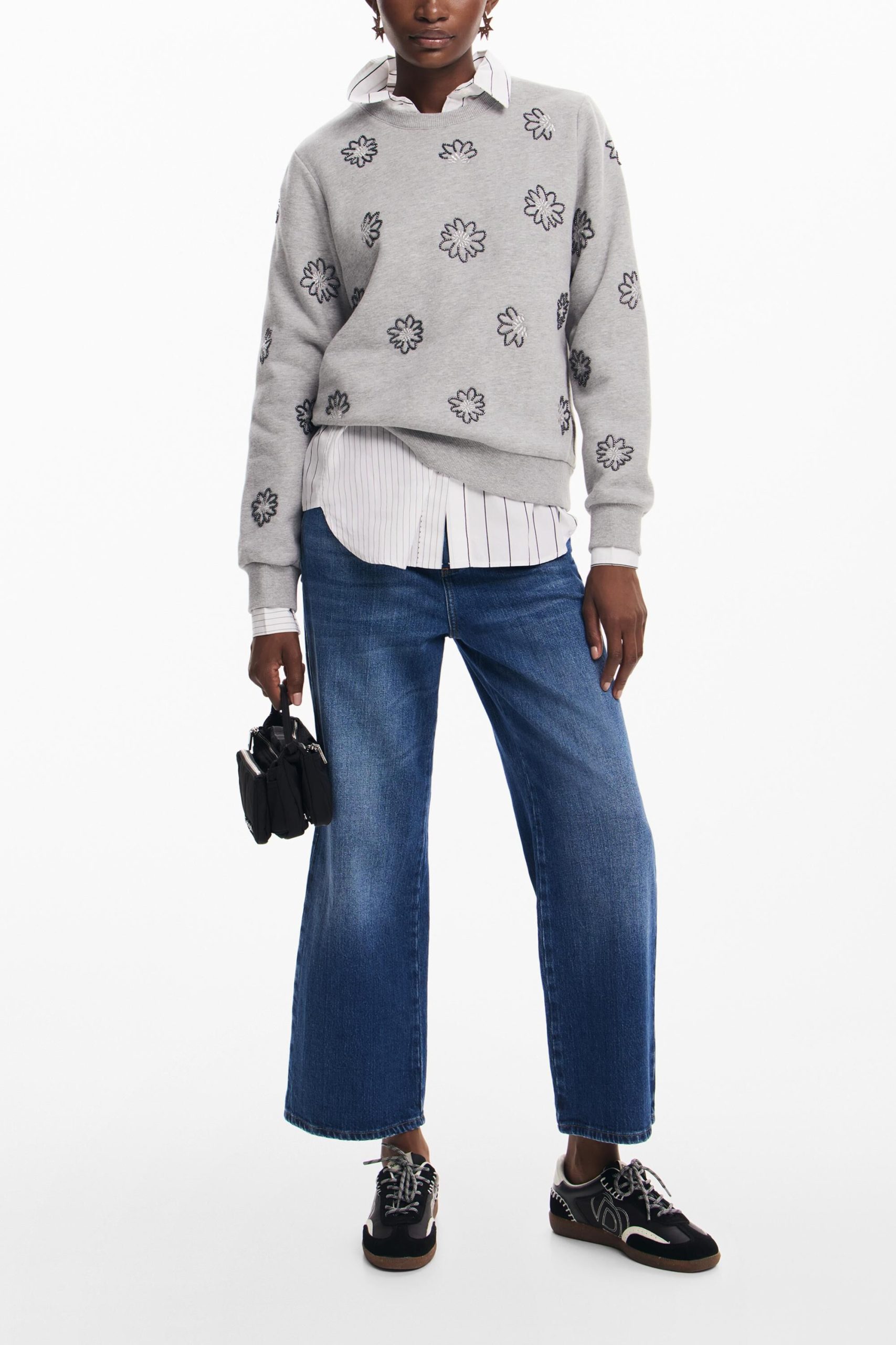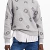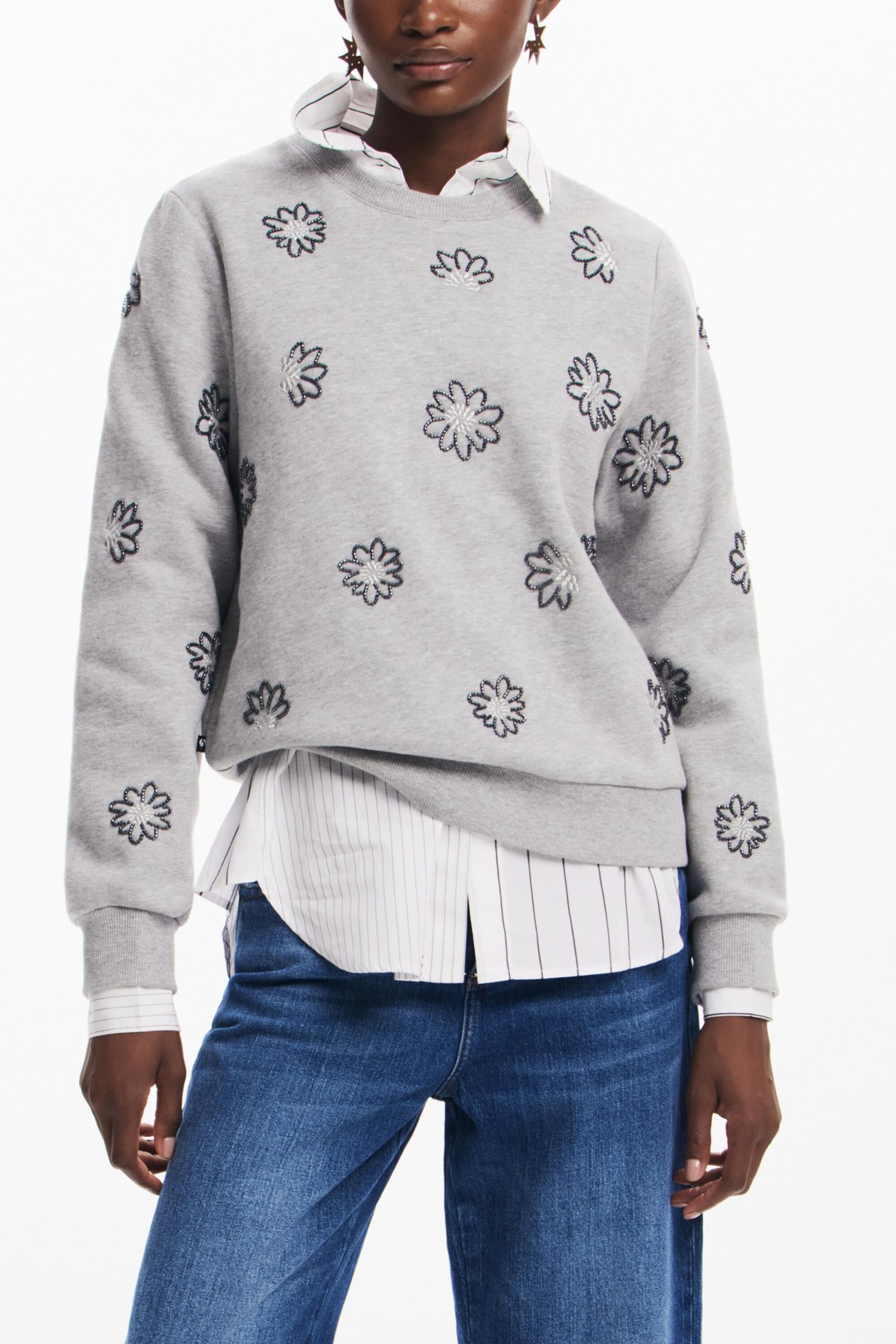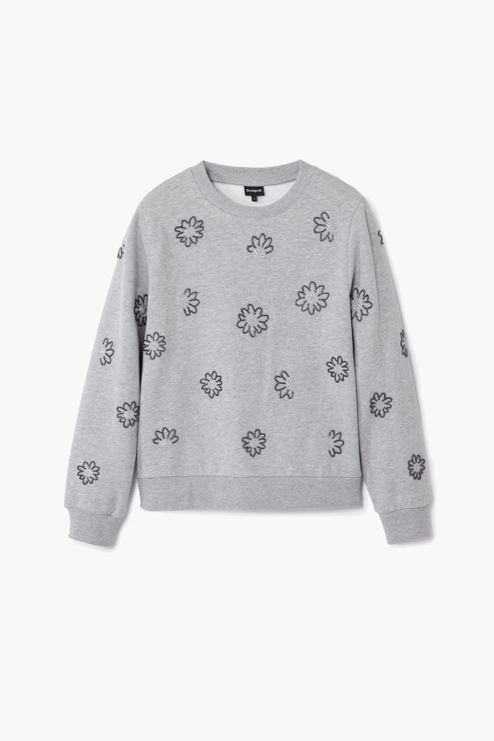 Knit sweatshirt, long sleeves, round neck, ribbed hem, and jewel flower print