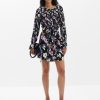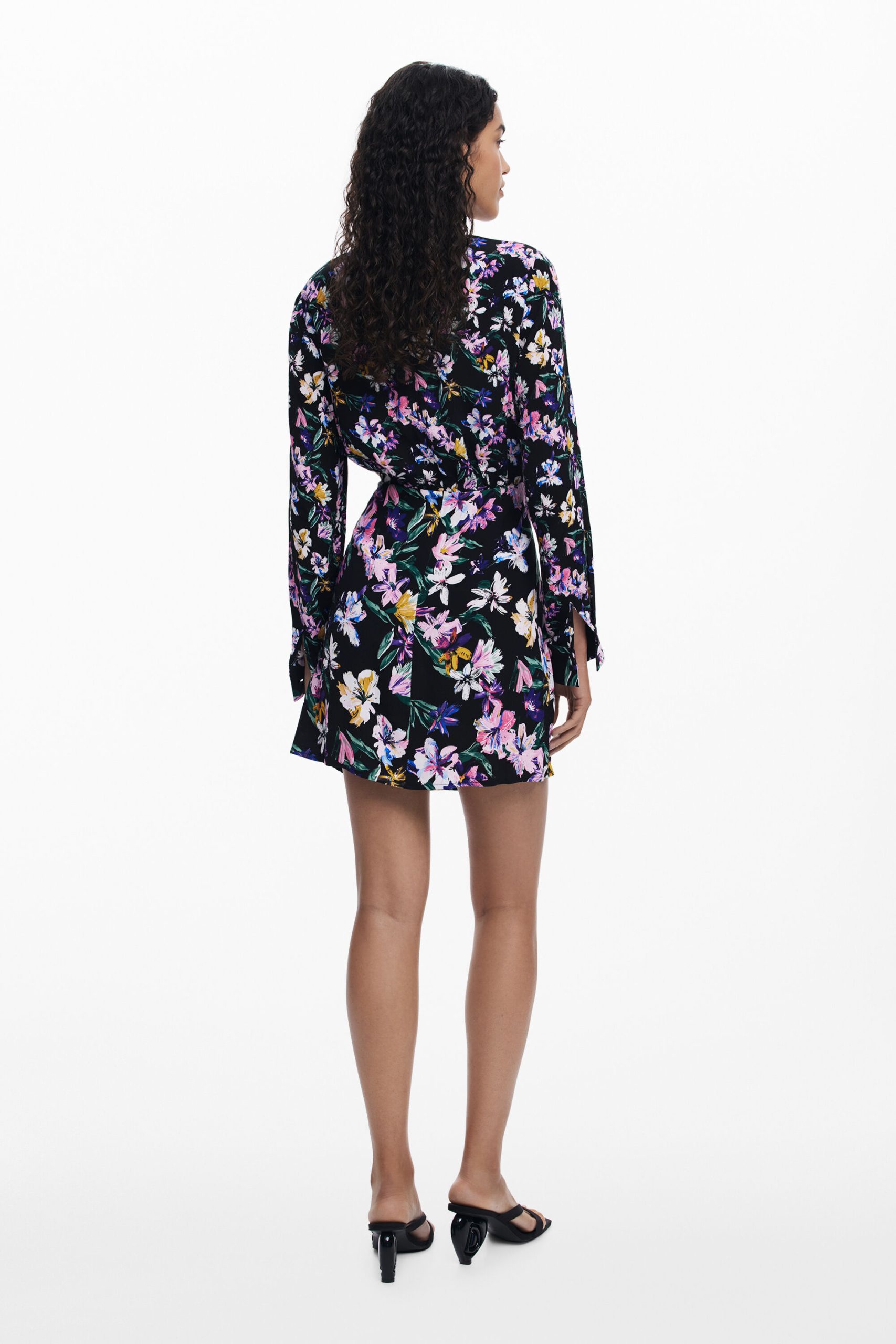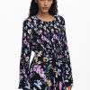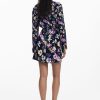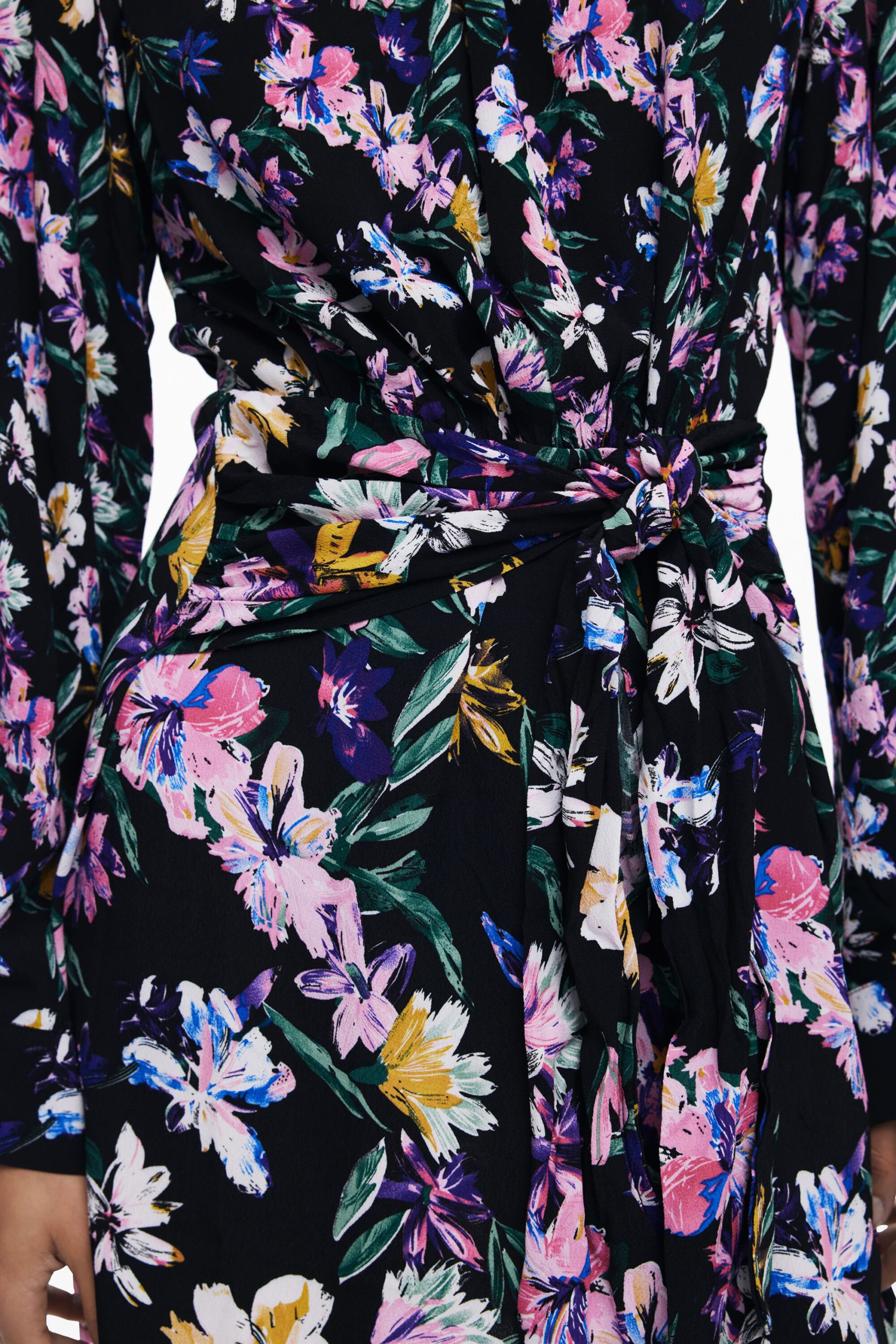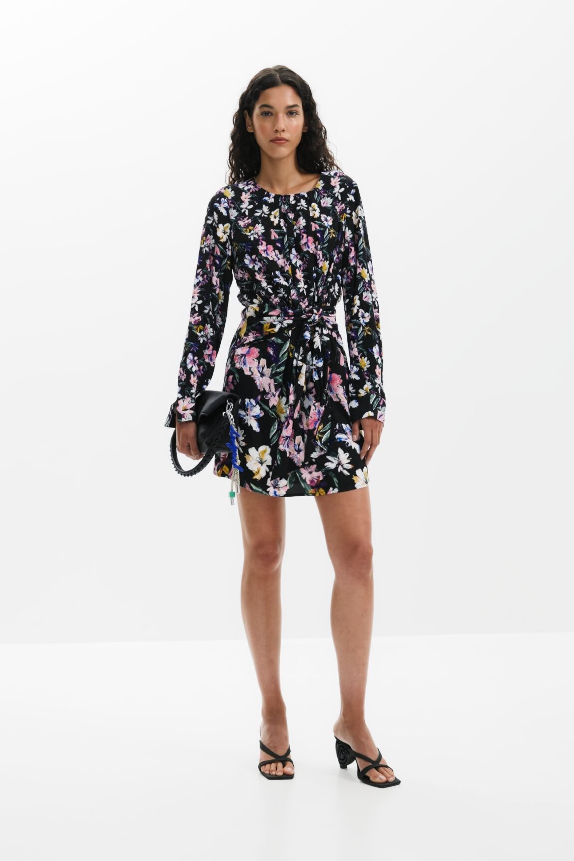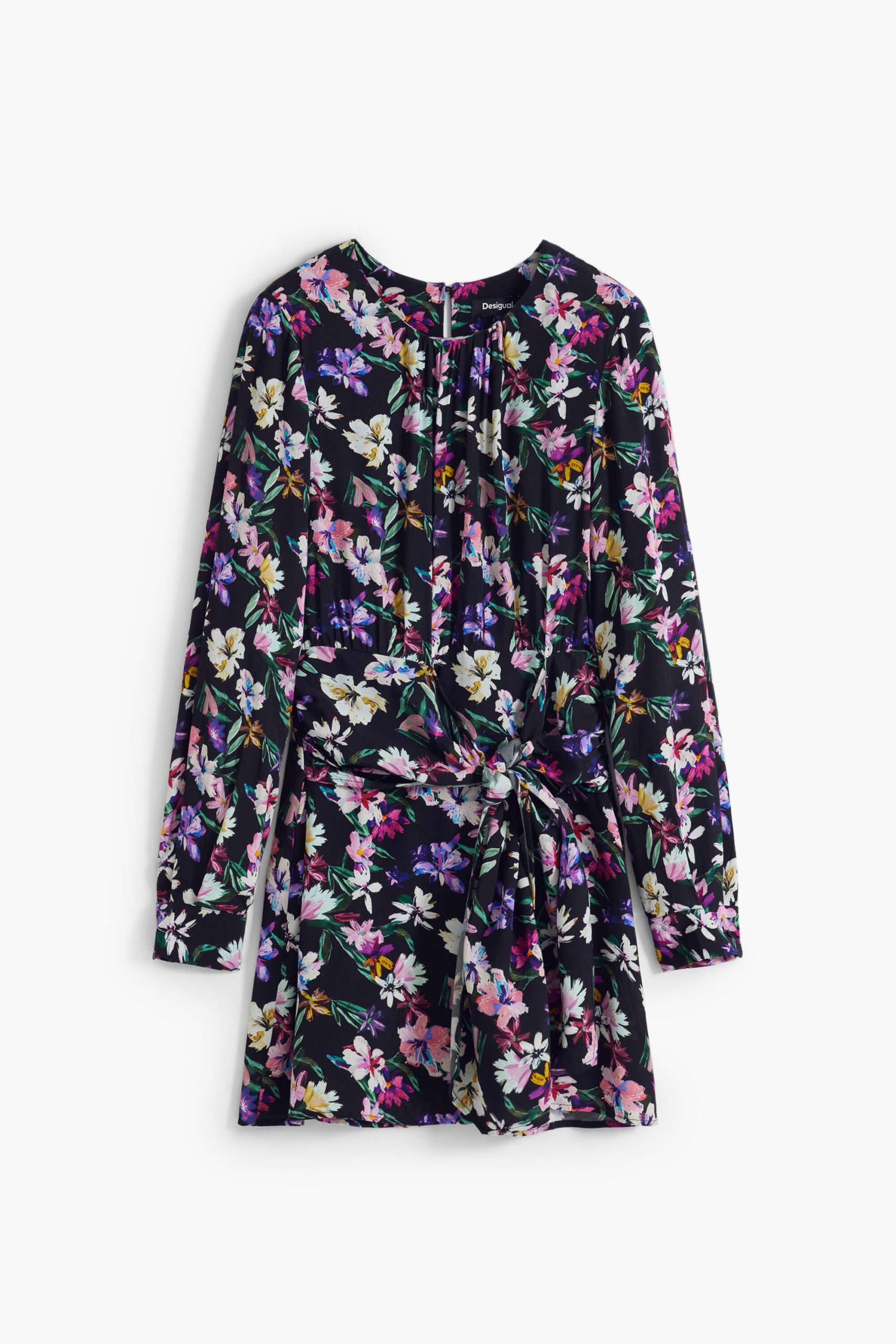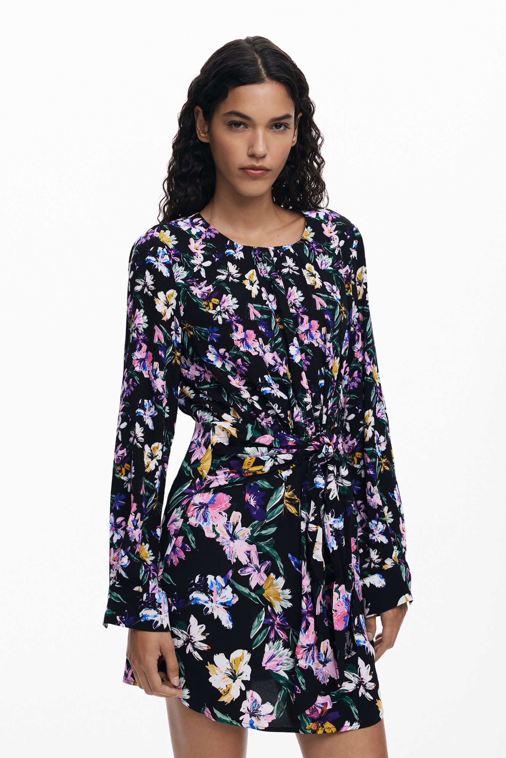Short dress with long sleeves, round neck, knot detail at the waist, and floral print.