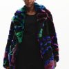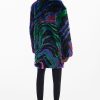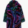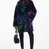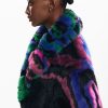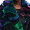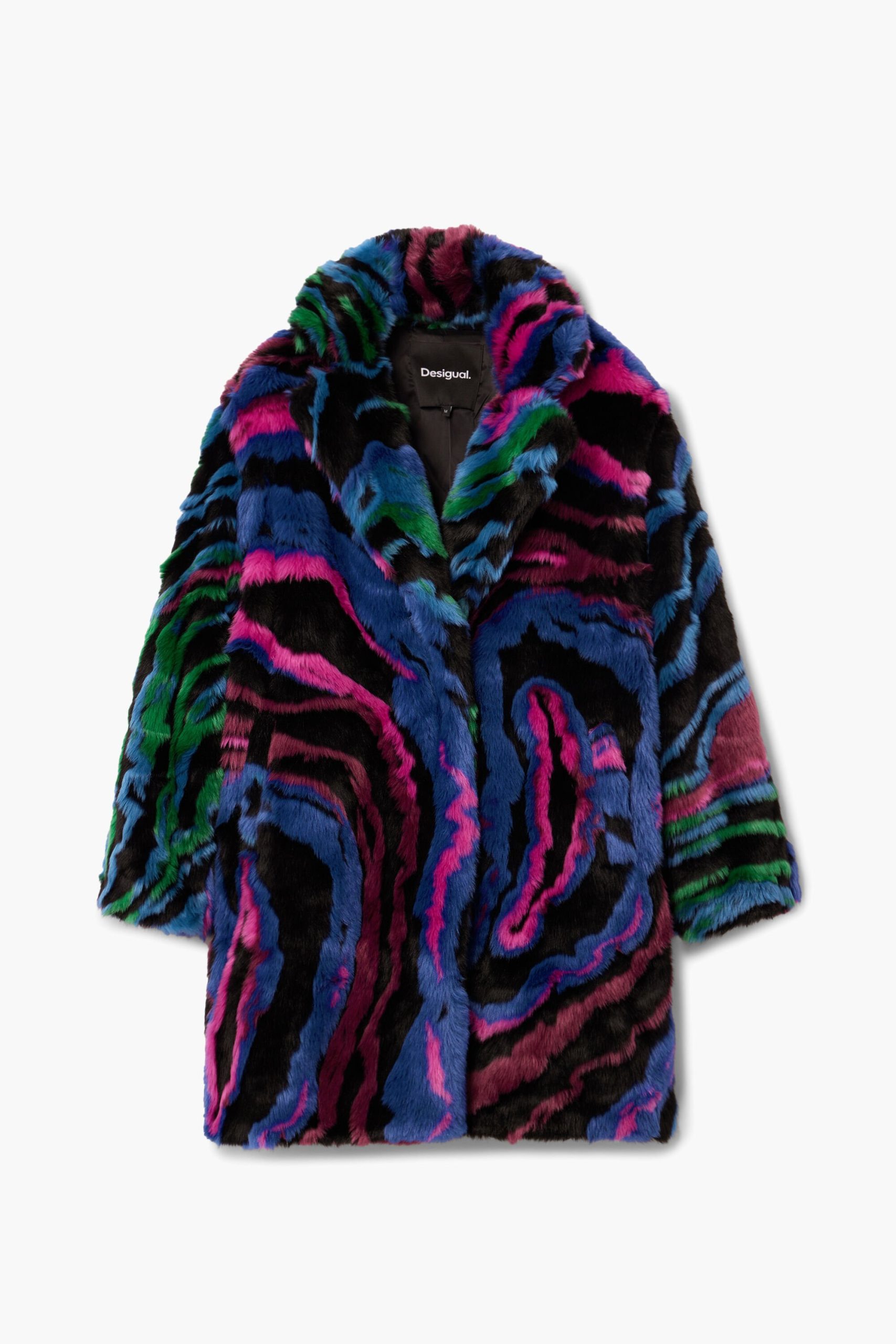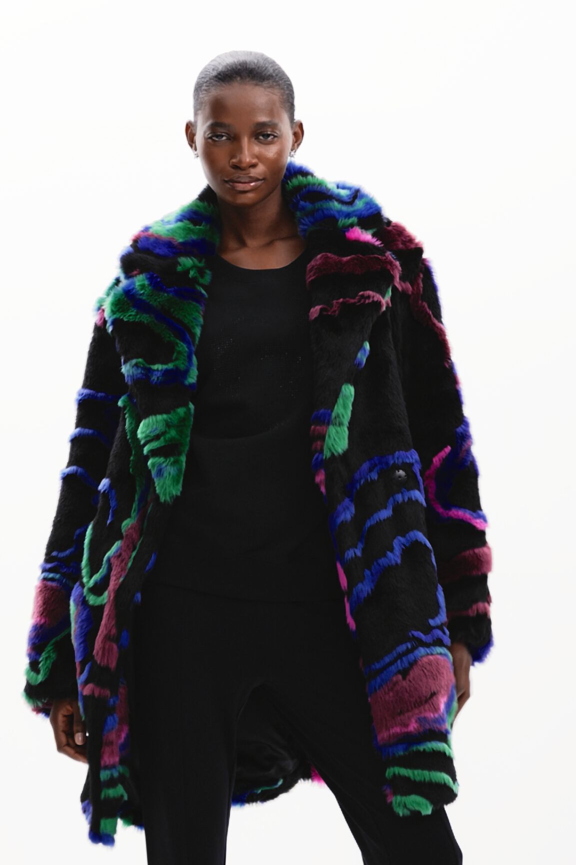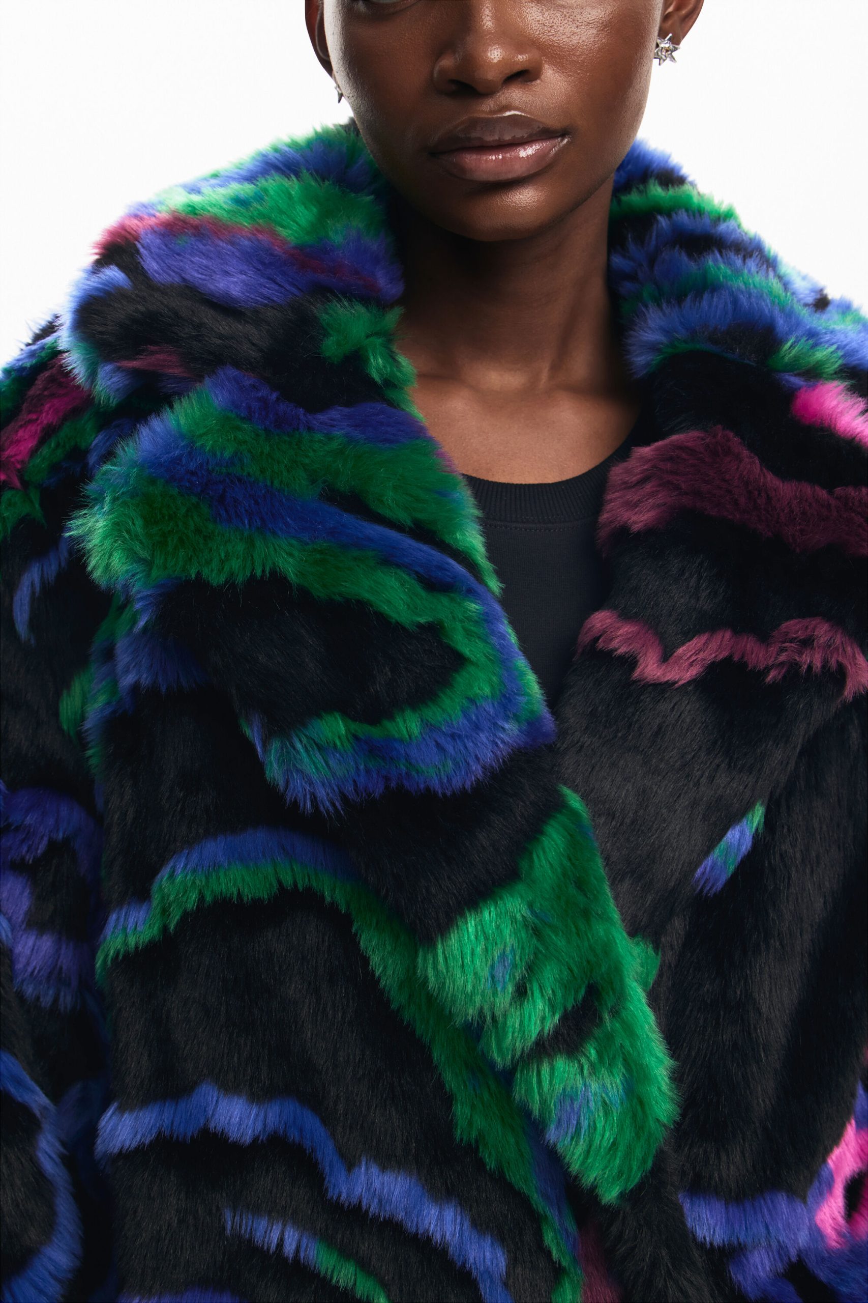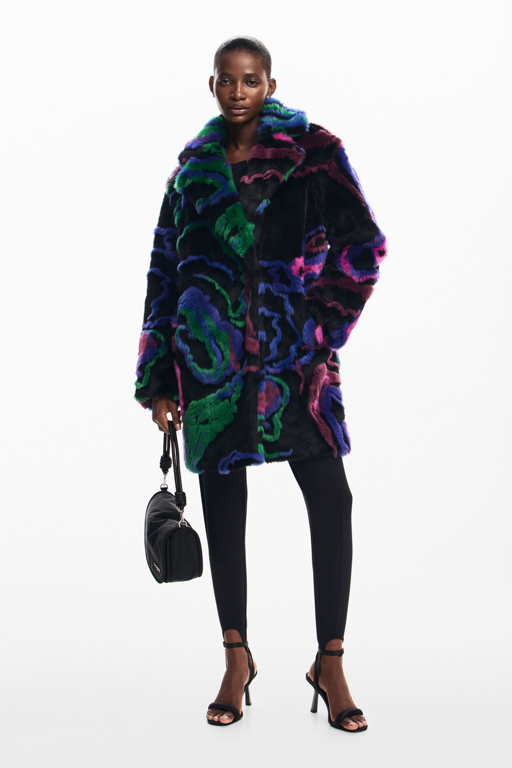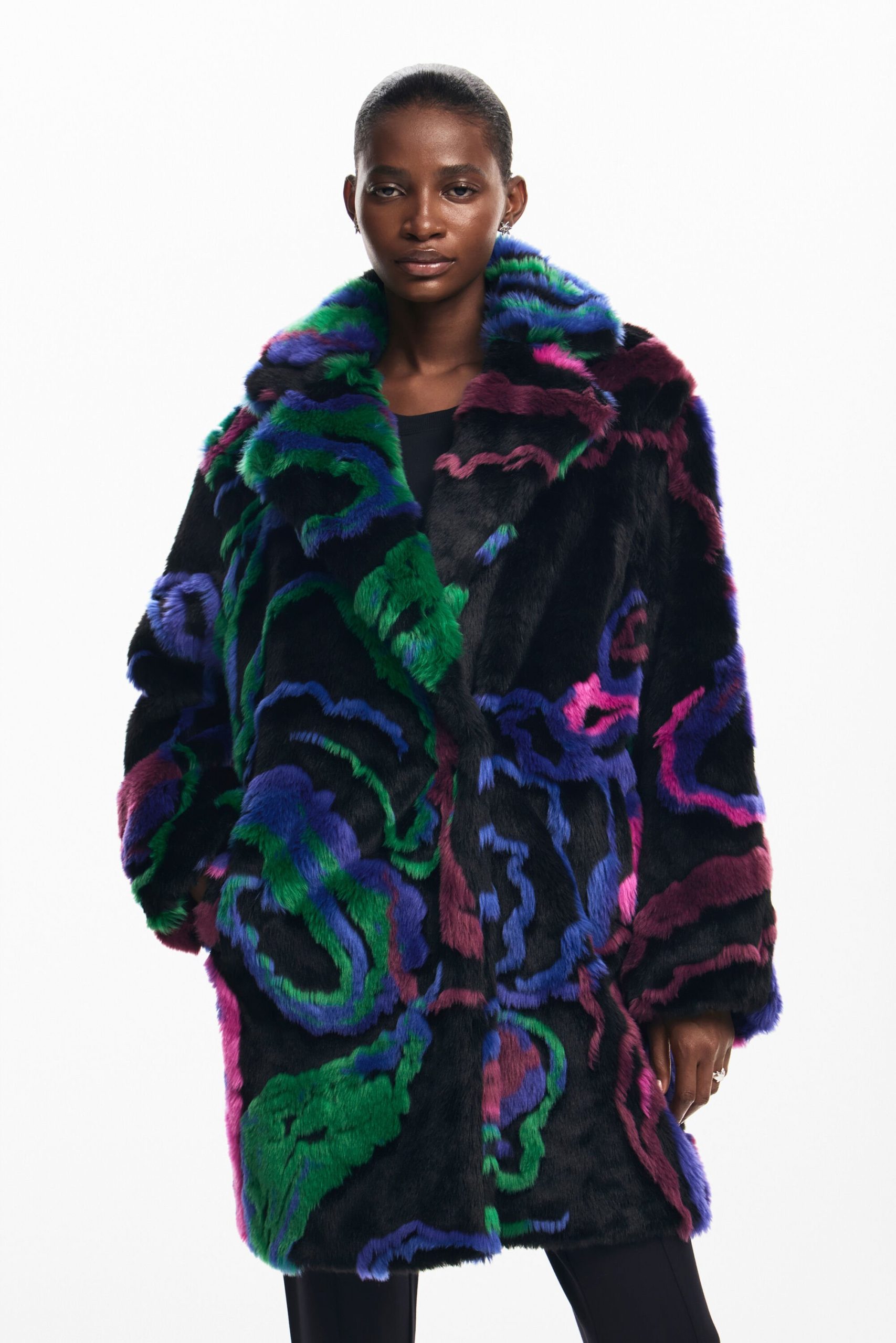 Fur coat with V-neck, snap closure, and colorful Arty print