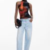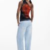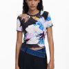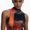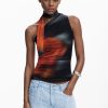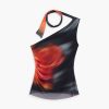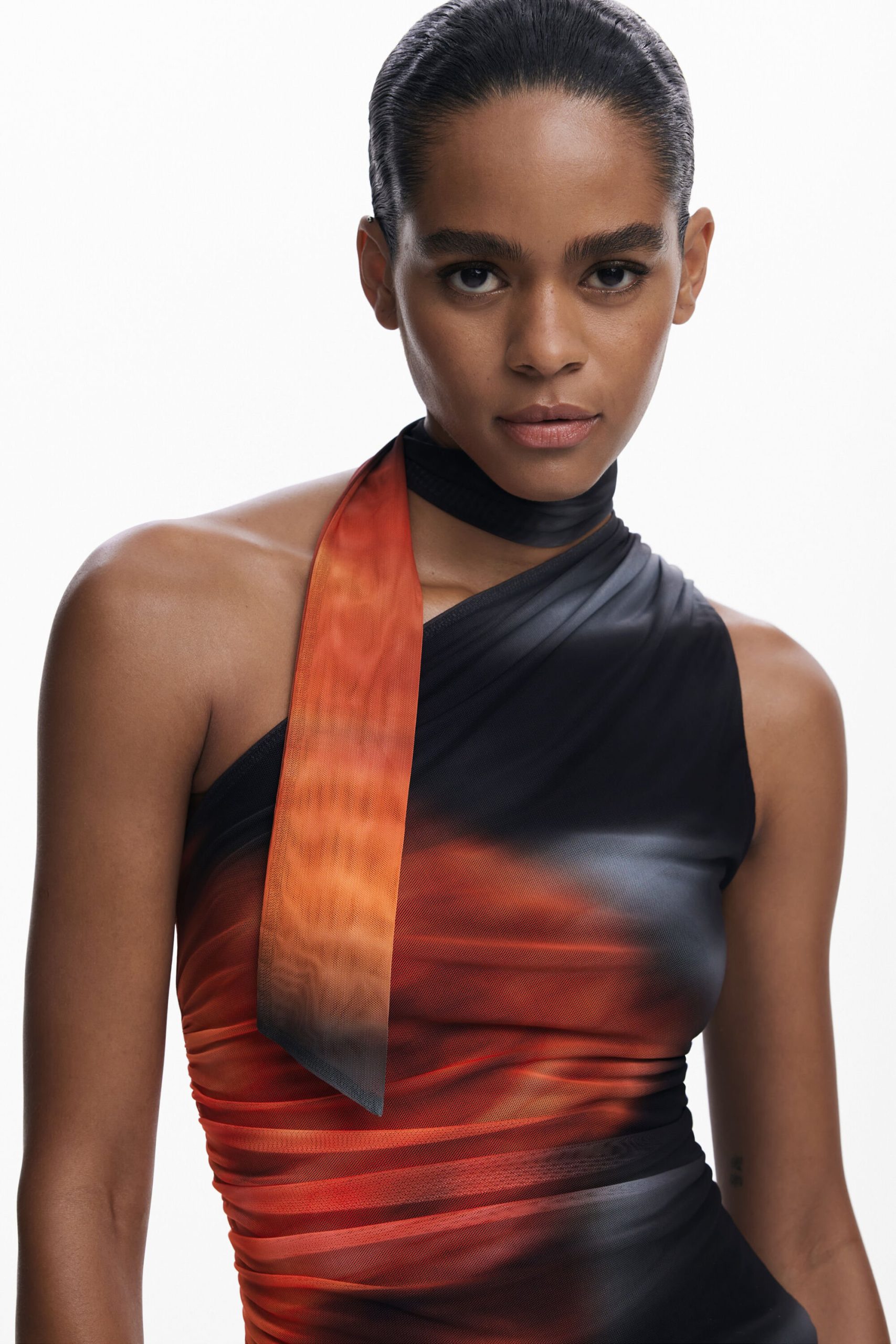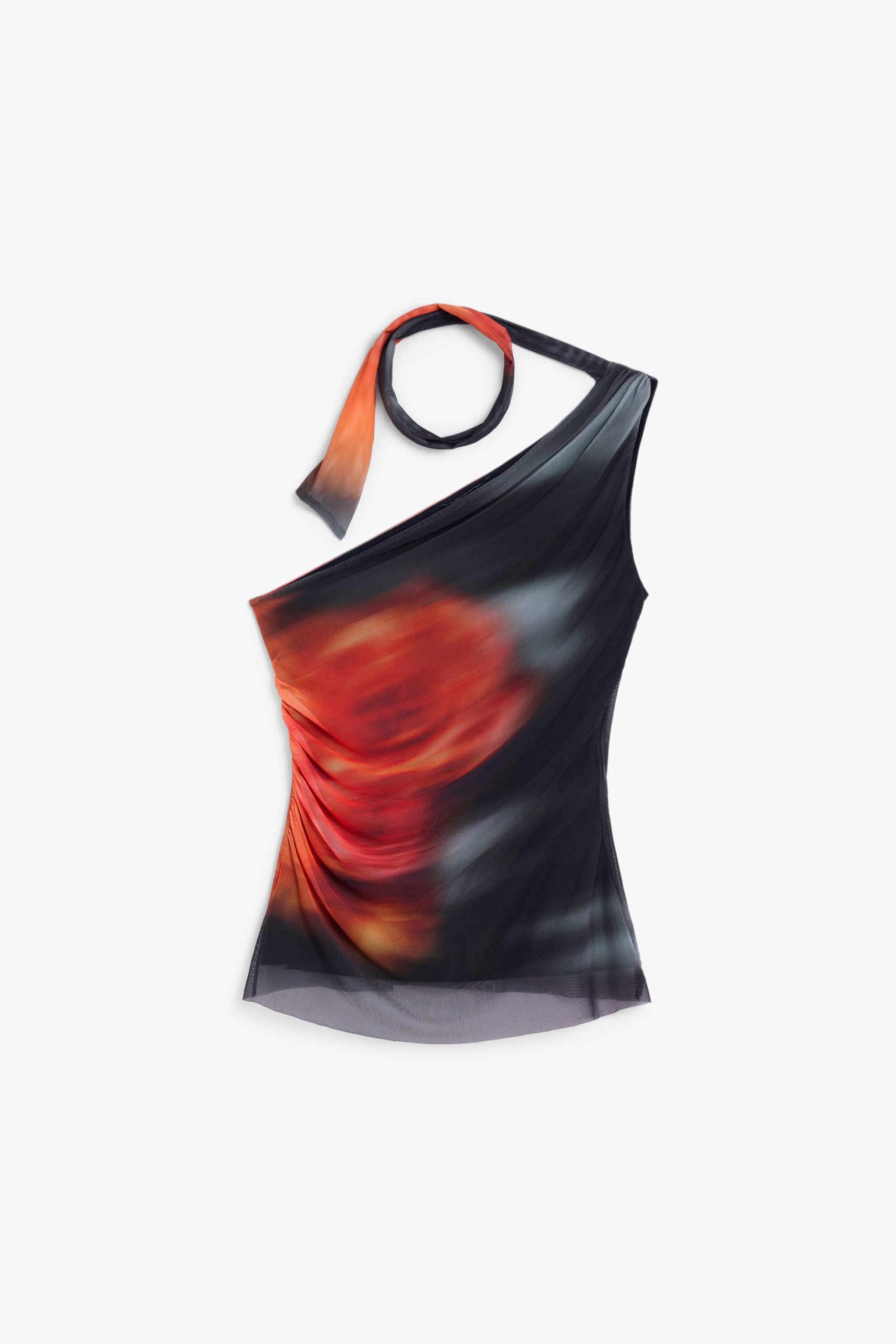 Sleeveless tulle top with front draping, asymmetric neckline with knot, and blurred large flower print.