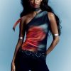 Sleeveless tulle top with front draping, asymmetric neckline with knot, and blurred large flower print.