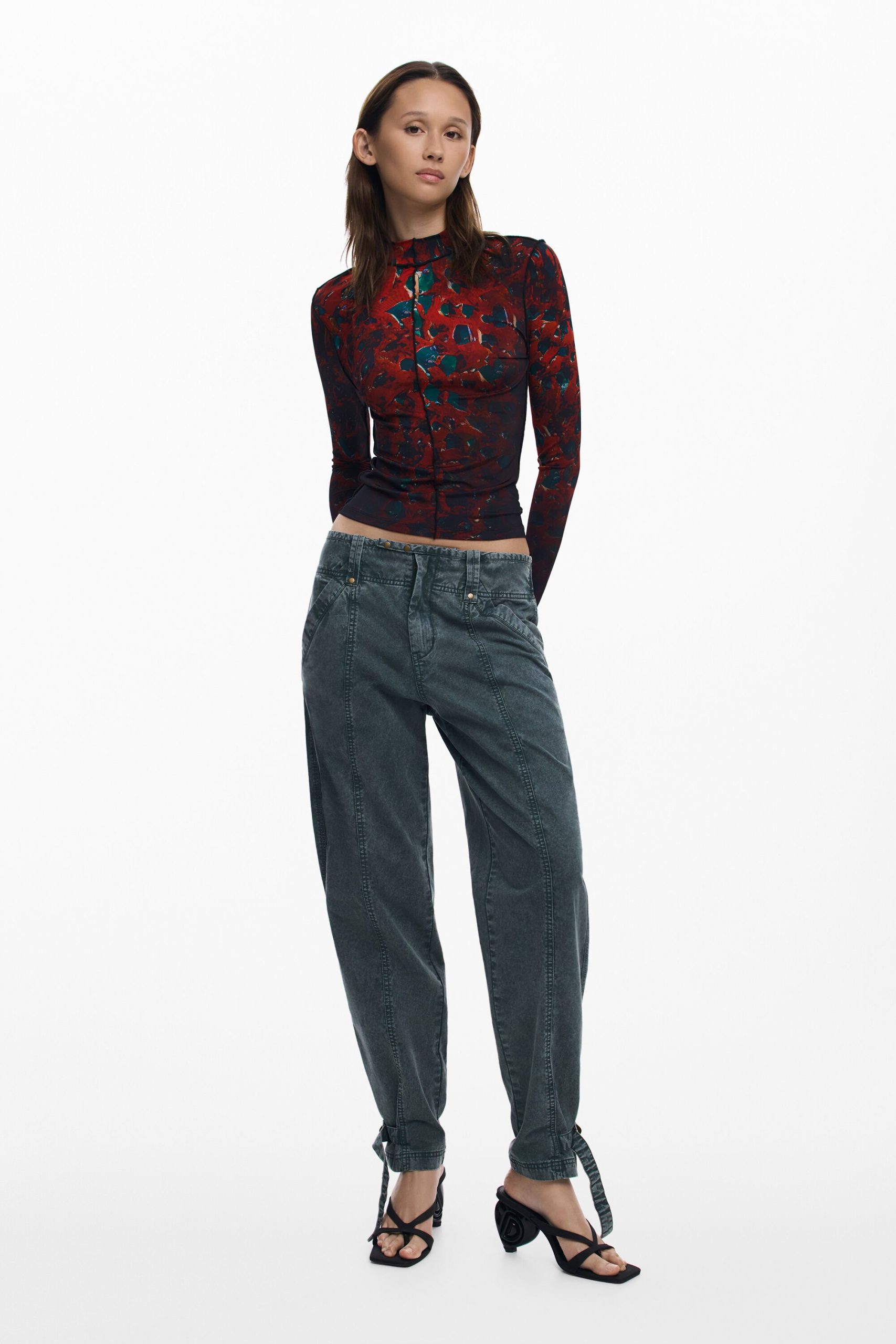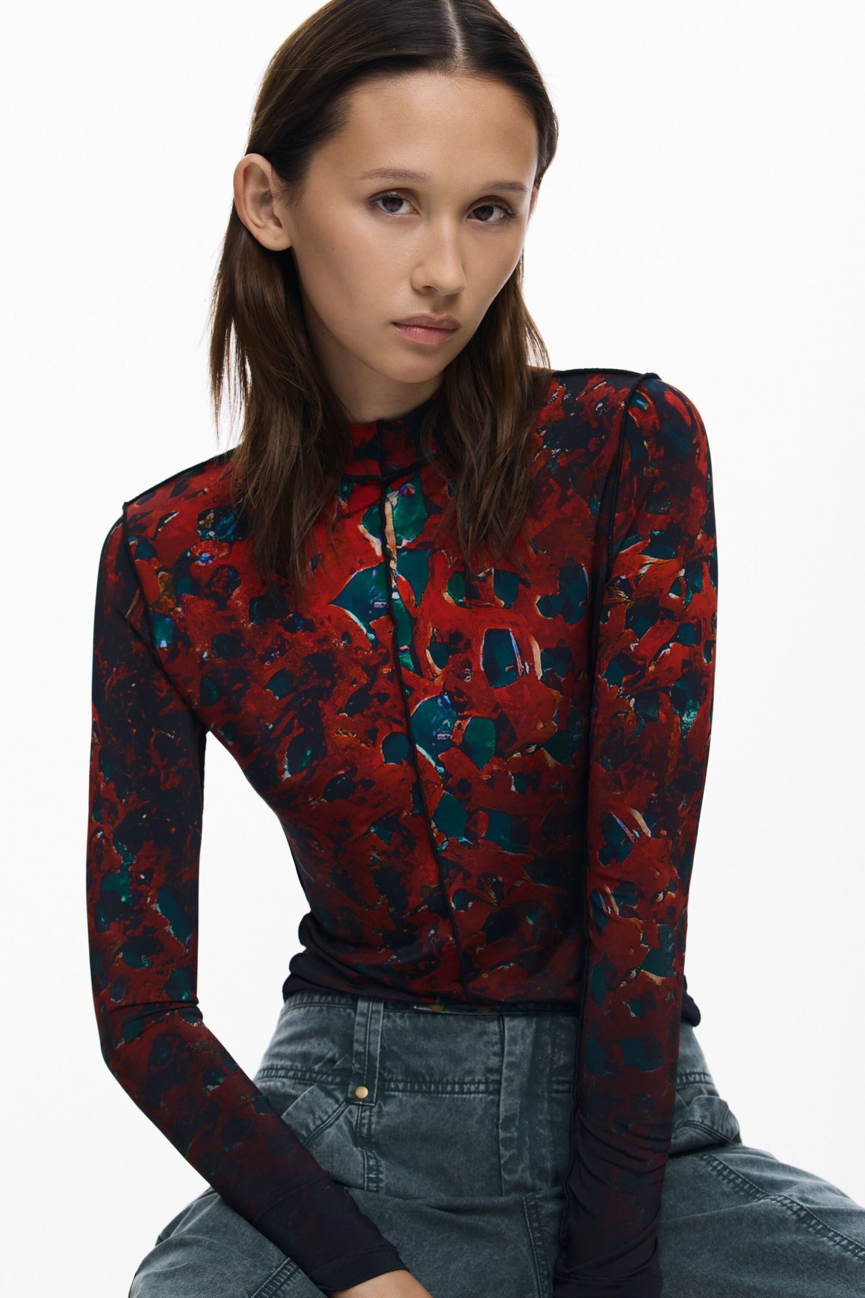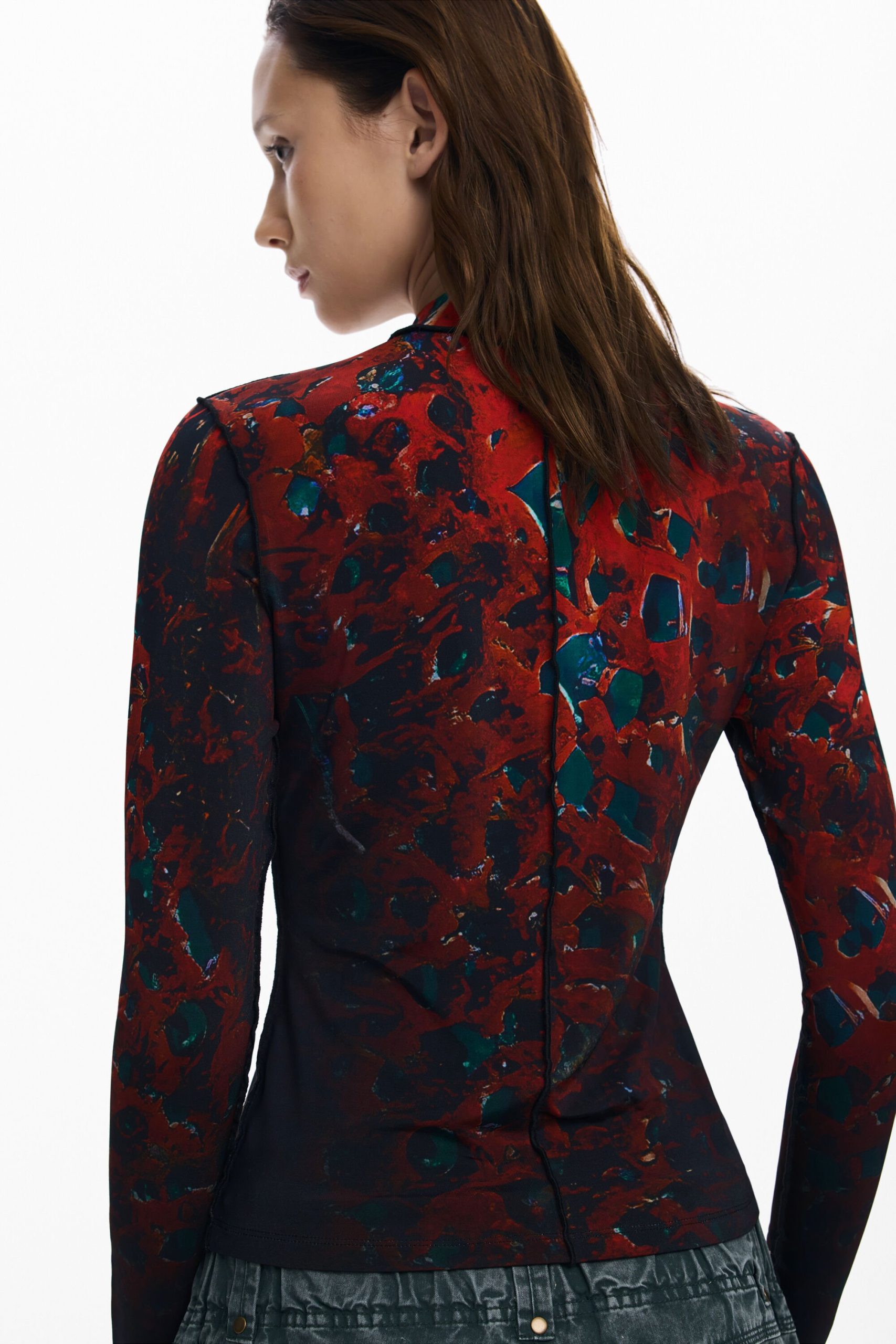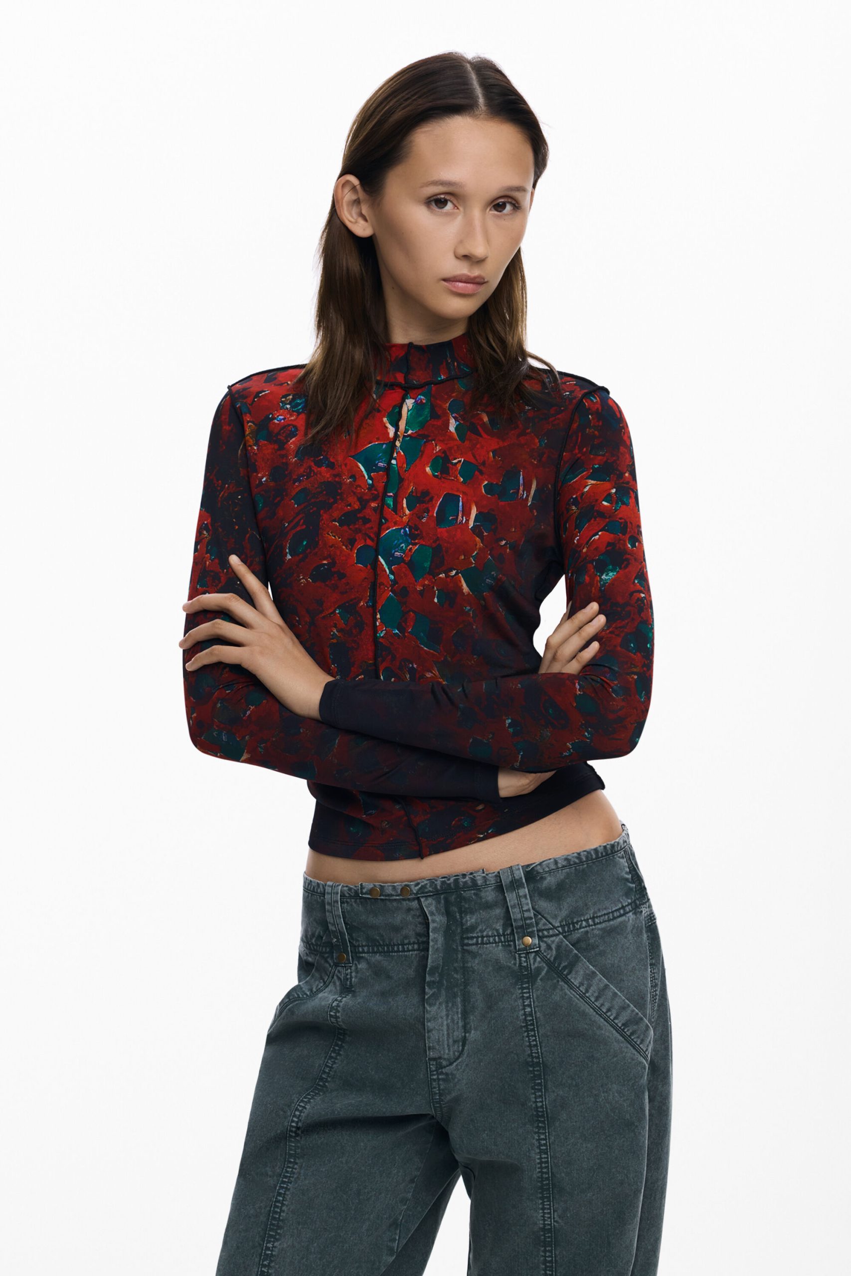 Long-sleeve T-shirt, regular fit, decorative stitching, and autumn-inspired leaf print.