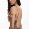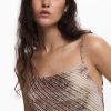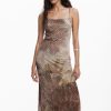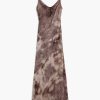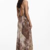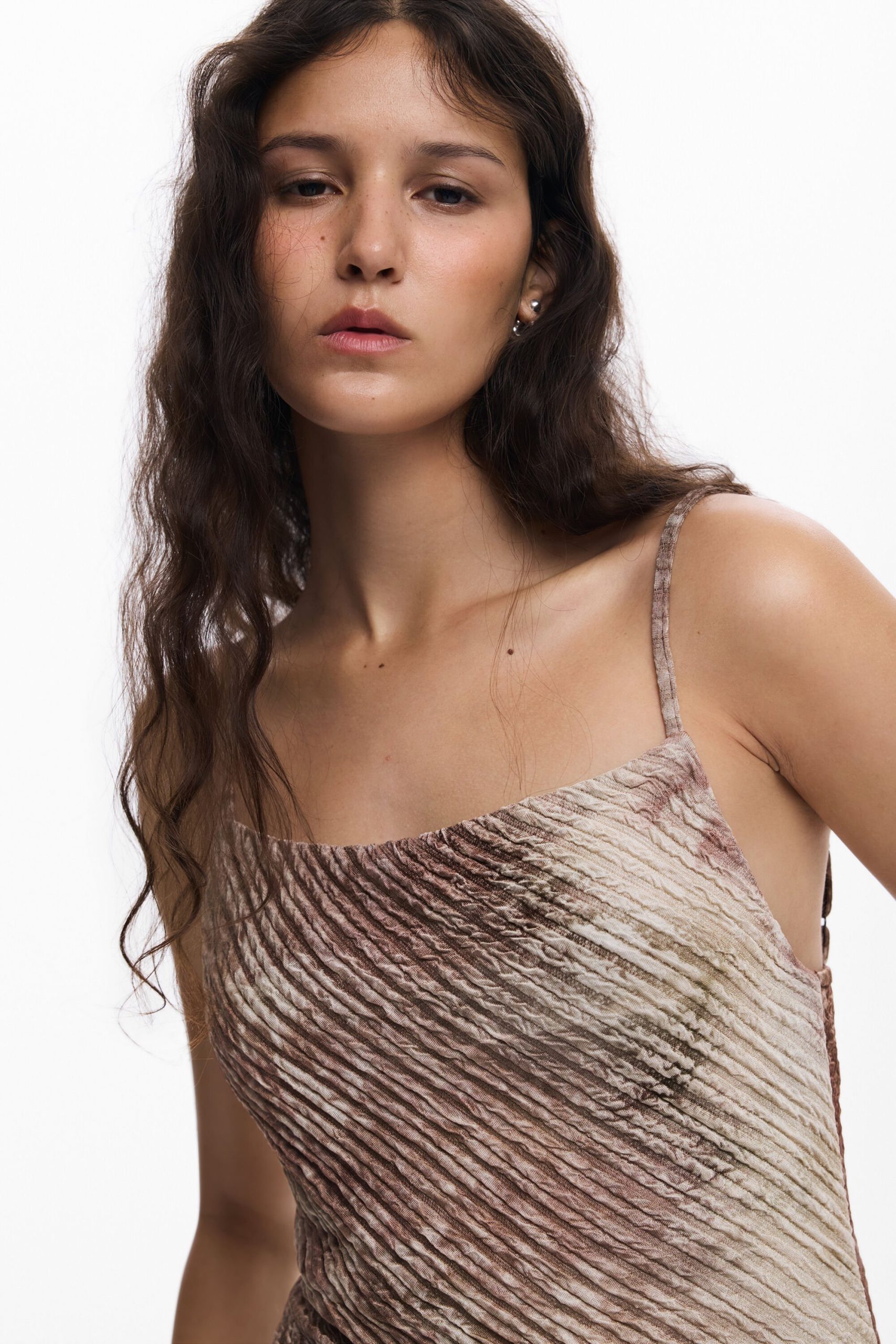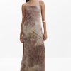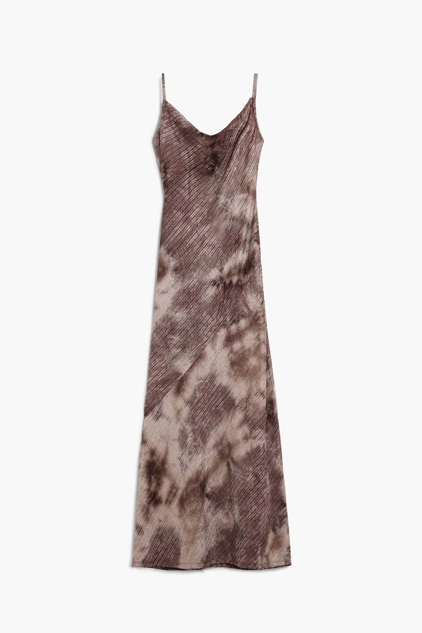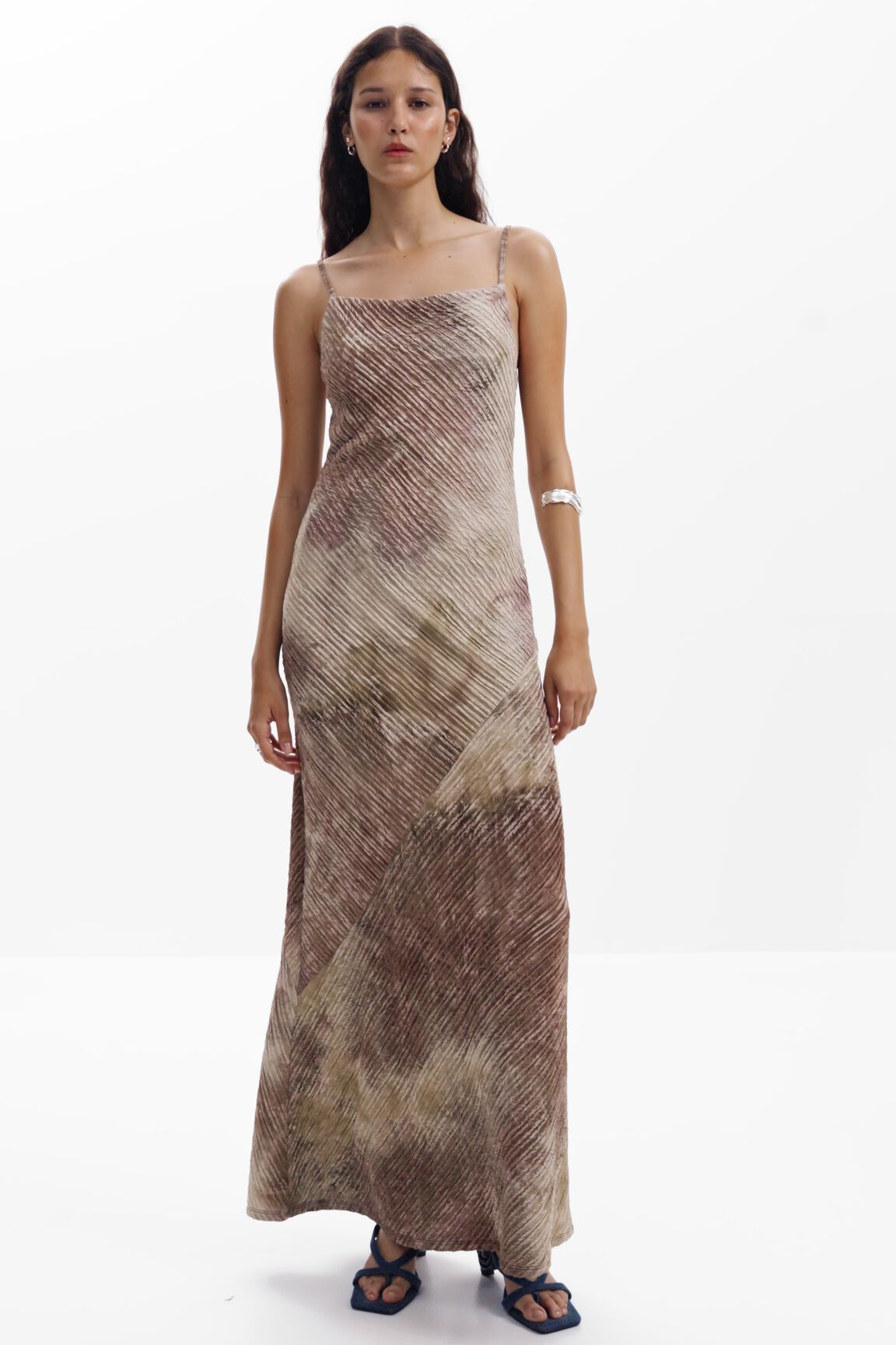 Long fitted dress with adjustable straps, V-neckline, and abstract gradient print.