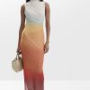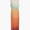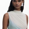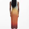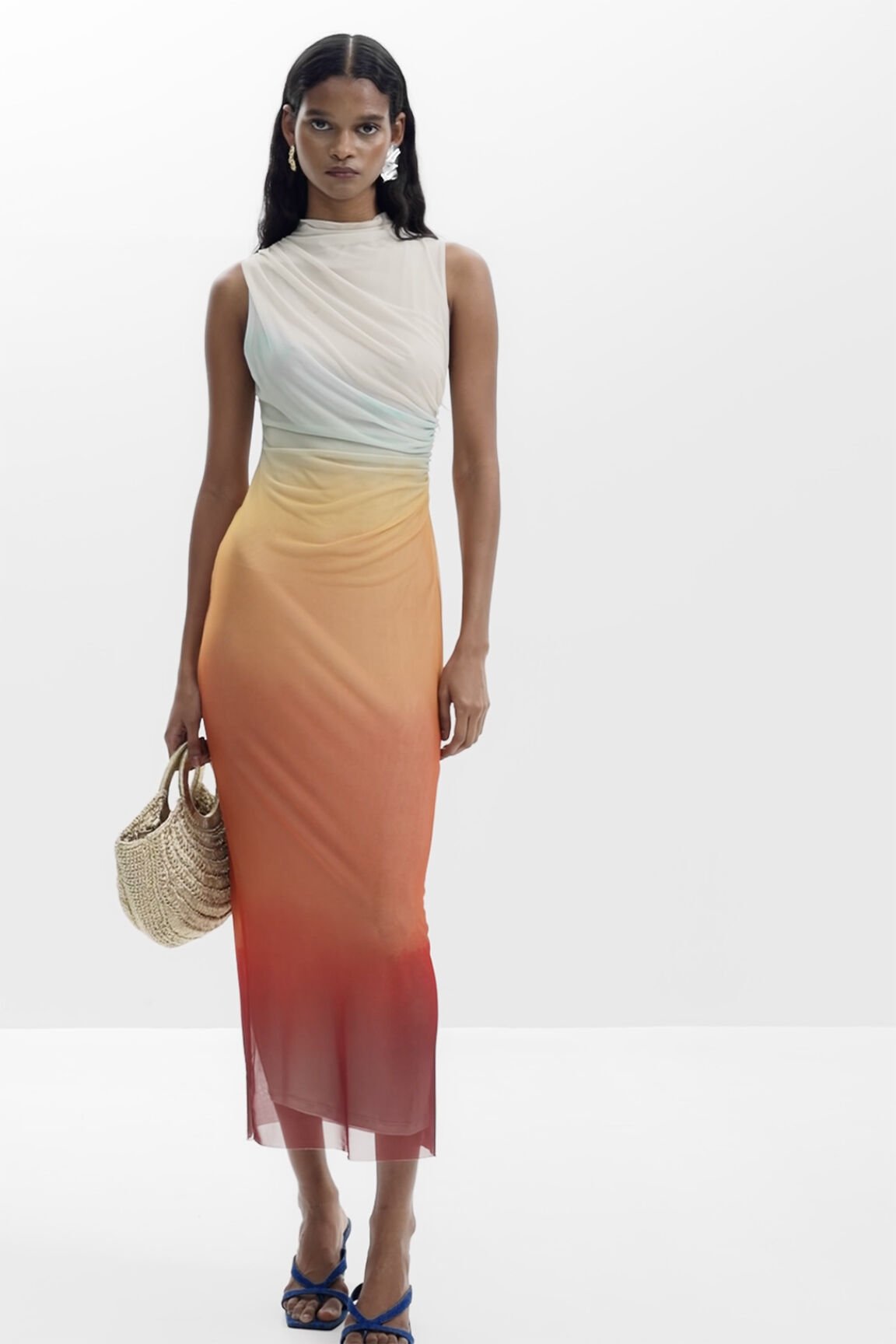 Midi dress in tulle, sleeveless, round neck and front draping with color gradient.