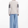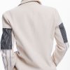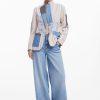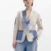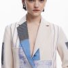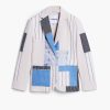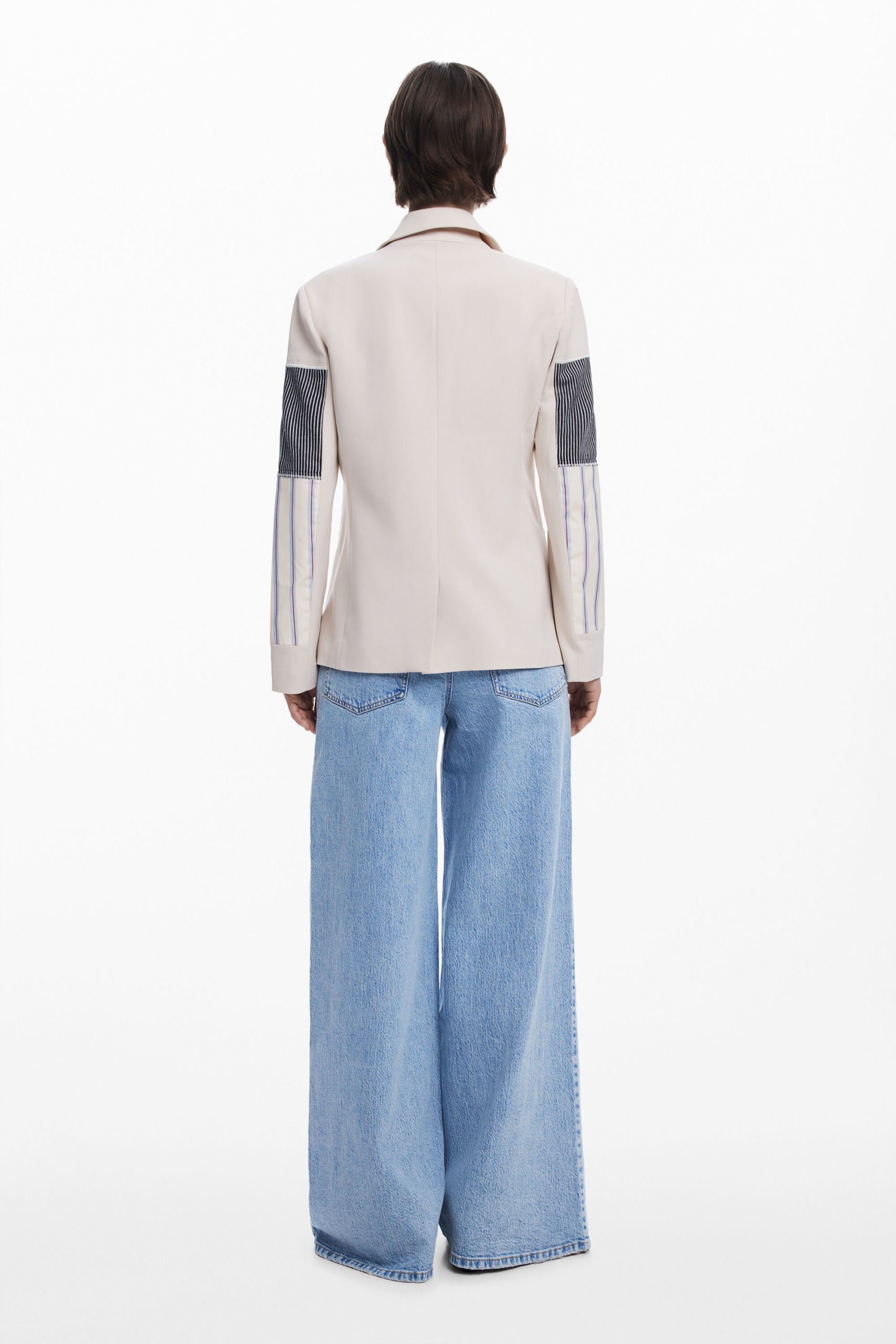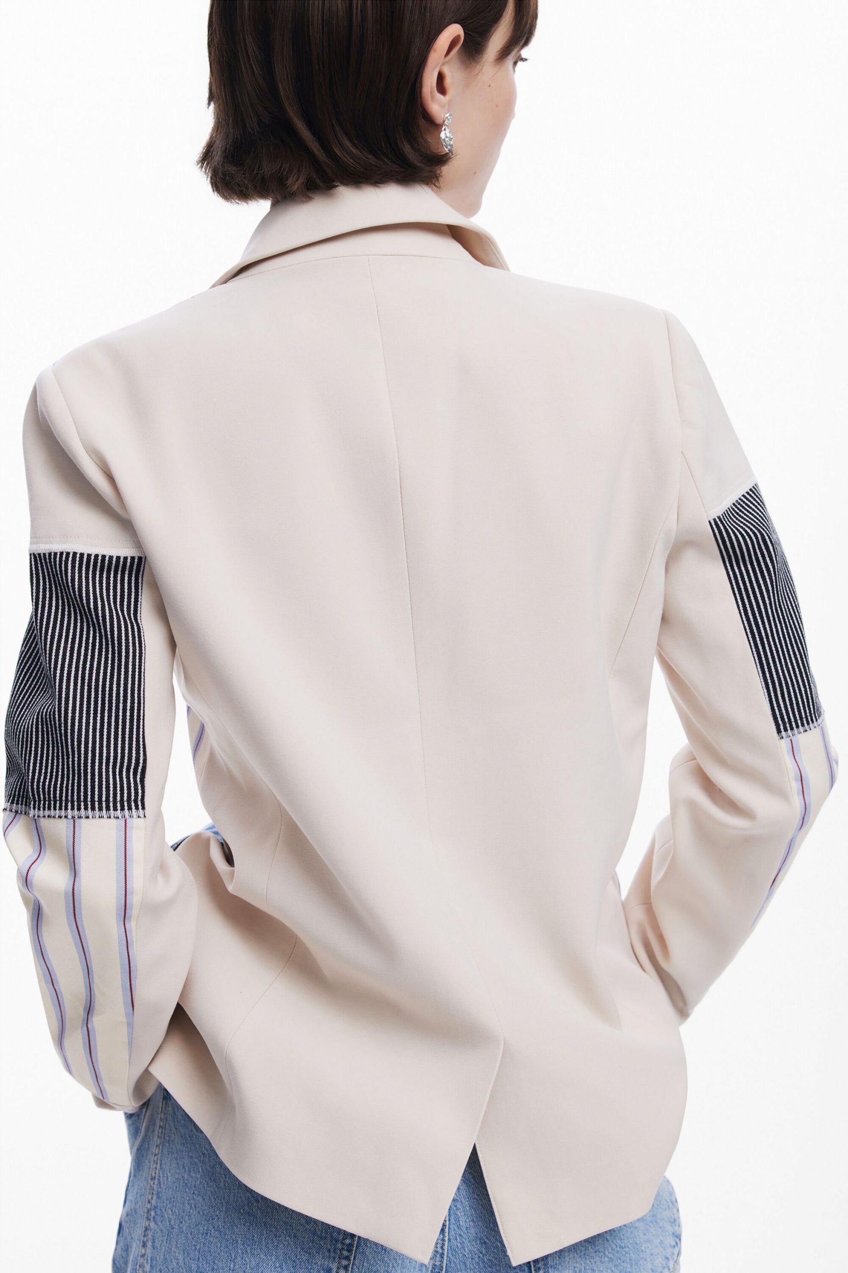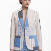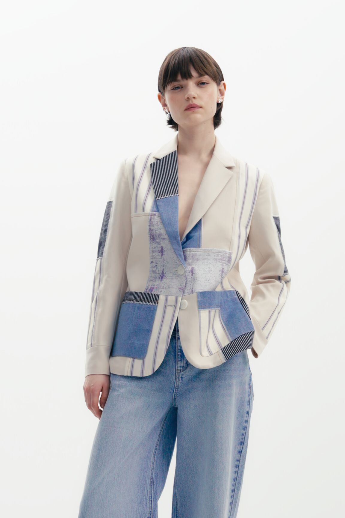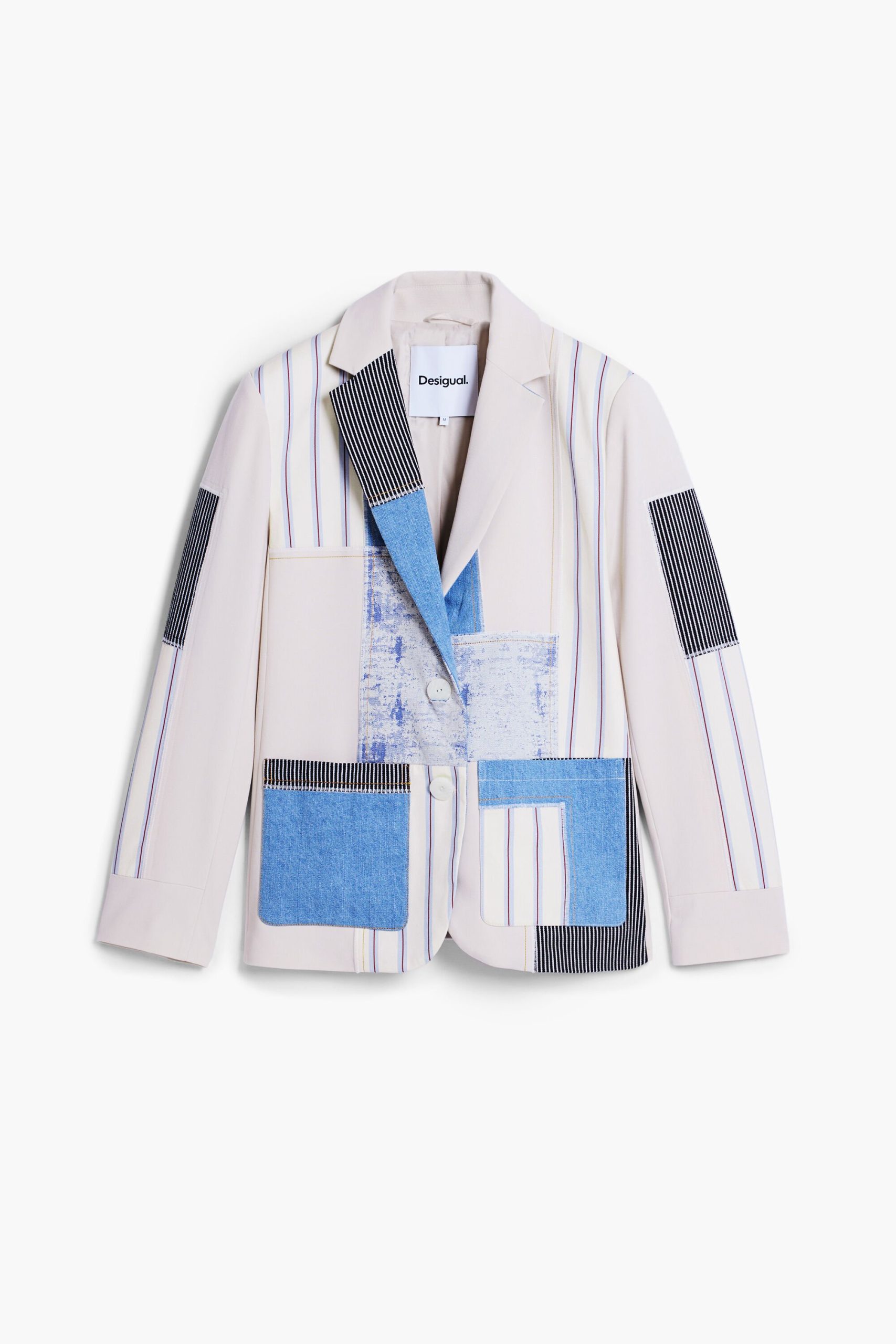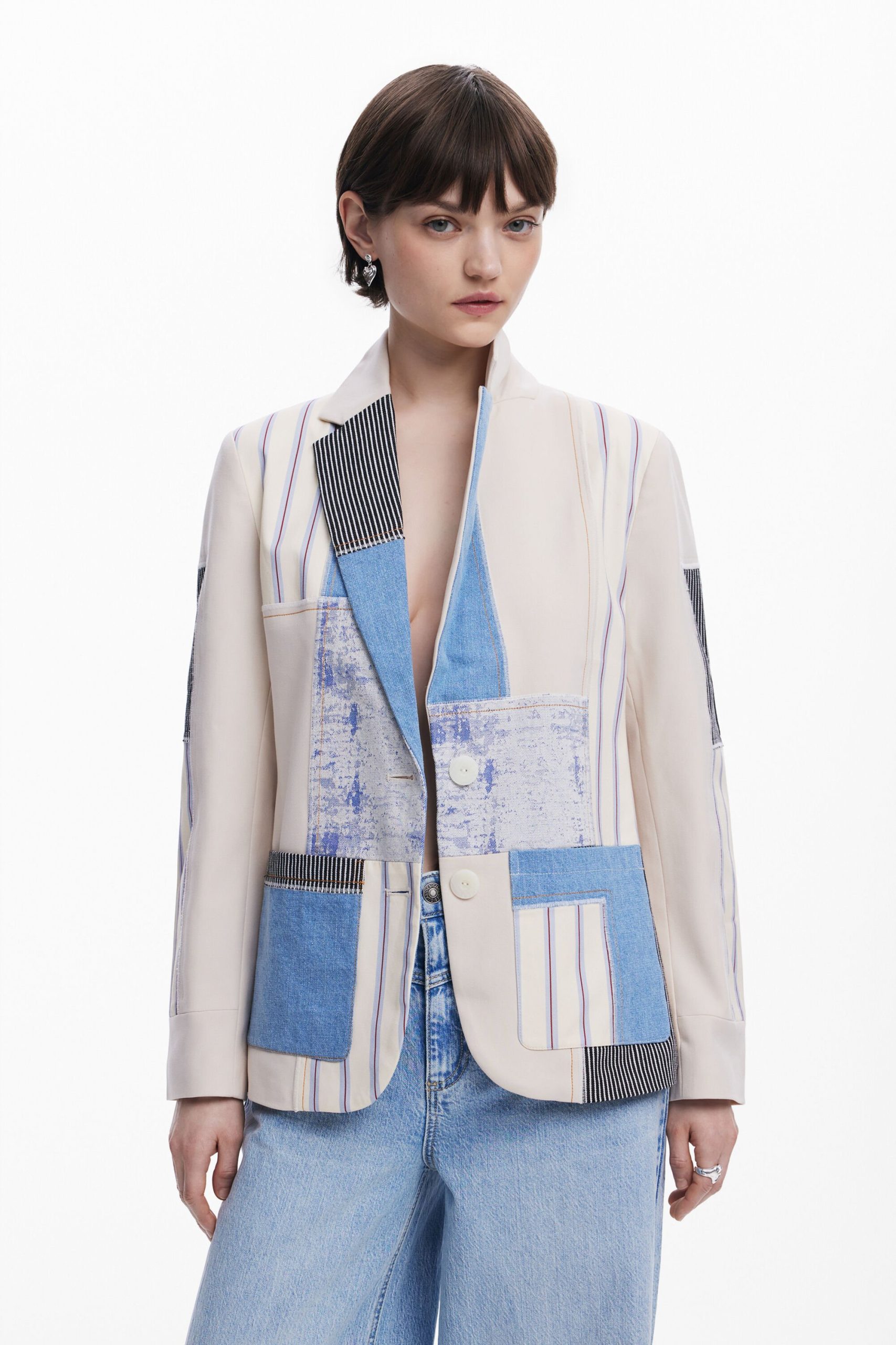 Blazer-style jacket with patchwork of different fabrics, button closure, and front pockets.