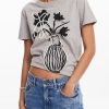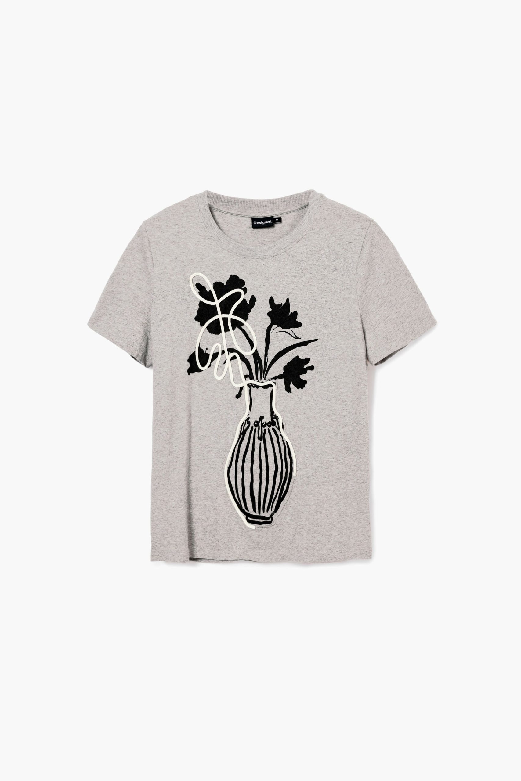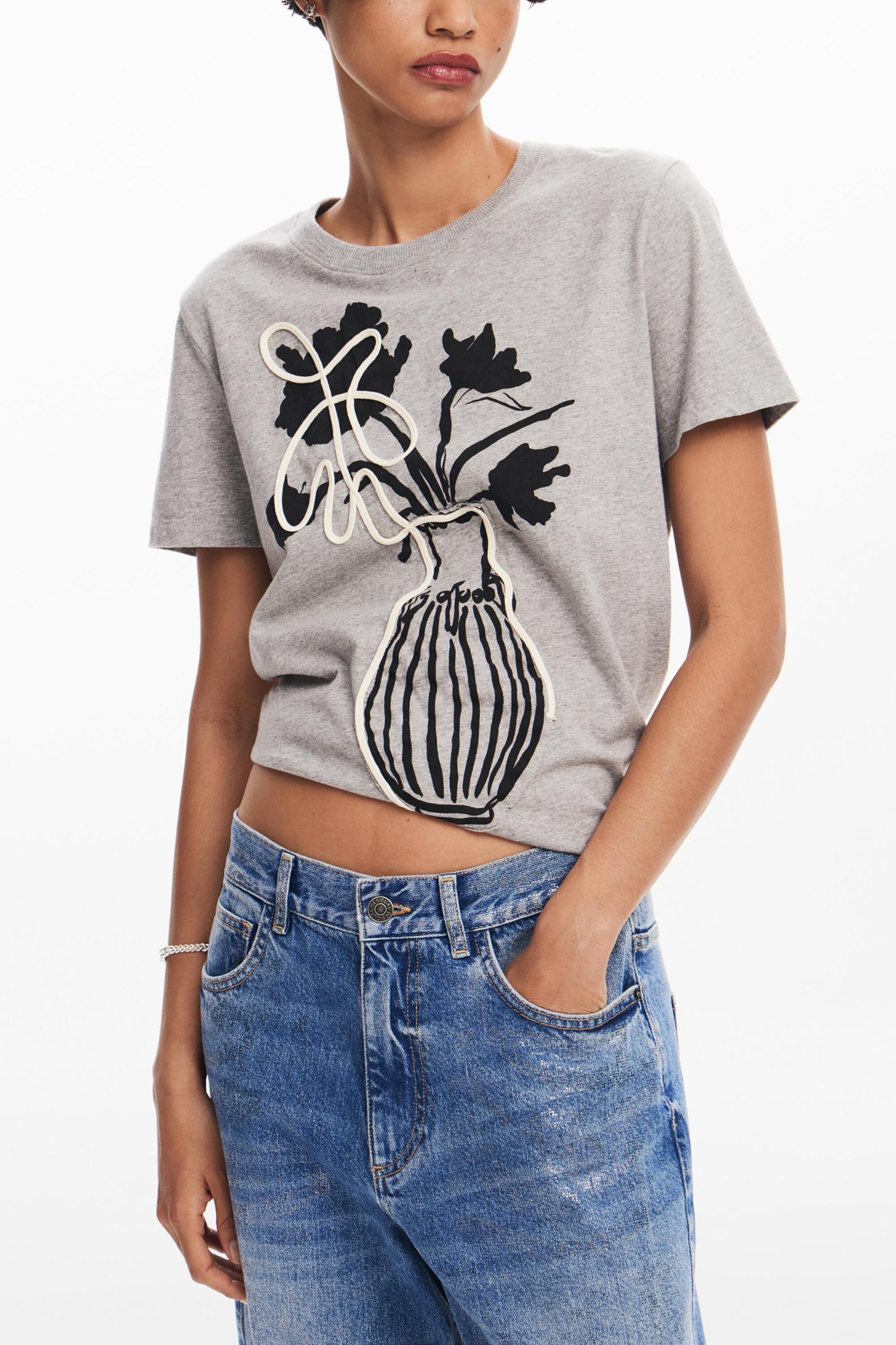 Short-sleeved cotton T-shirt with a round neck and a vase with flowers print