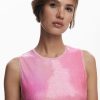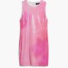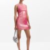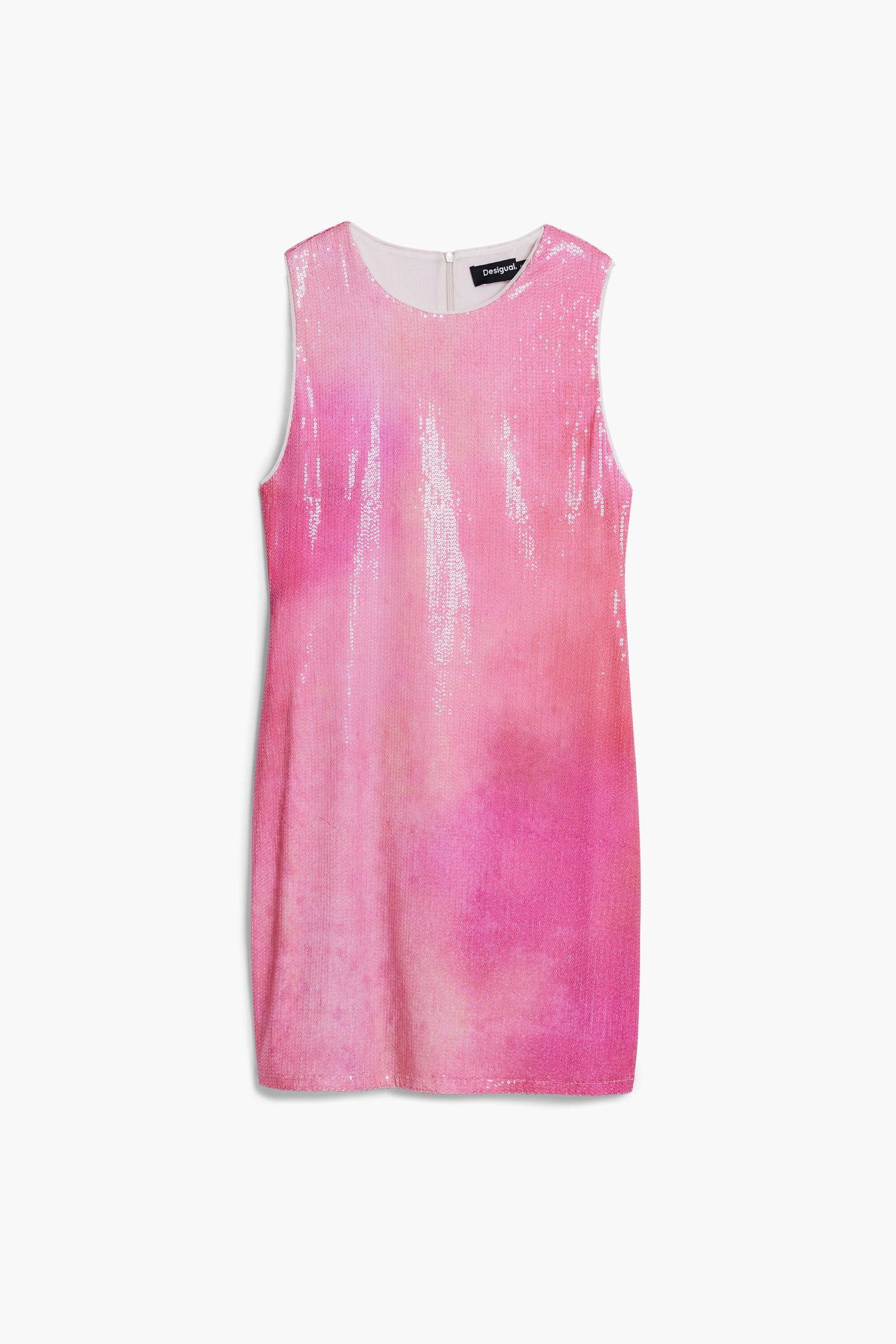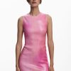 Short fitted dress with a round neck, sleeveless, and zipper closure with a shiny finish.
