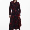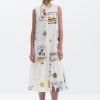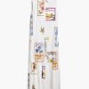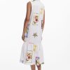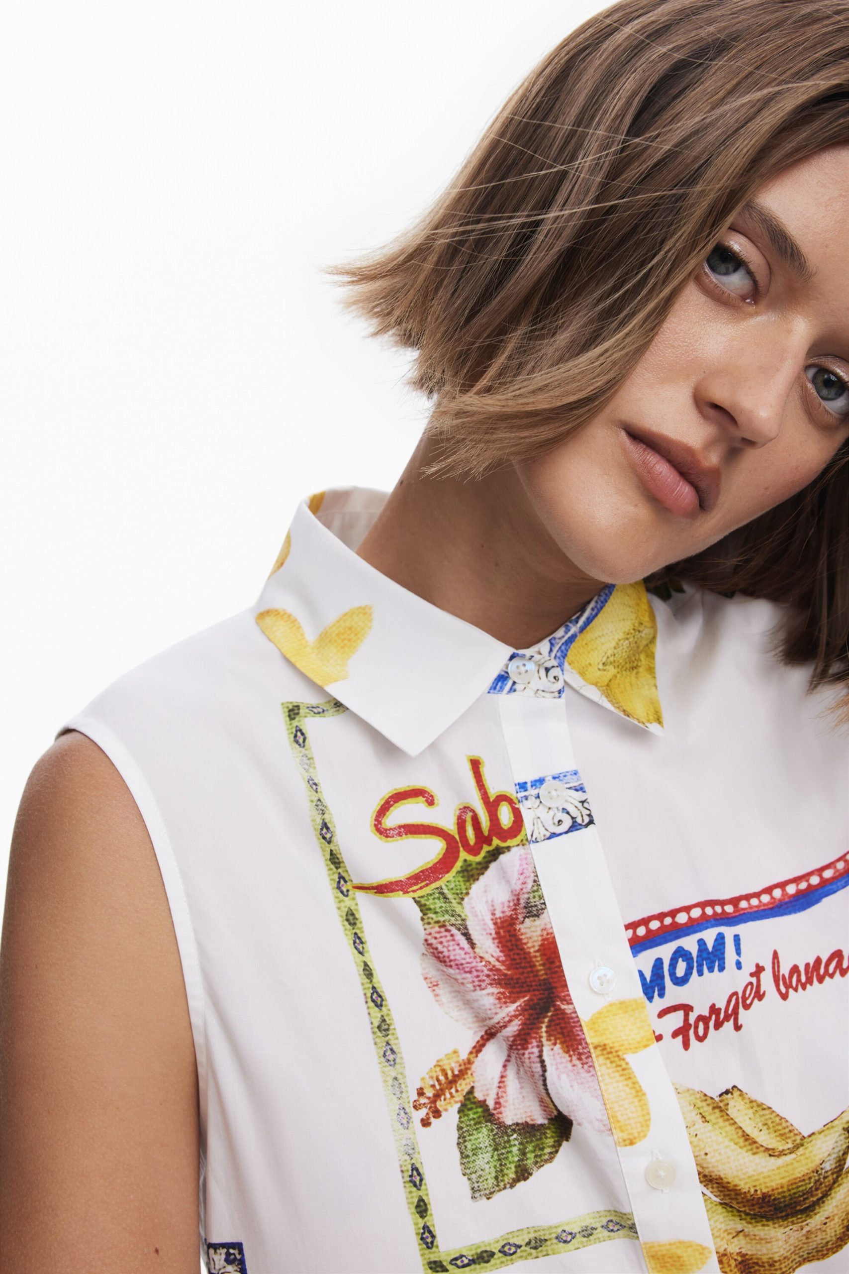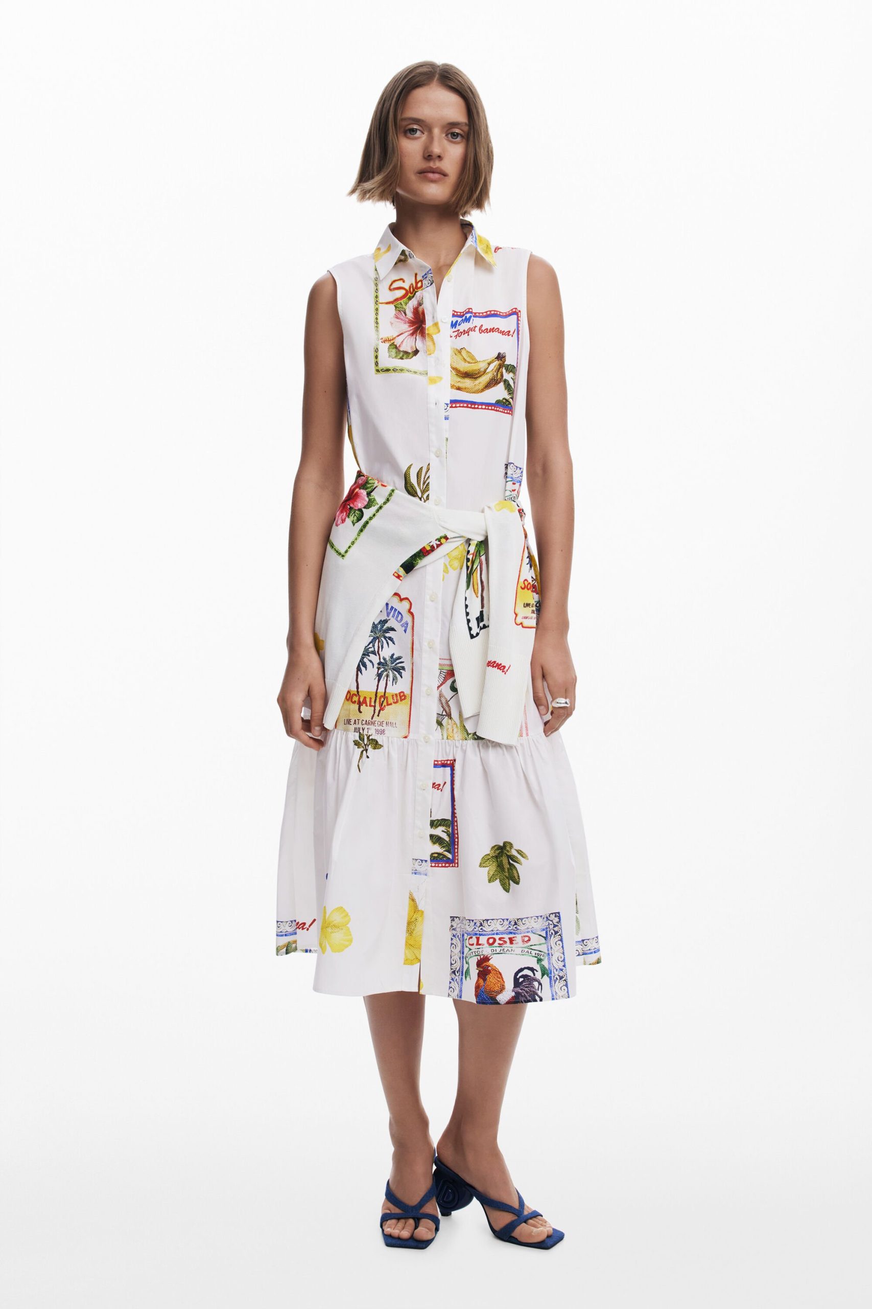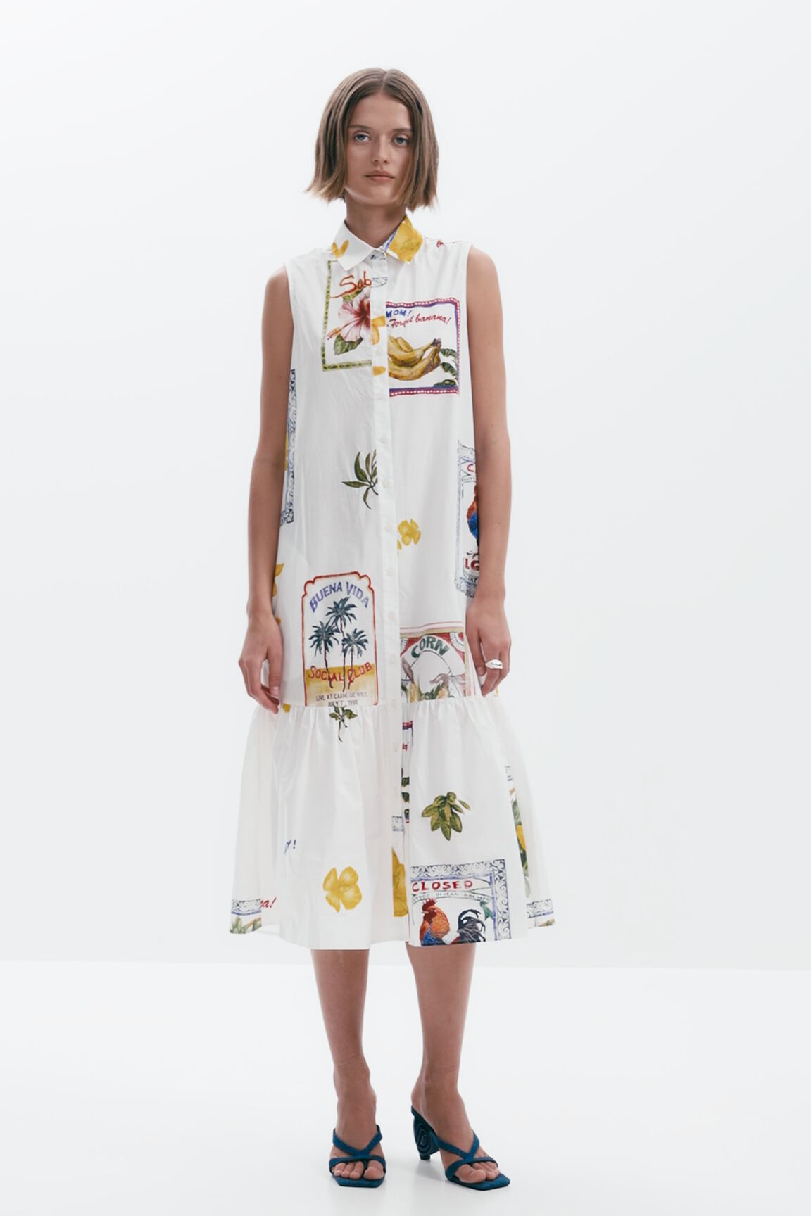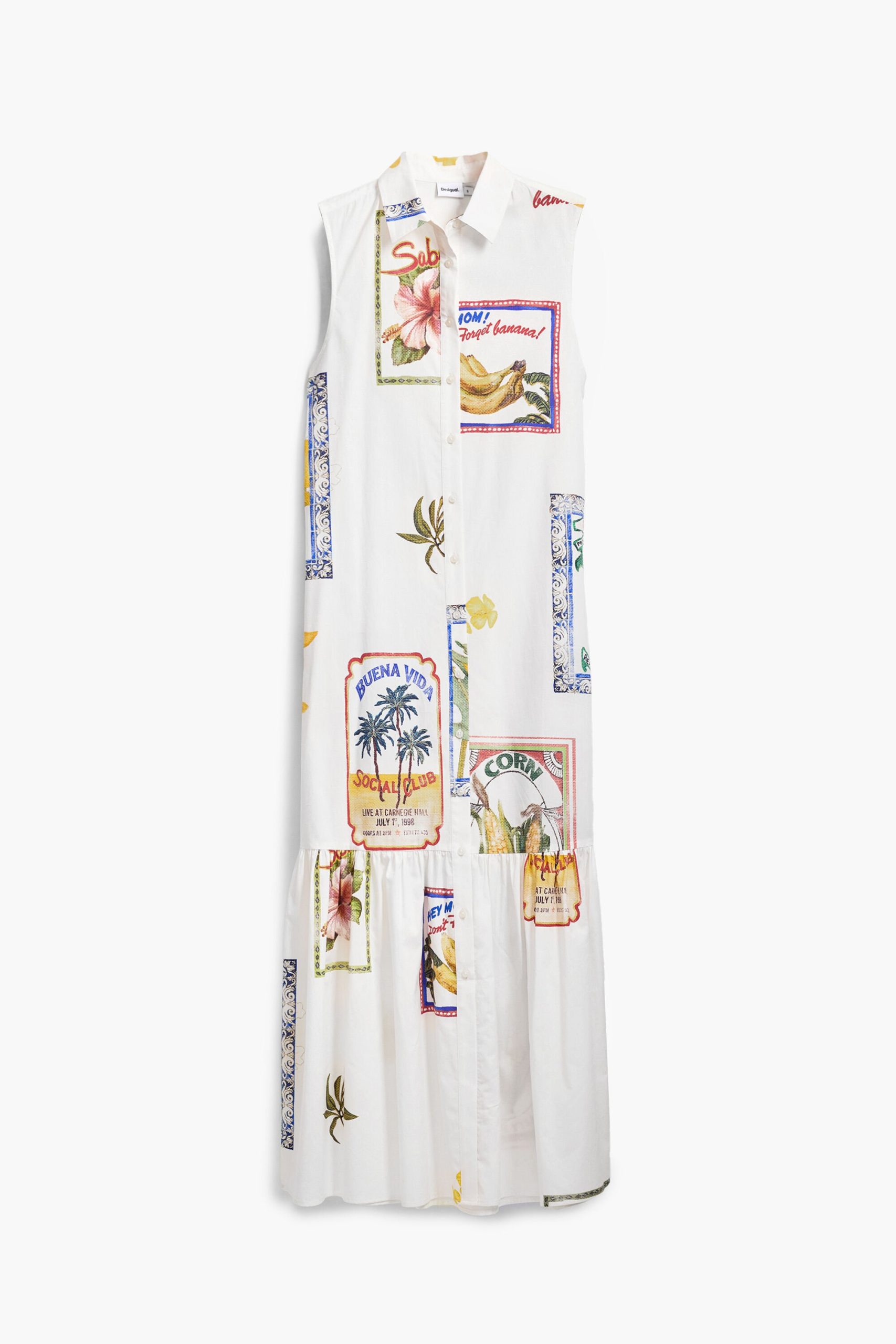 Sleeveless long shirt-style dress with a ruffle hem and tropical postcard print.