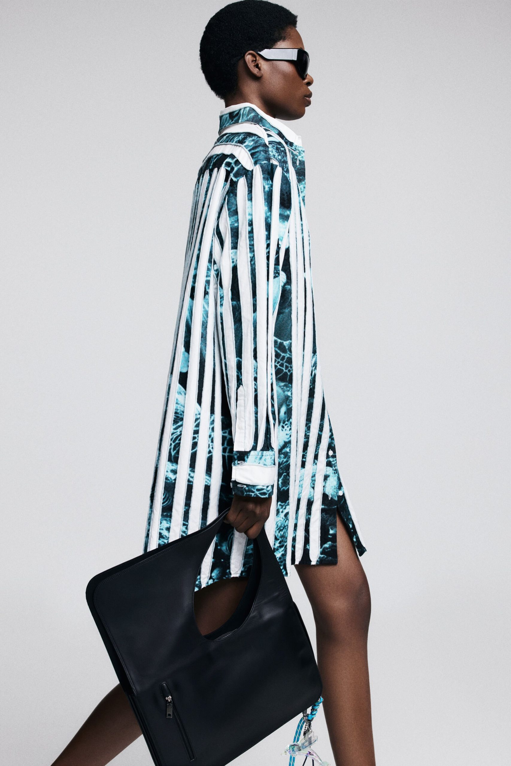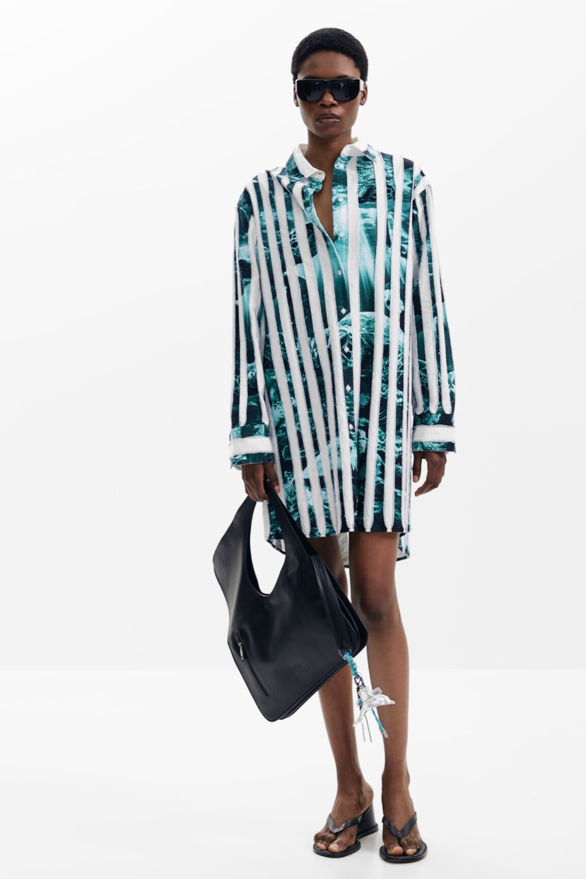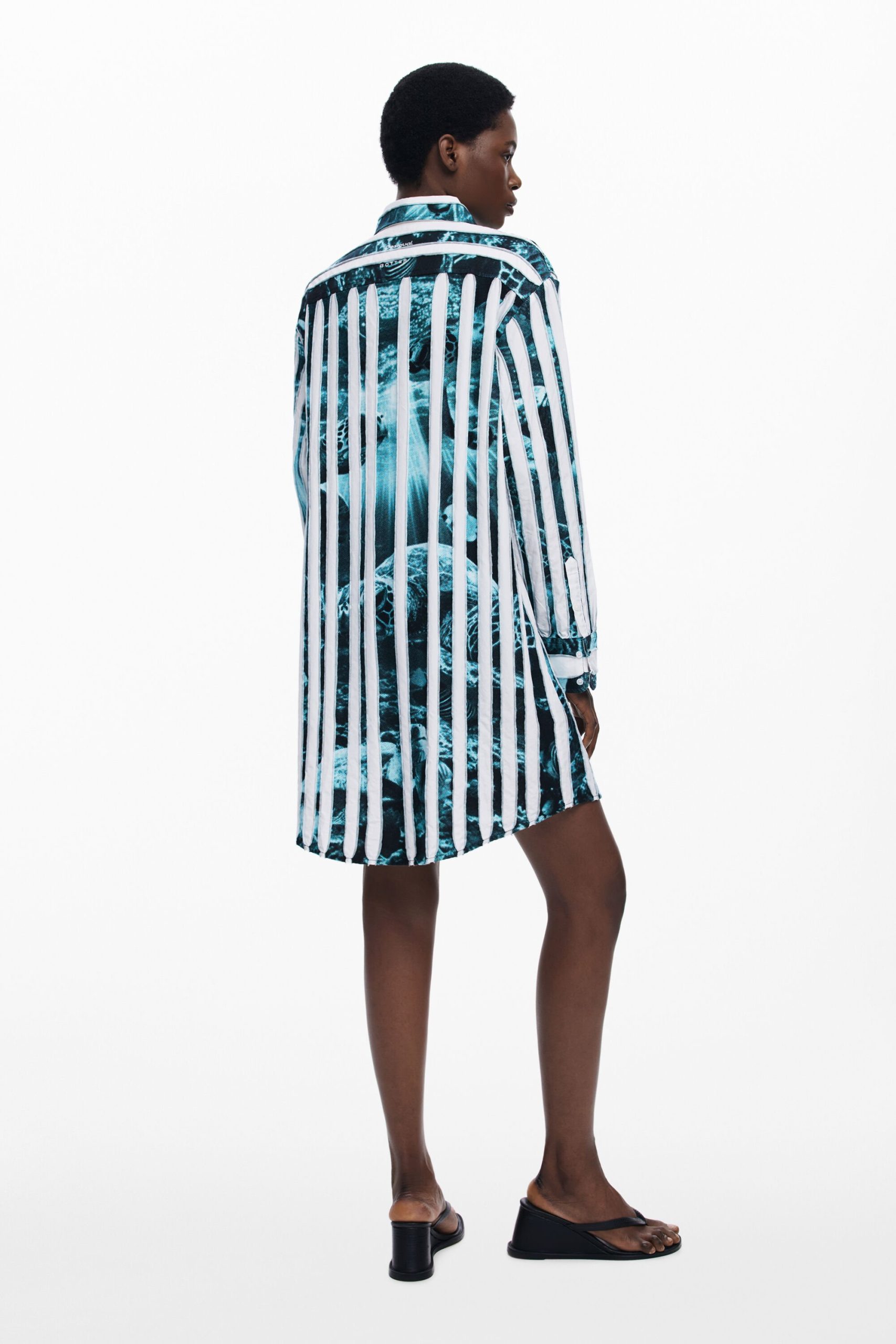 Oversized shirt dress in poplin, with panel details in t-shirt-style fabric and print inspired by underwater landscapes.