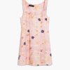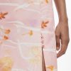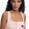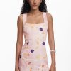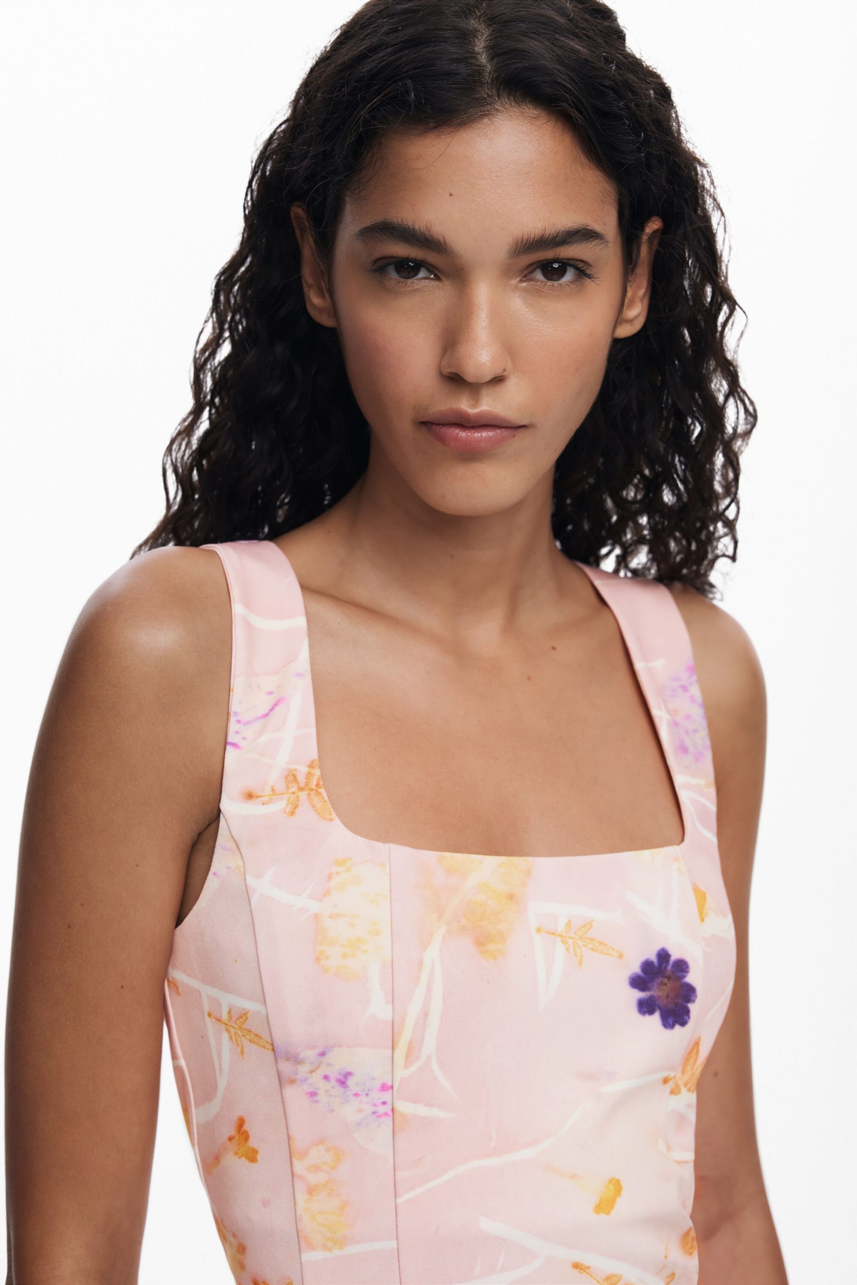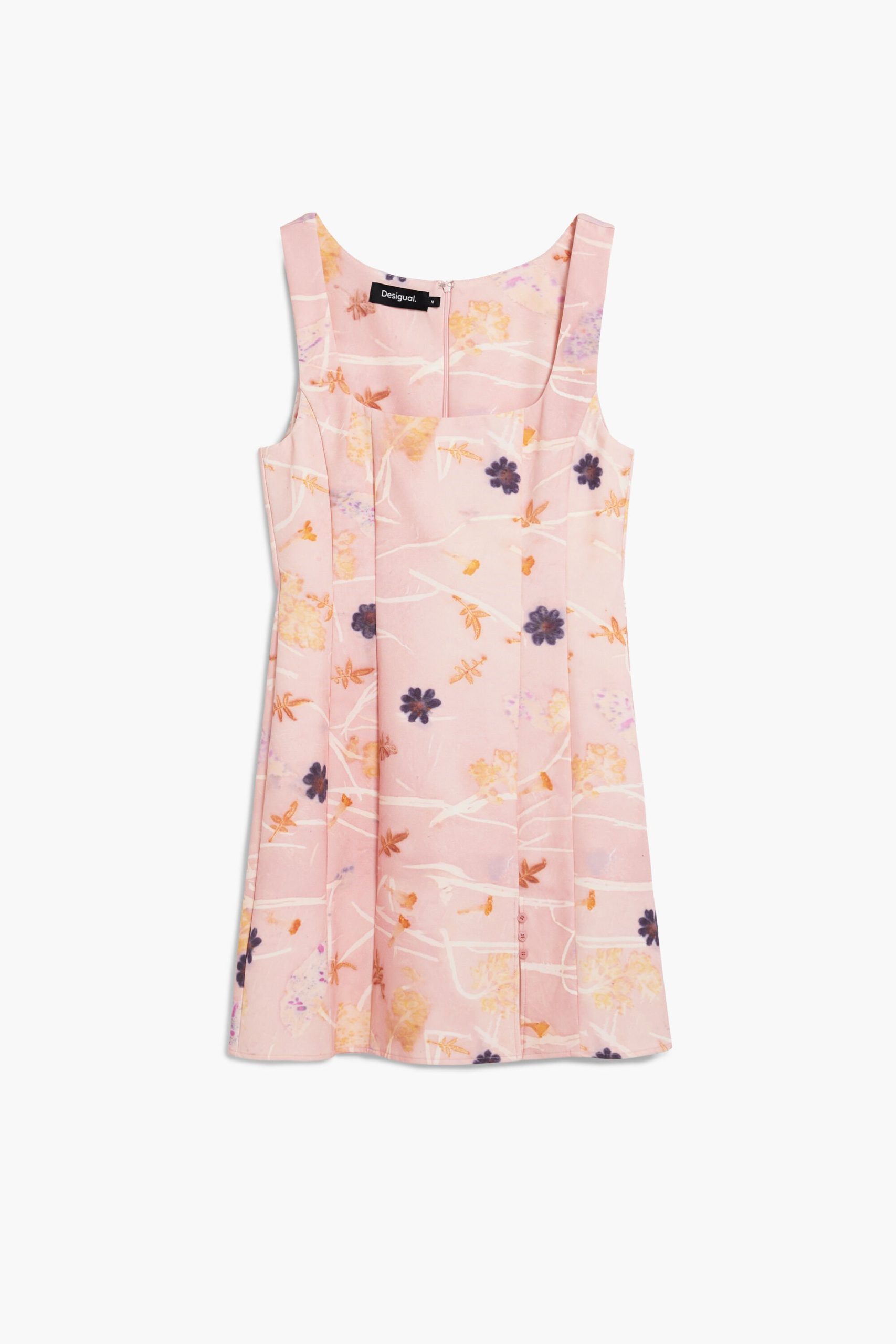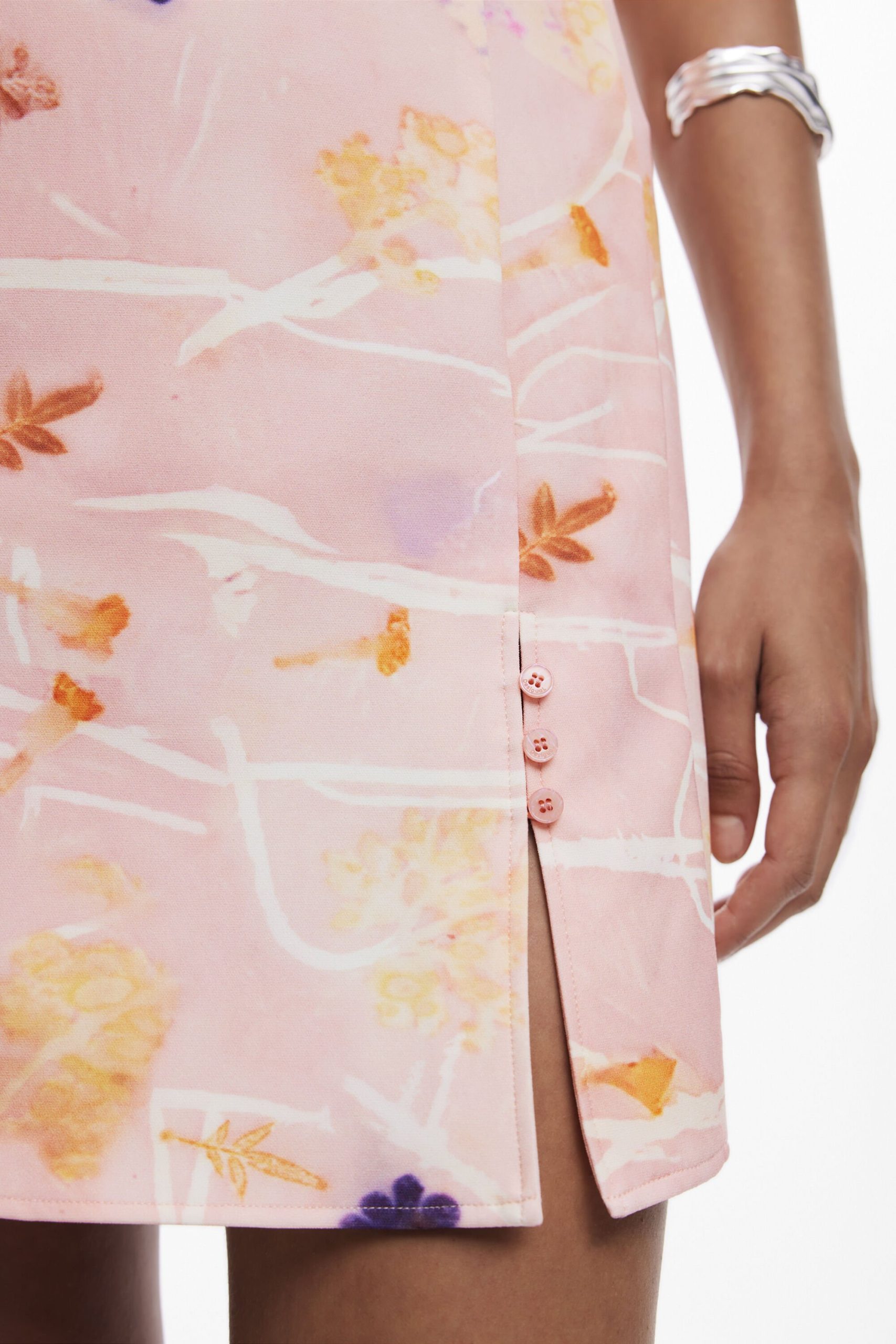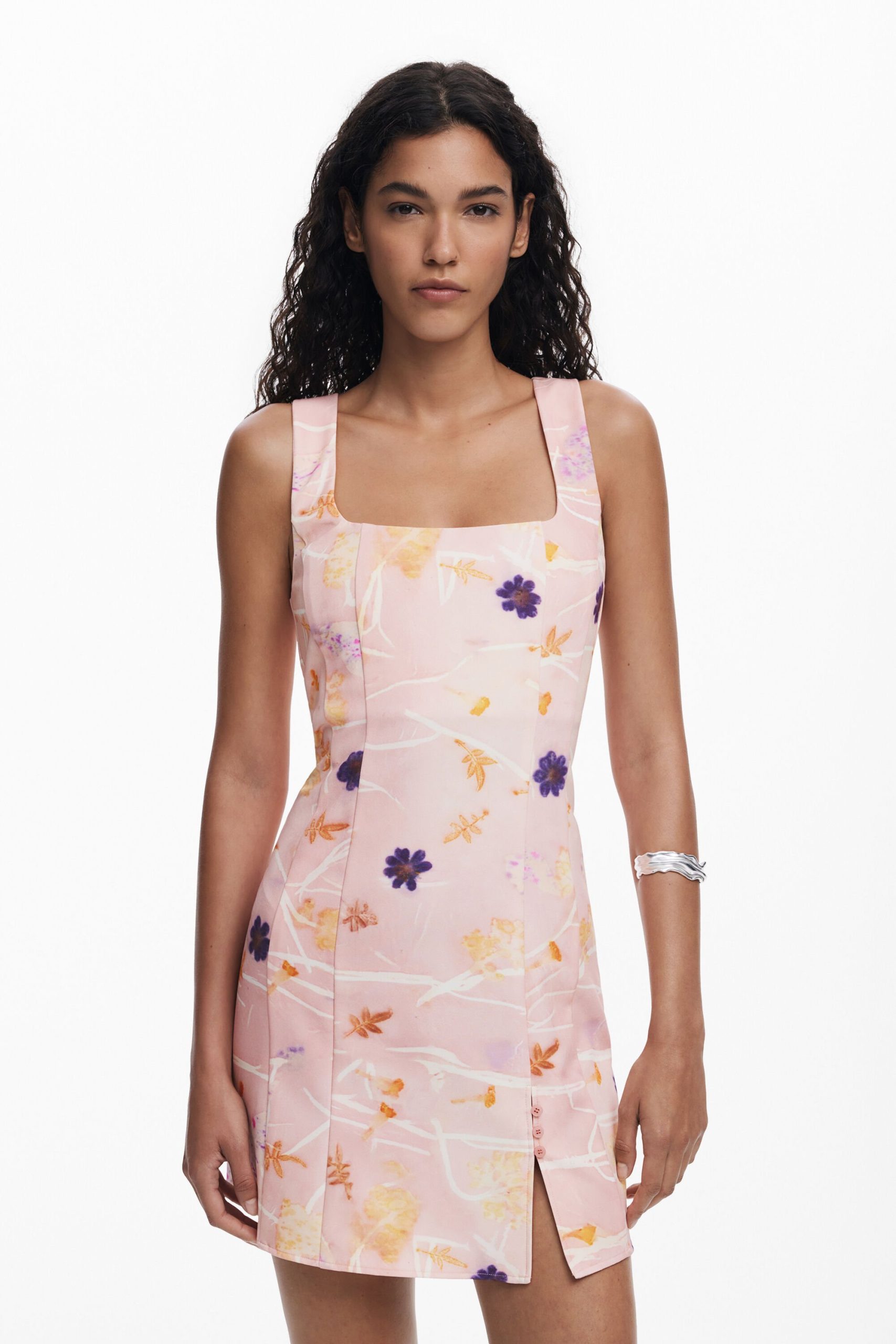 Short fitted dress with straps, floral print, zipper closure, and slit at the bottom