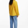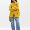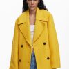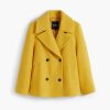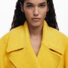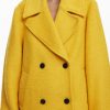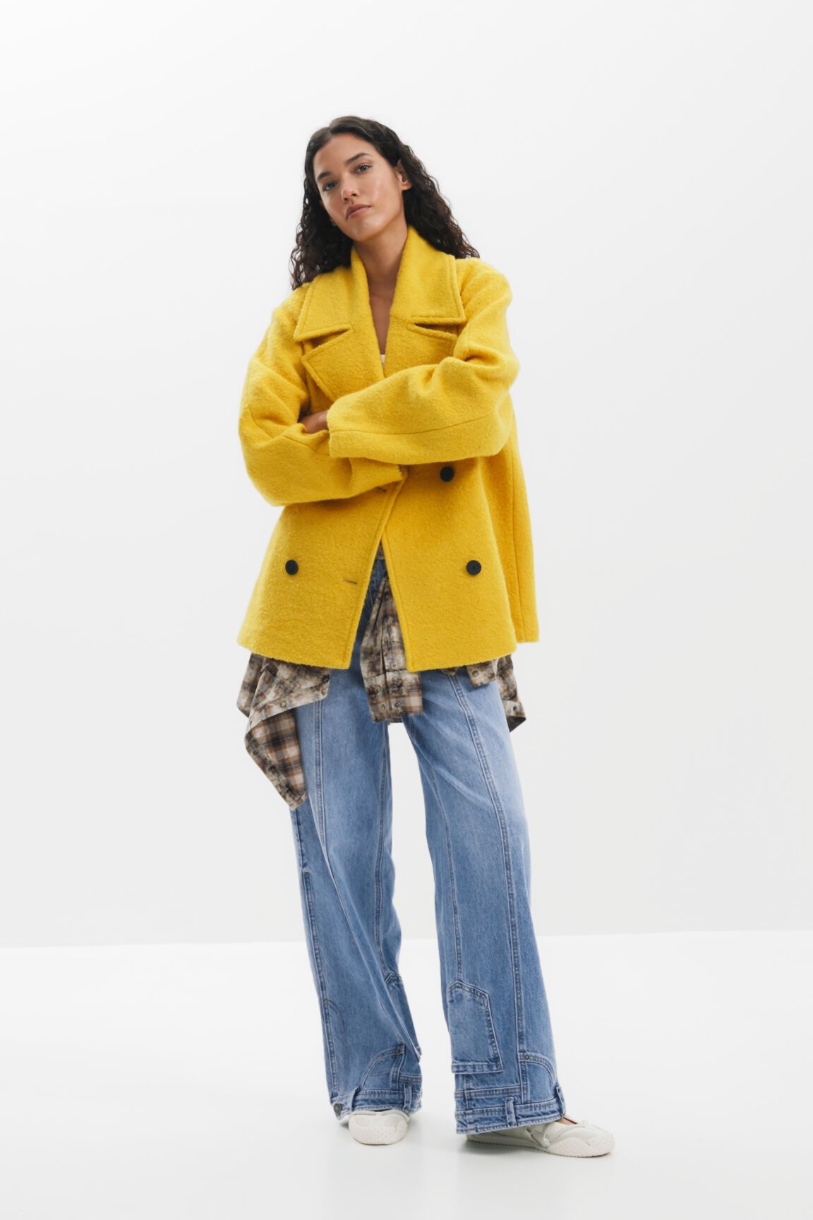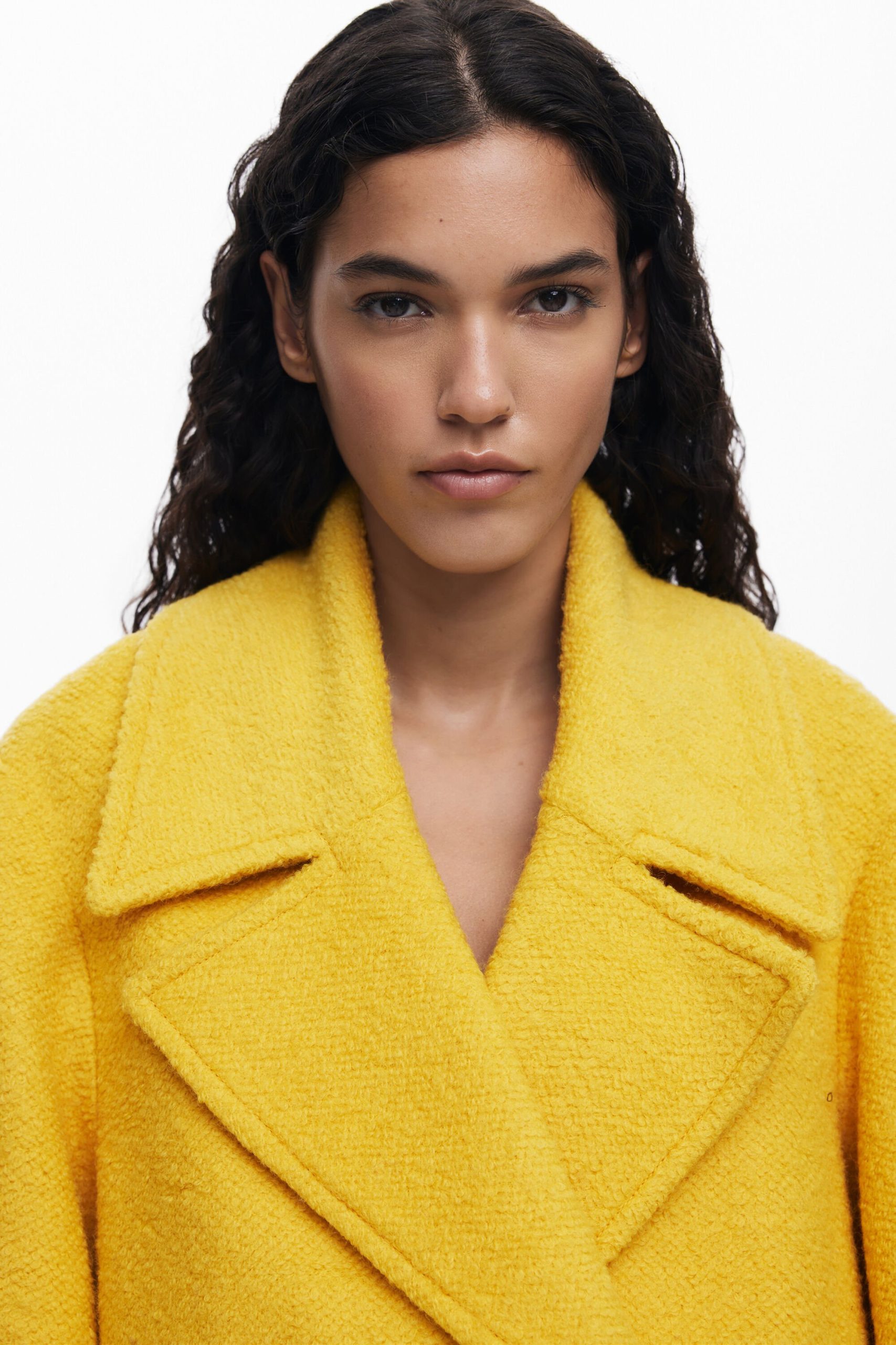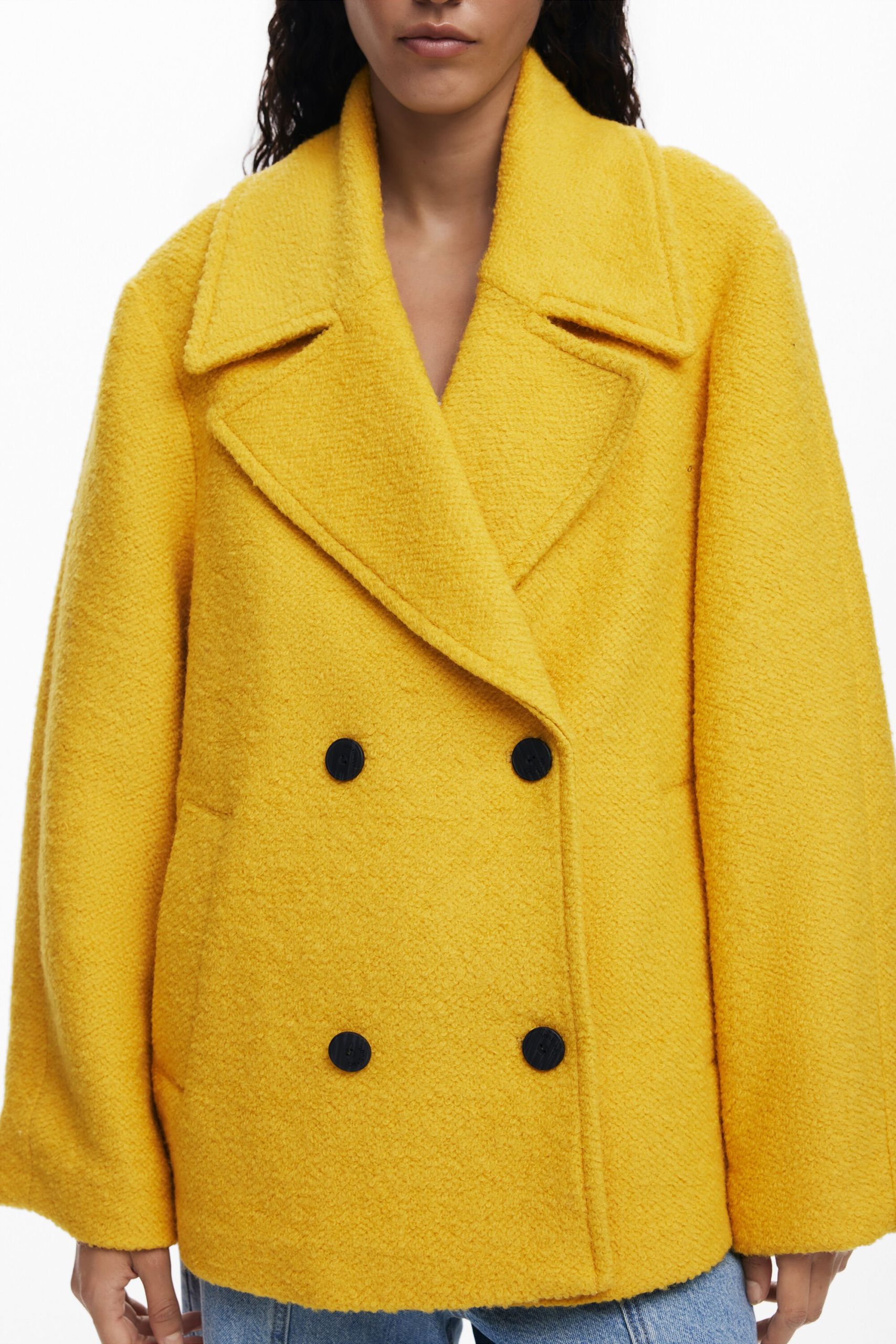 Short boucle coat with lapel collar, double-breasted front, and solid color pockets.