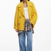 Short boucle coat with lapel collar, double-breasted front, and solid color pockets.