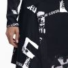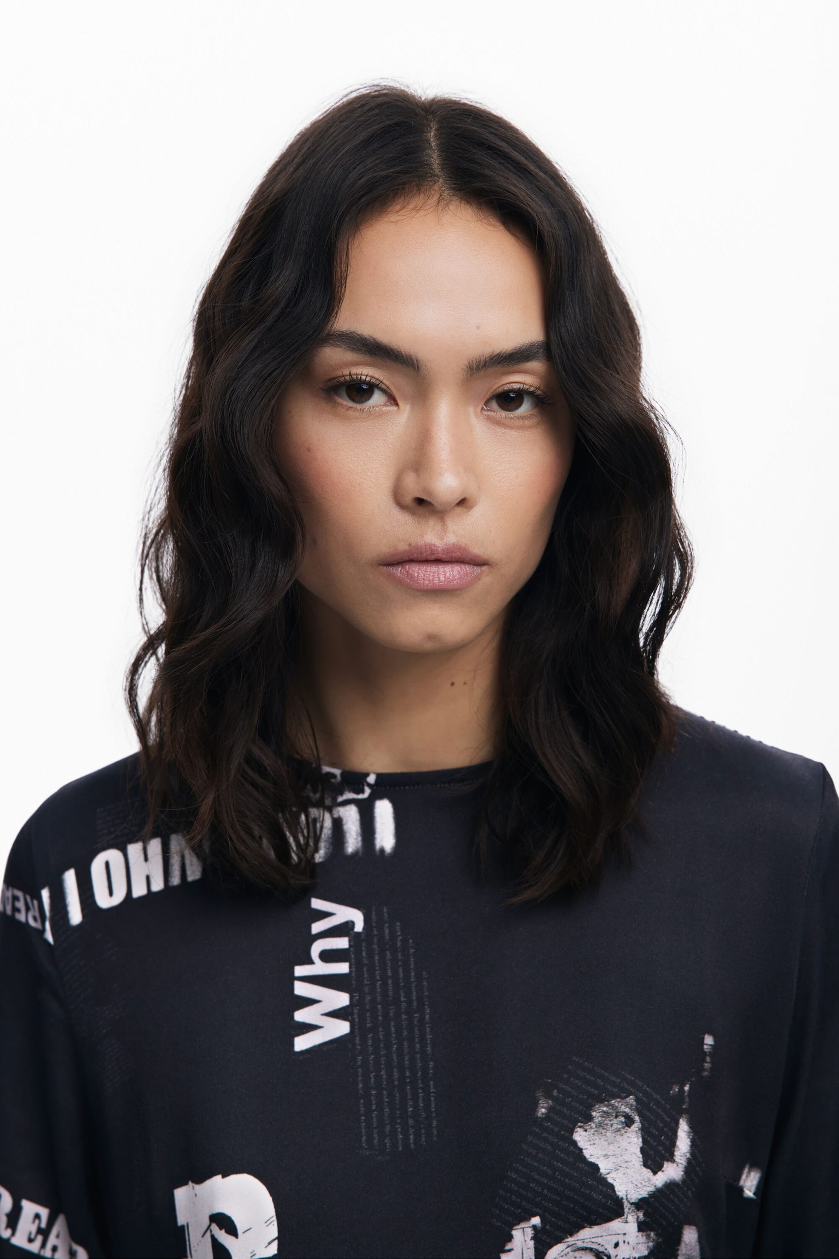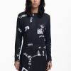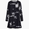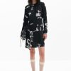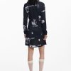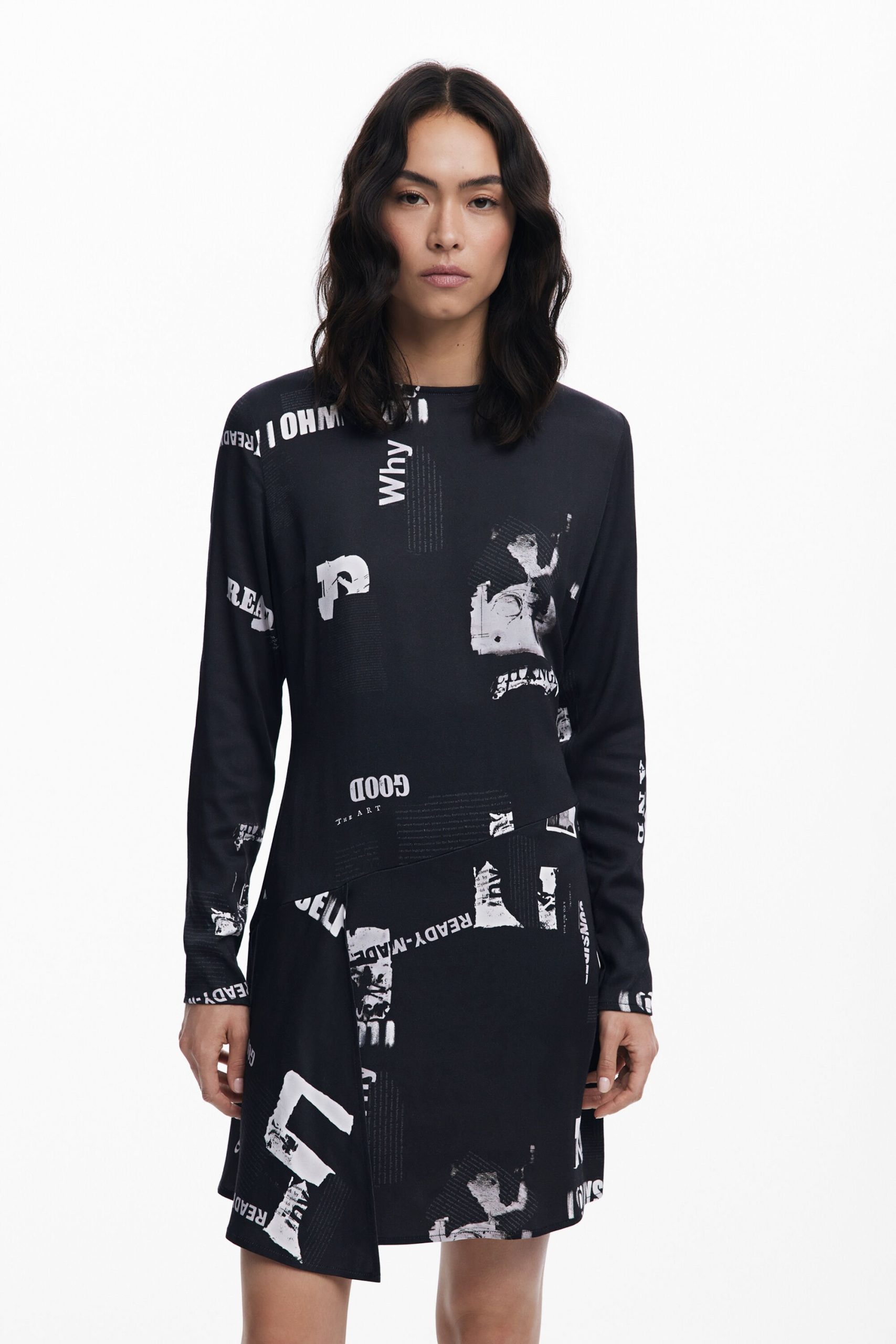 Short fitted dress with asymmetrical hem, long sleeves, and round neck with newspaper print.