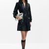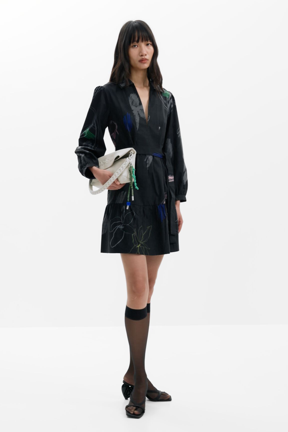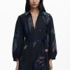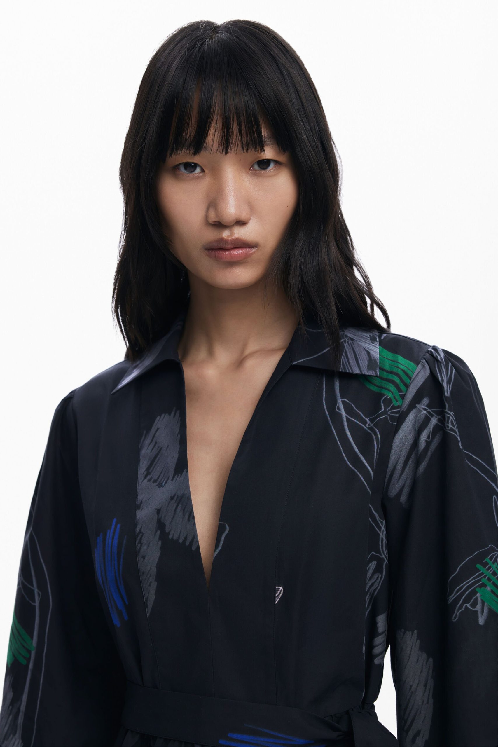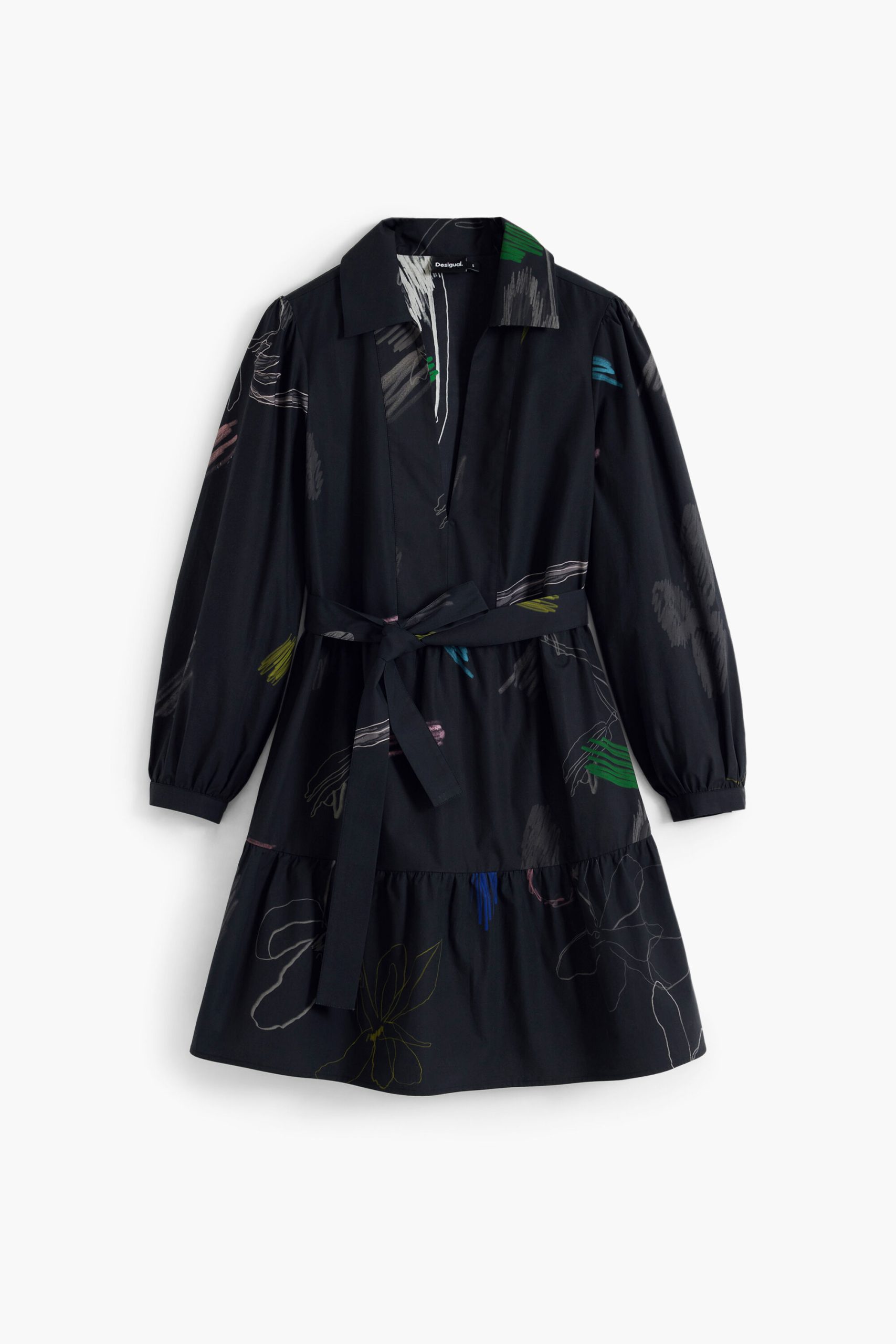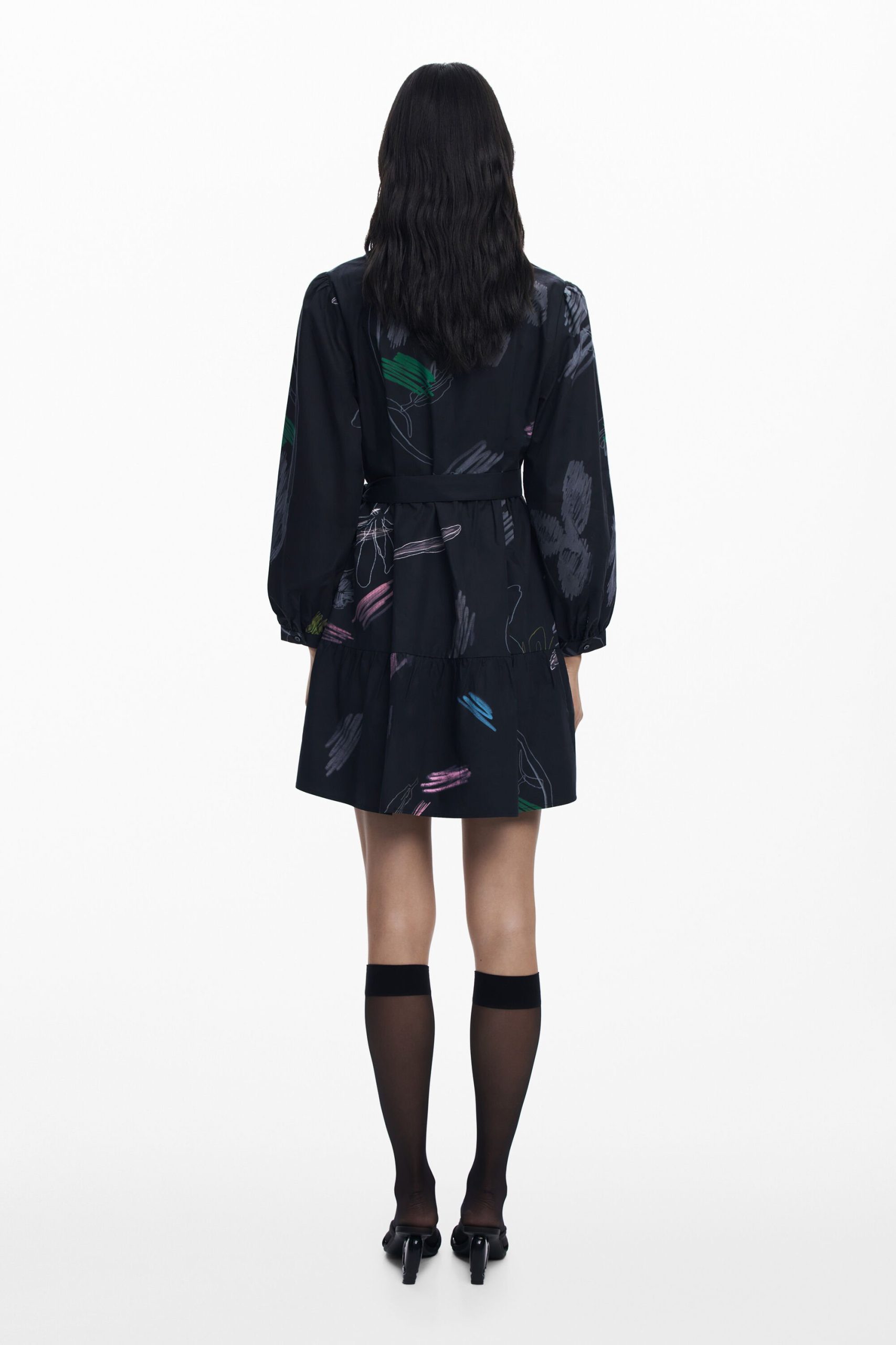 Short paneled shirt-style dress, long balloon sleeves, and stroke print on a black background.
