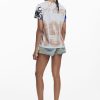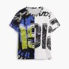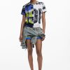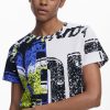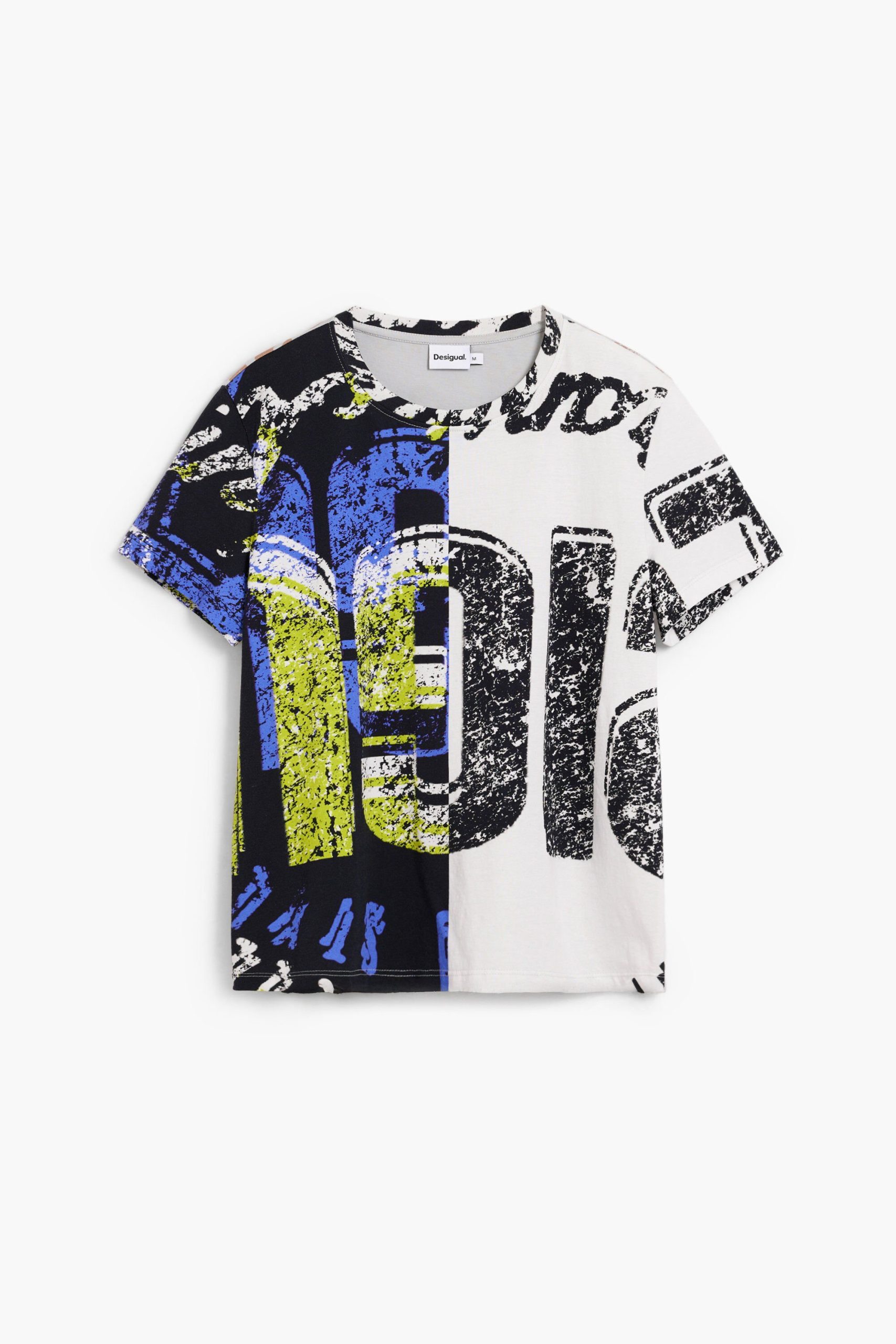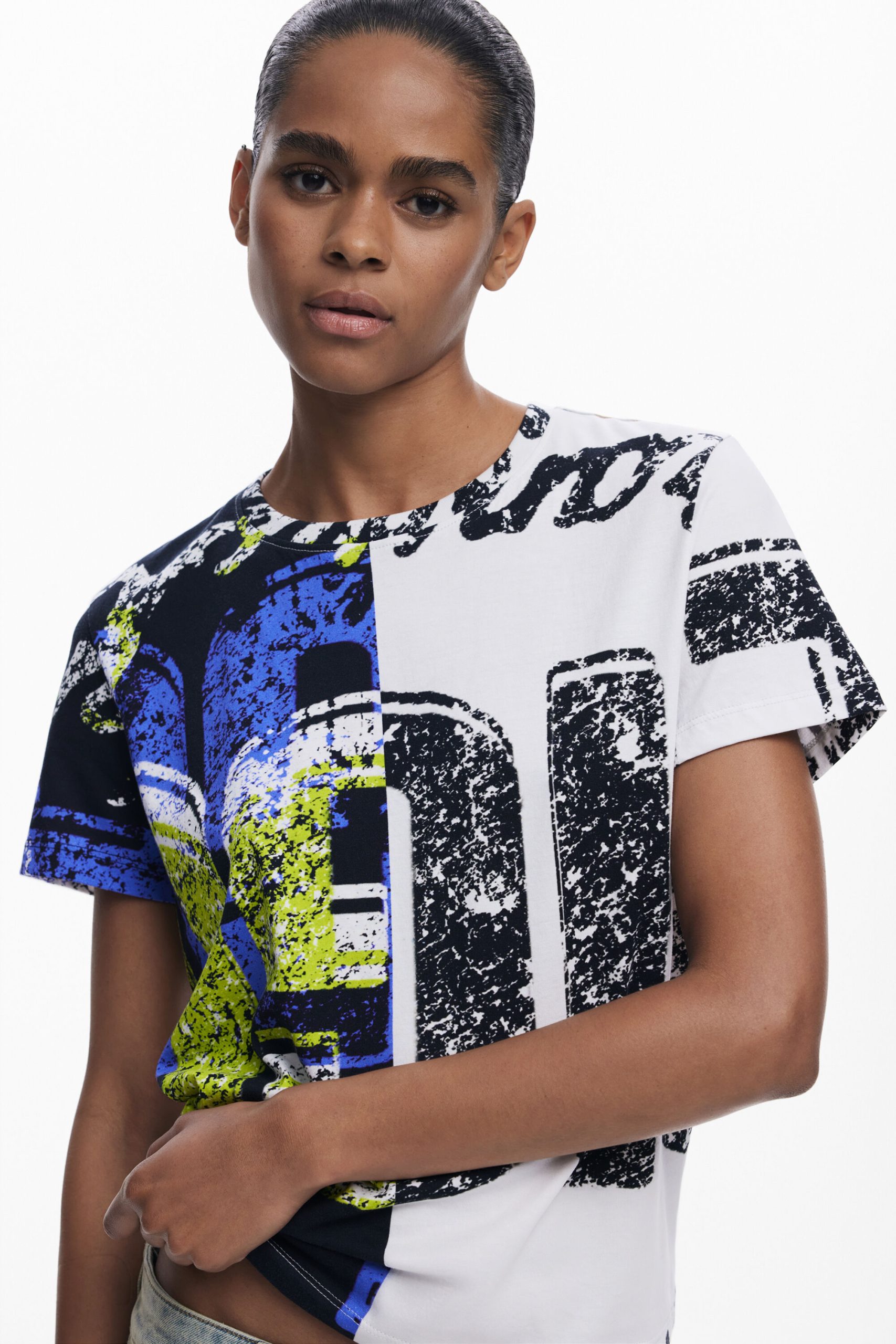 Short-sleeve T-shirt with text print and contrasting color numbers.