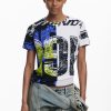 Short-sleeve T-shirt with text print and contrasting color numbers.