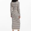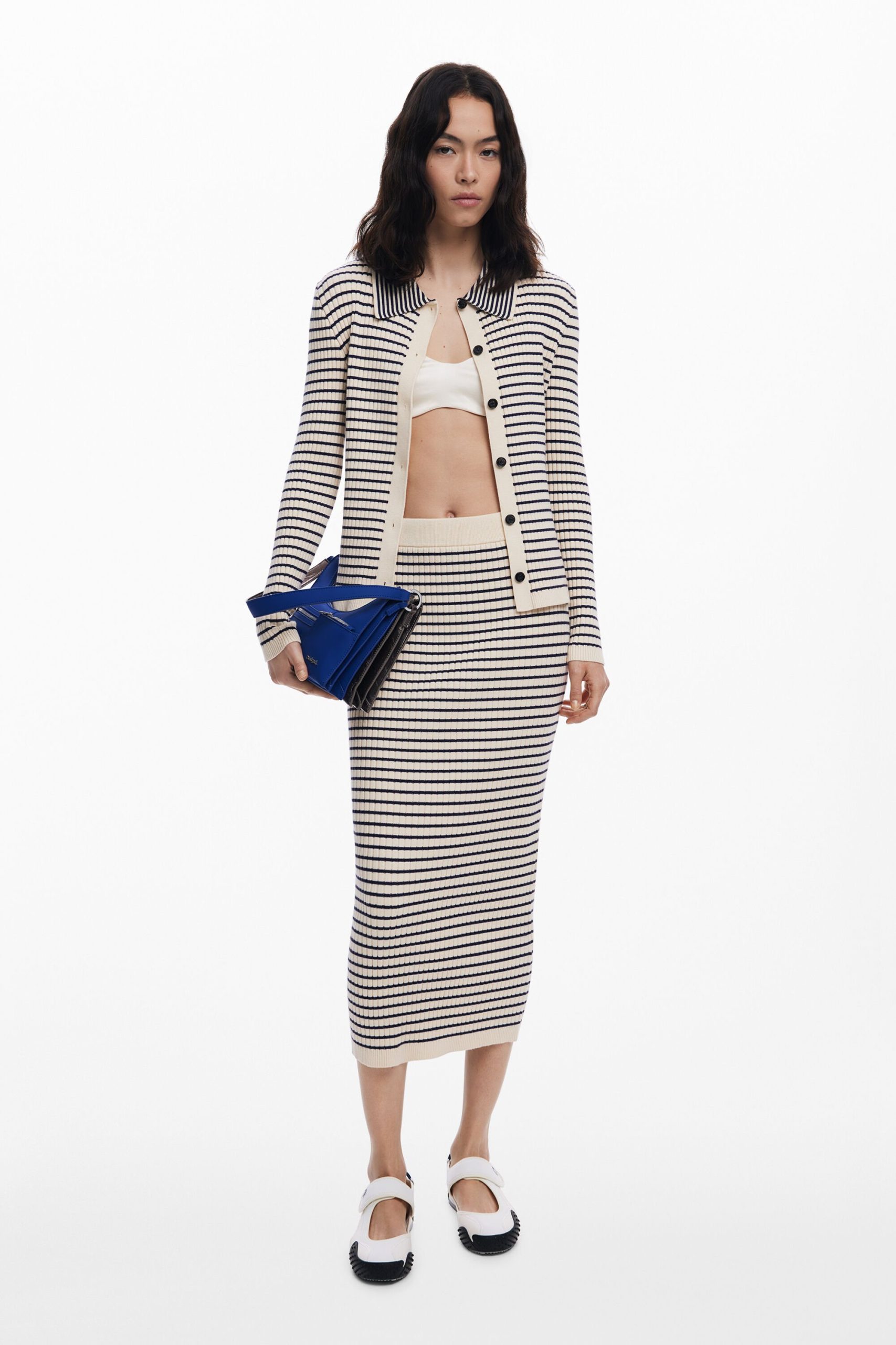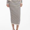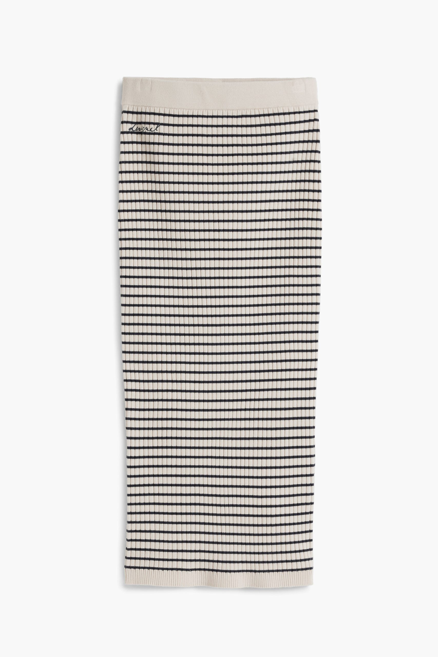 Knee-length pencil skirt in stretchy knit fabric, body-hugging, with horizontal stripe print.