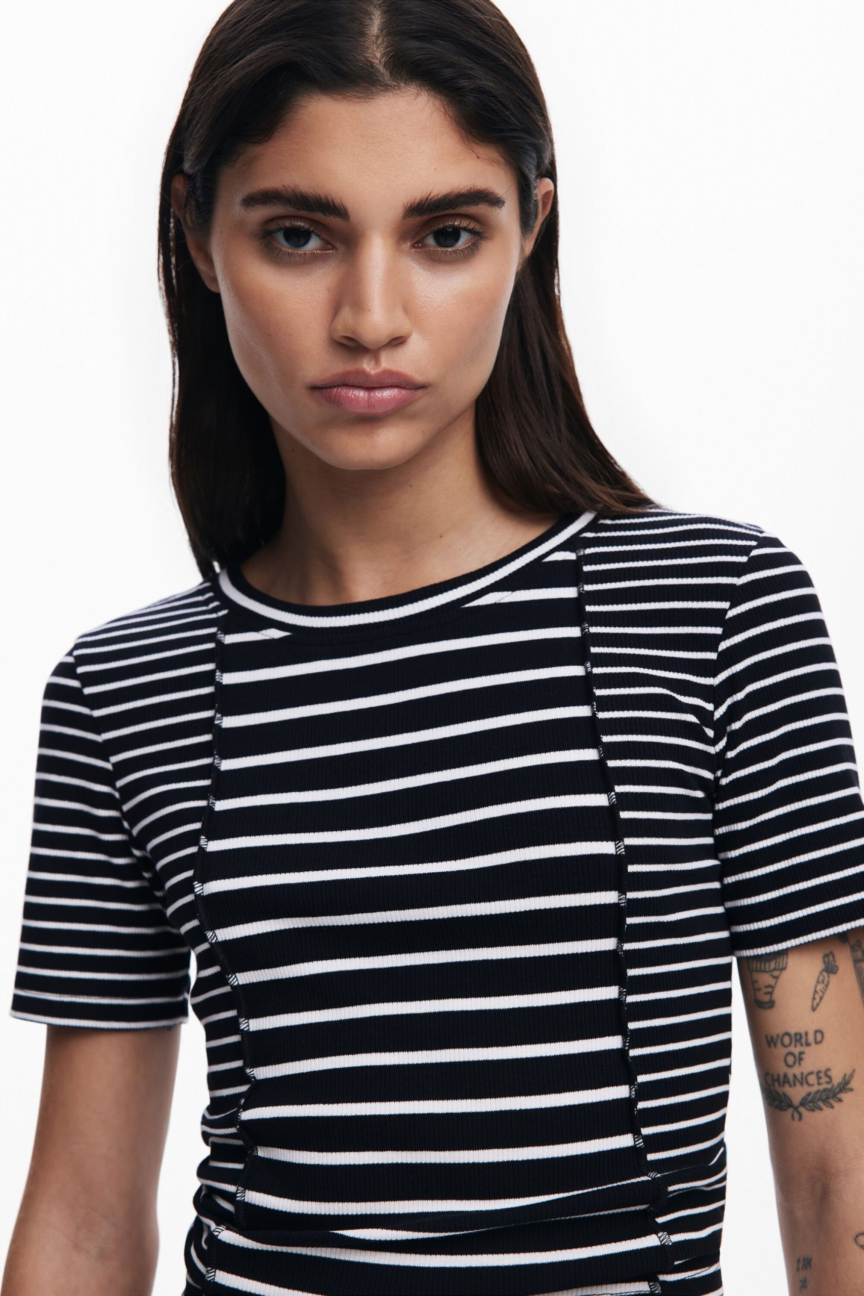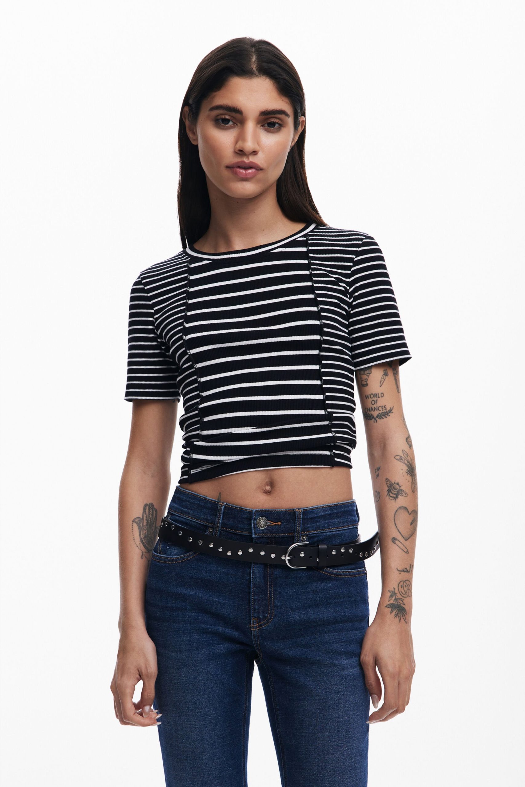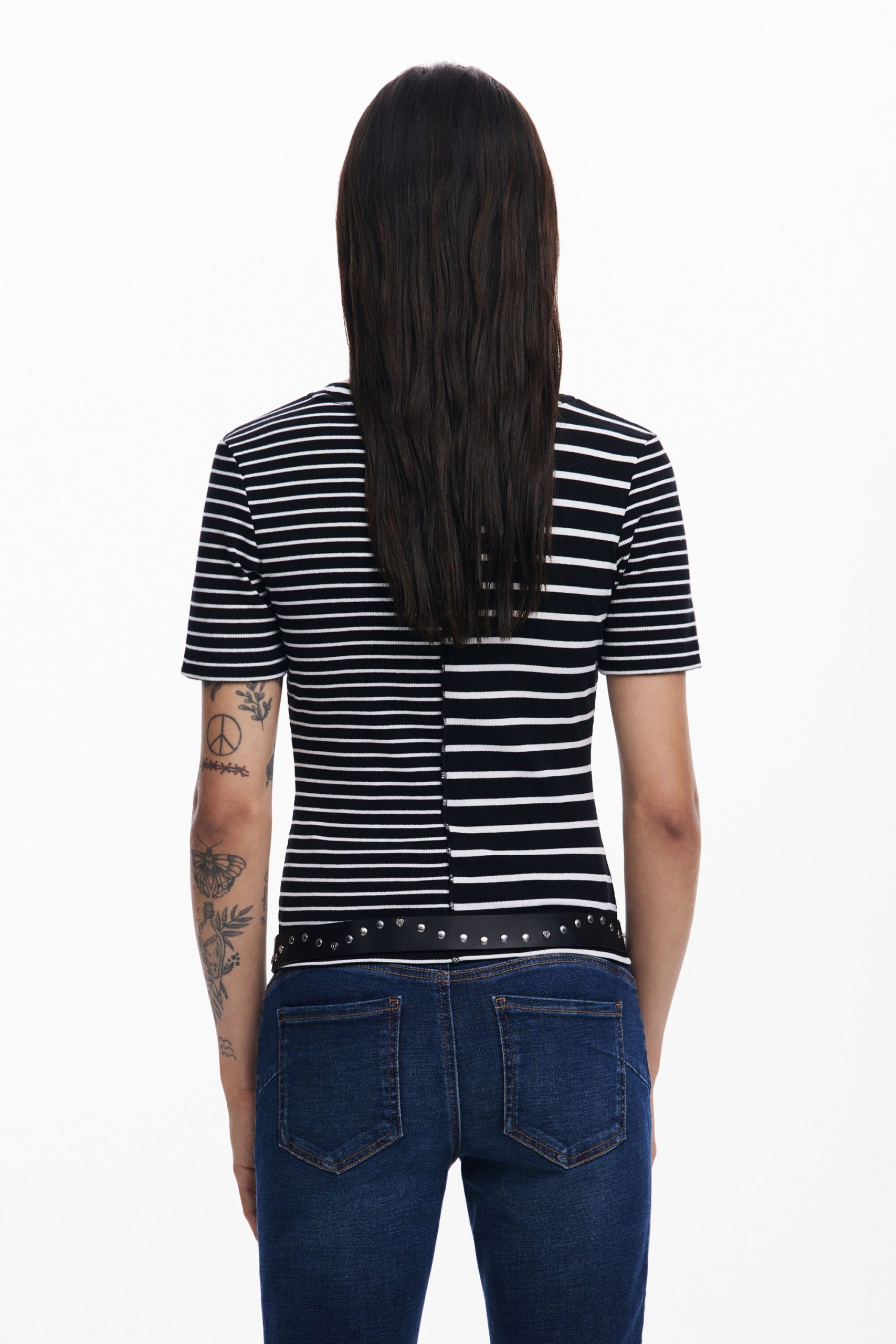 Short-sleeved T-shirt with a round neck and patchwork style combining different striped patterns.