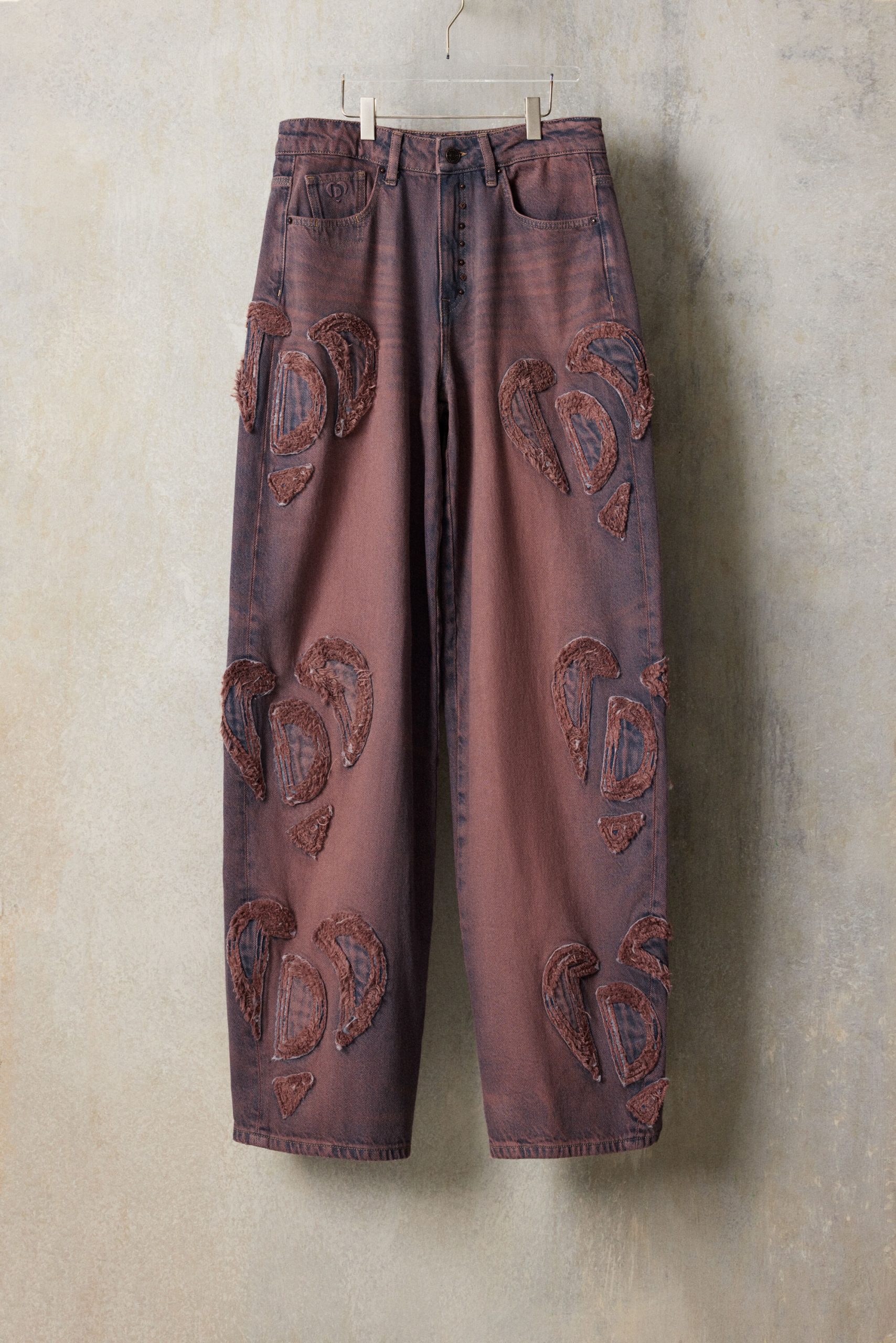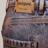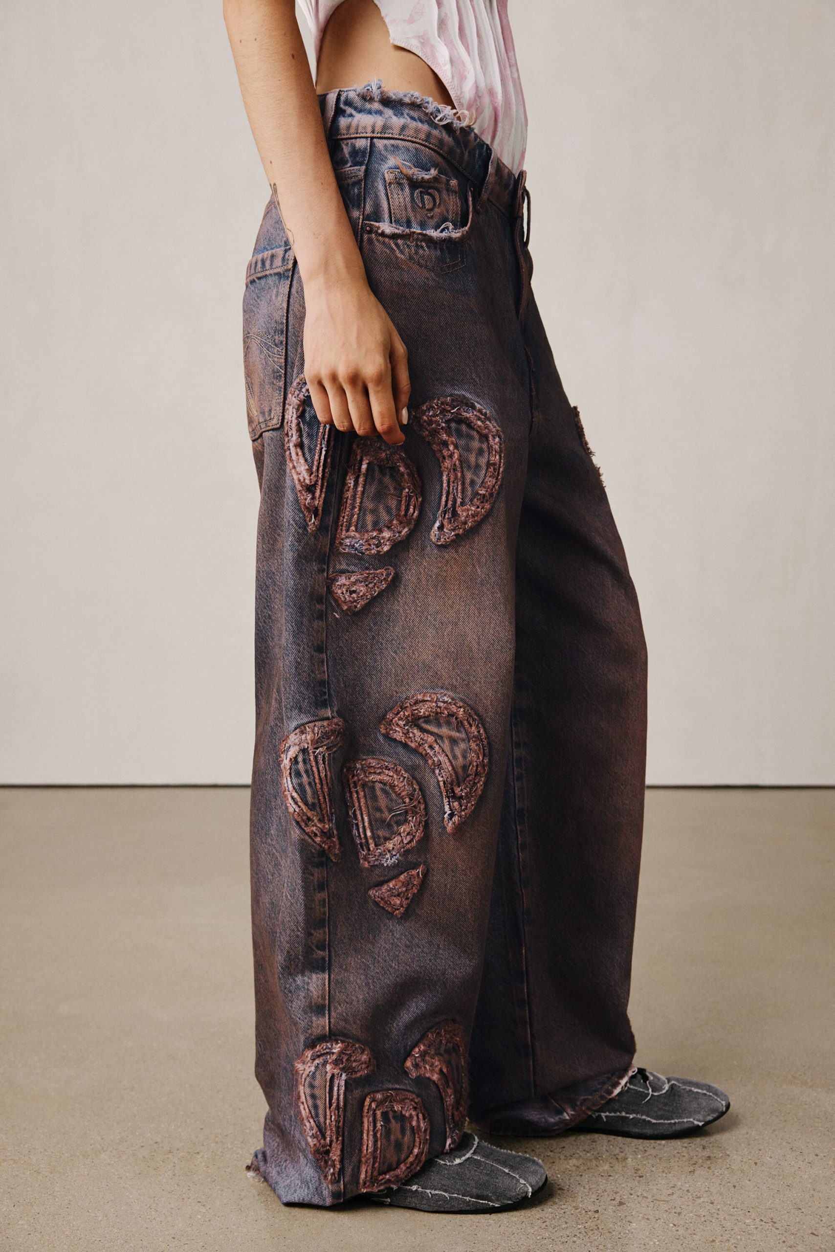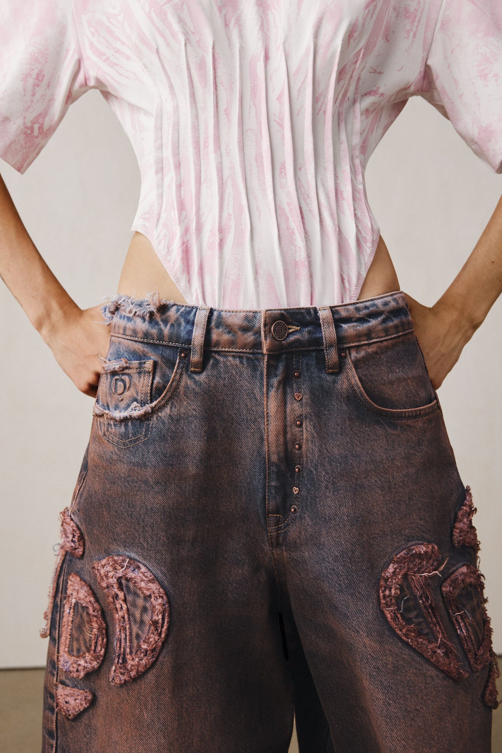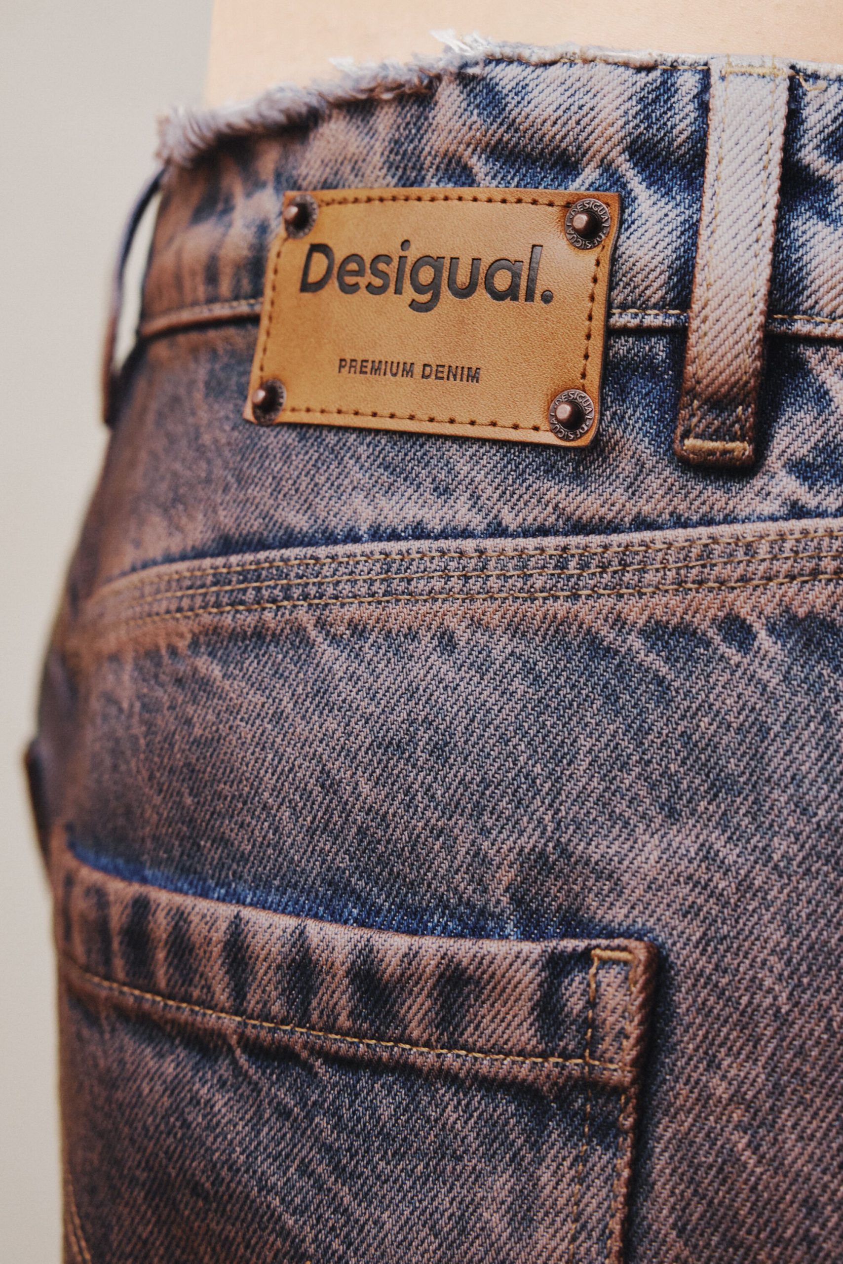 Long baggy-style denim trousers with embroidered fabric appliqués and Desigual logo in a frayed effect.