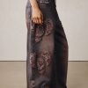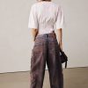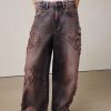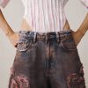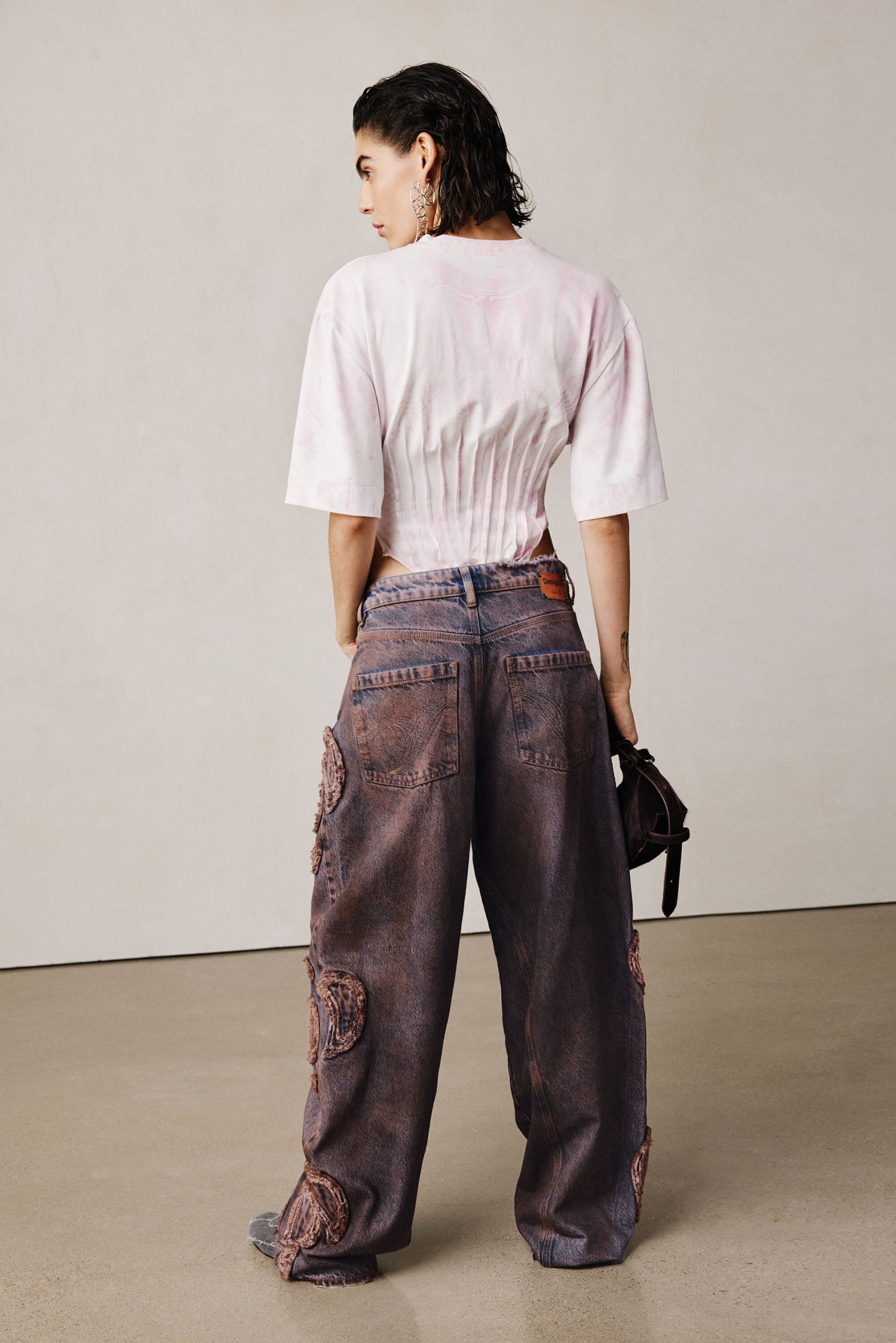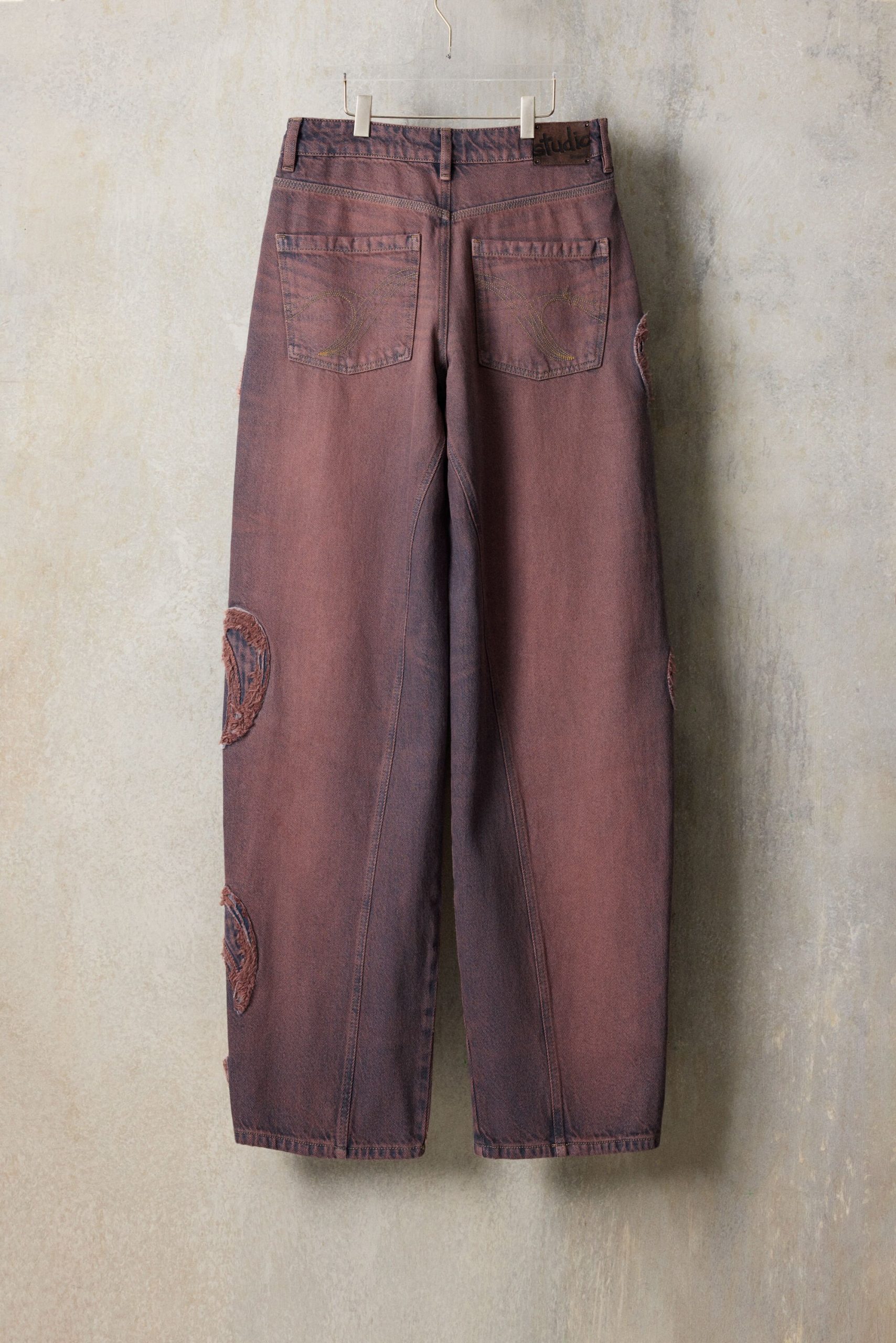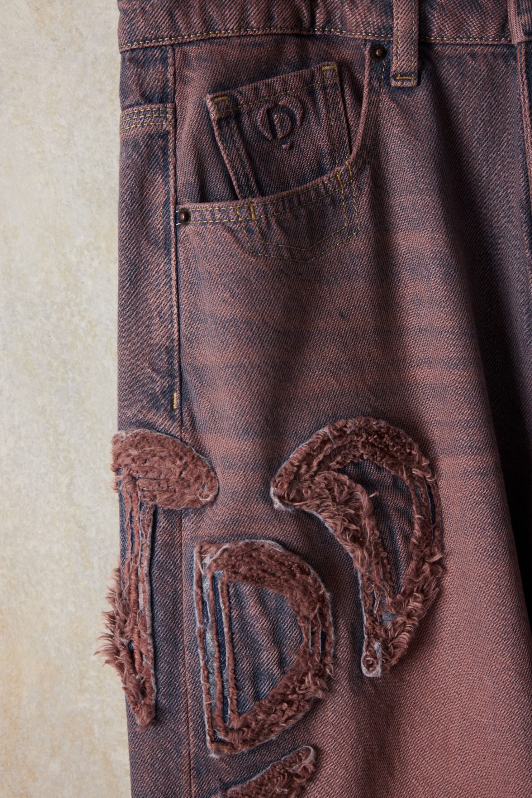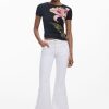 Long baggy-style denim trousers with embroidered fabric appliqués and Desigual logo in a frayed effect.