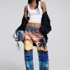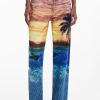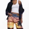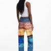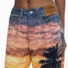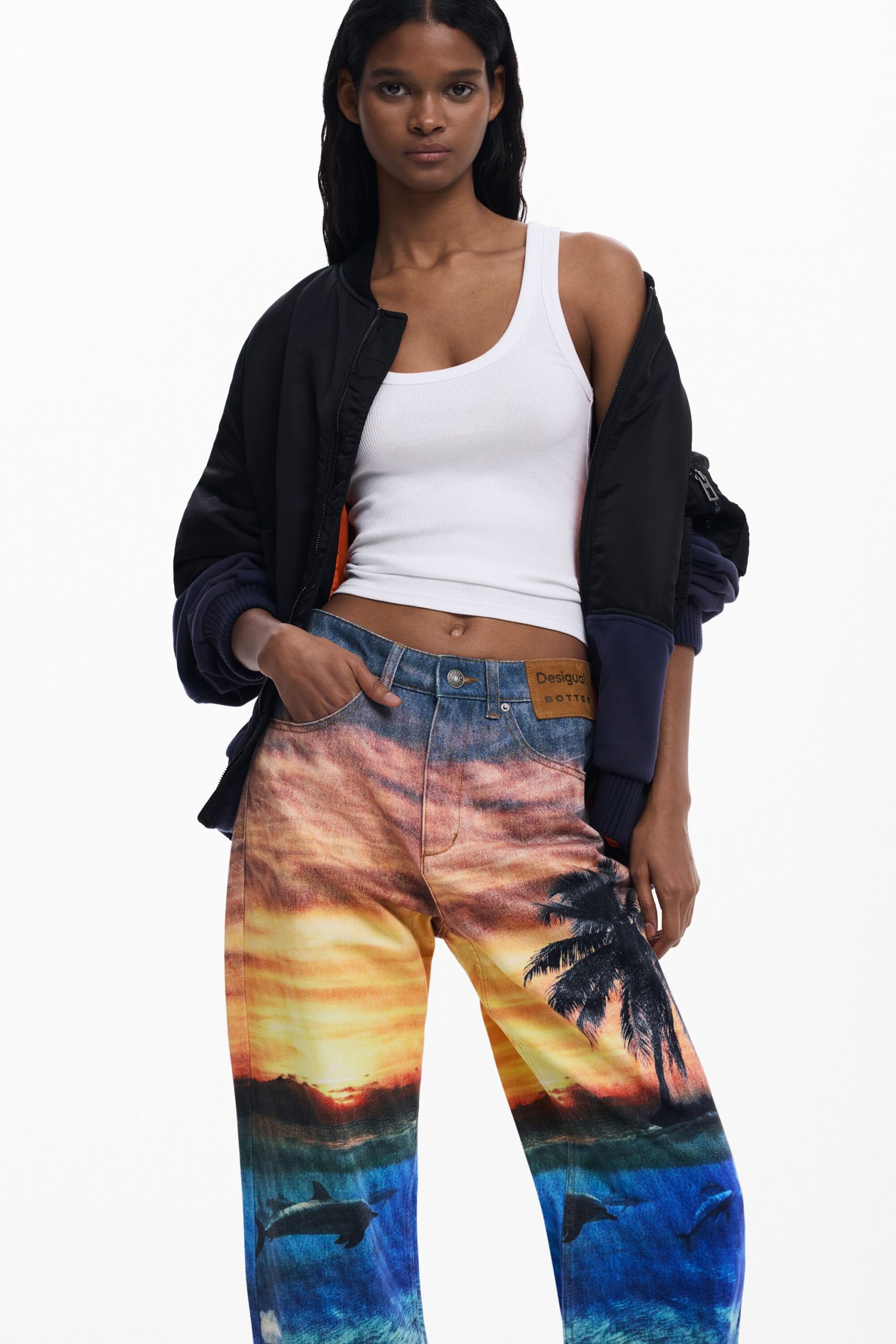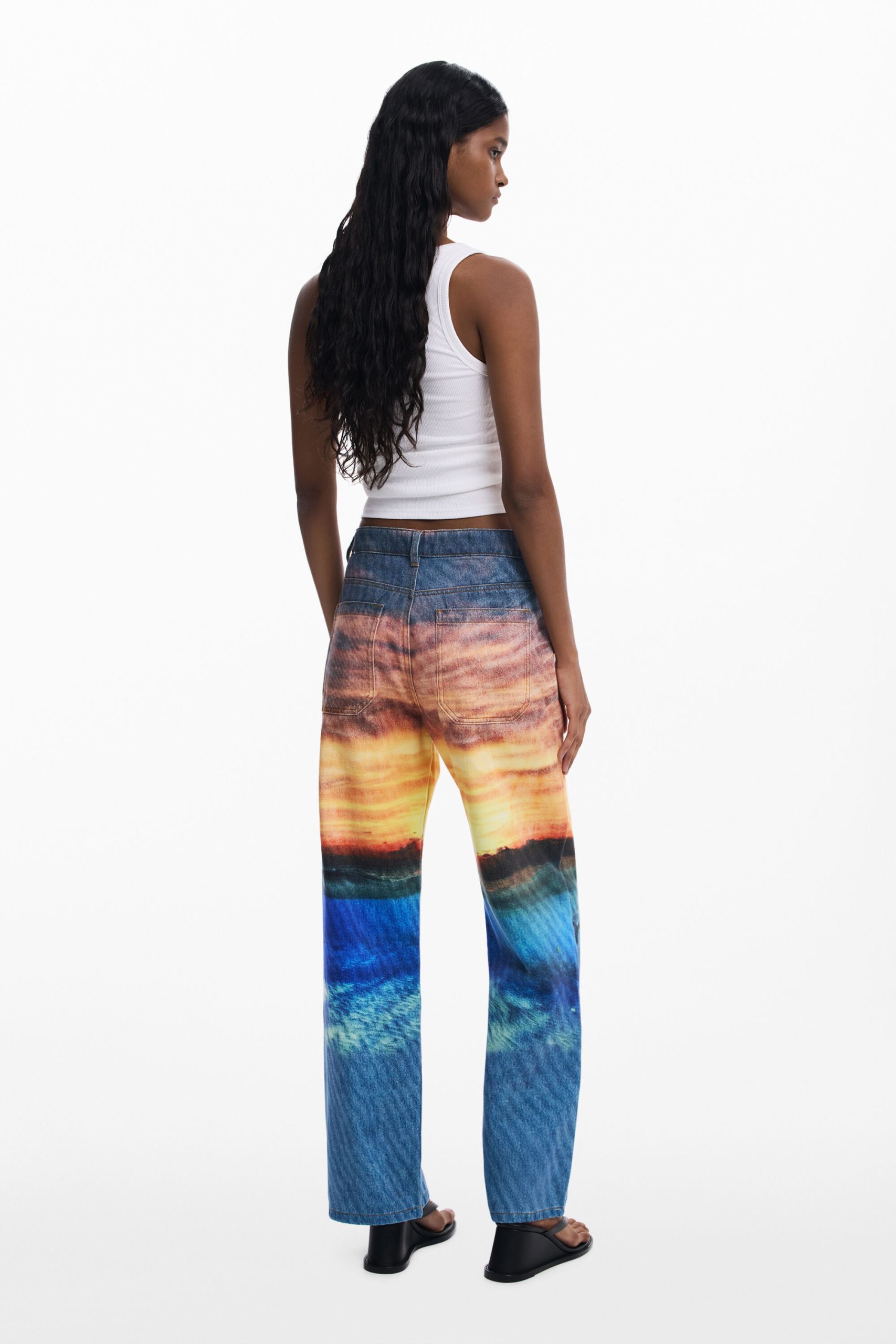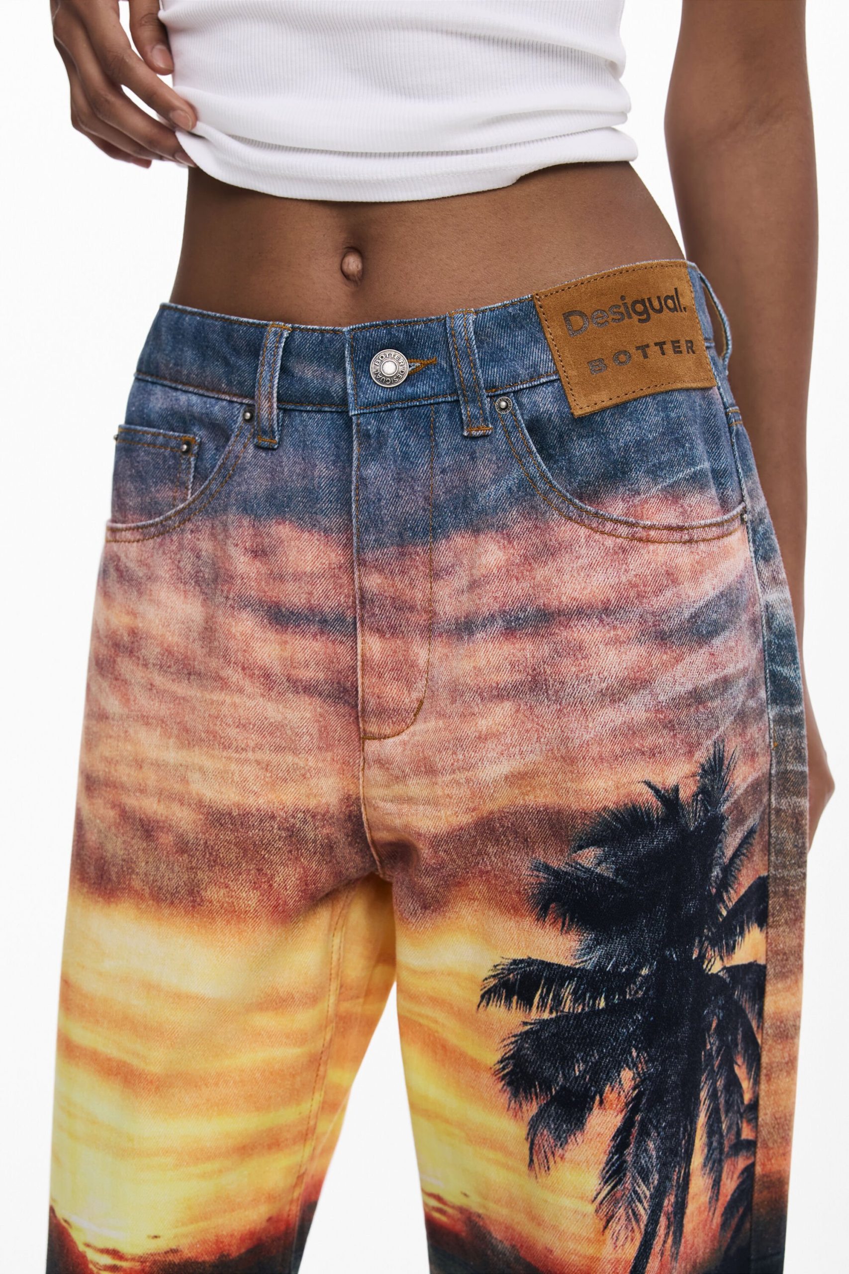 Boyfriend-cut denim trousers with a stamped suede label on the front, sunset-inspired print, and dolphin details on the lower leg.