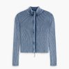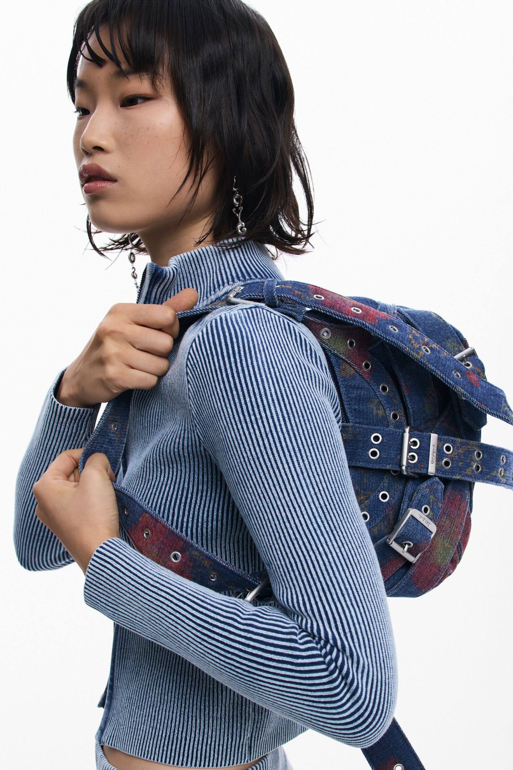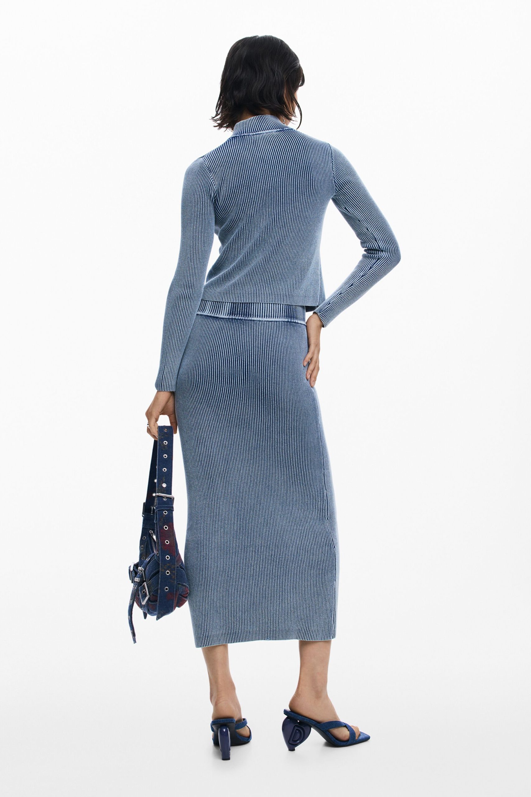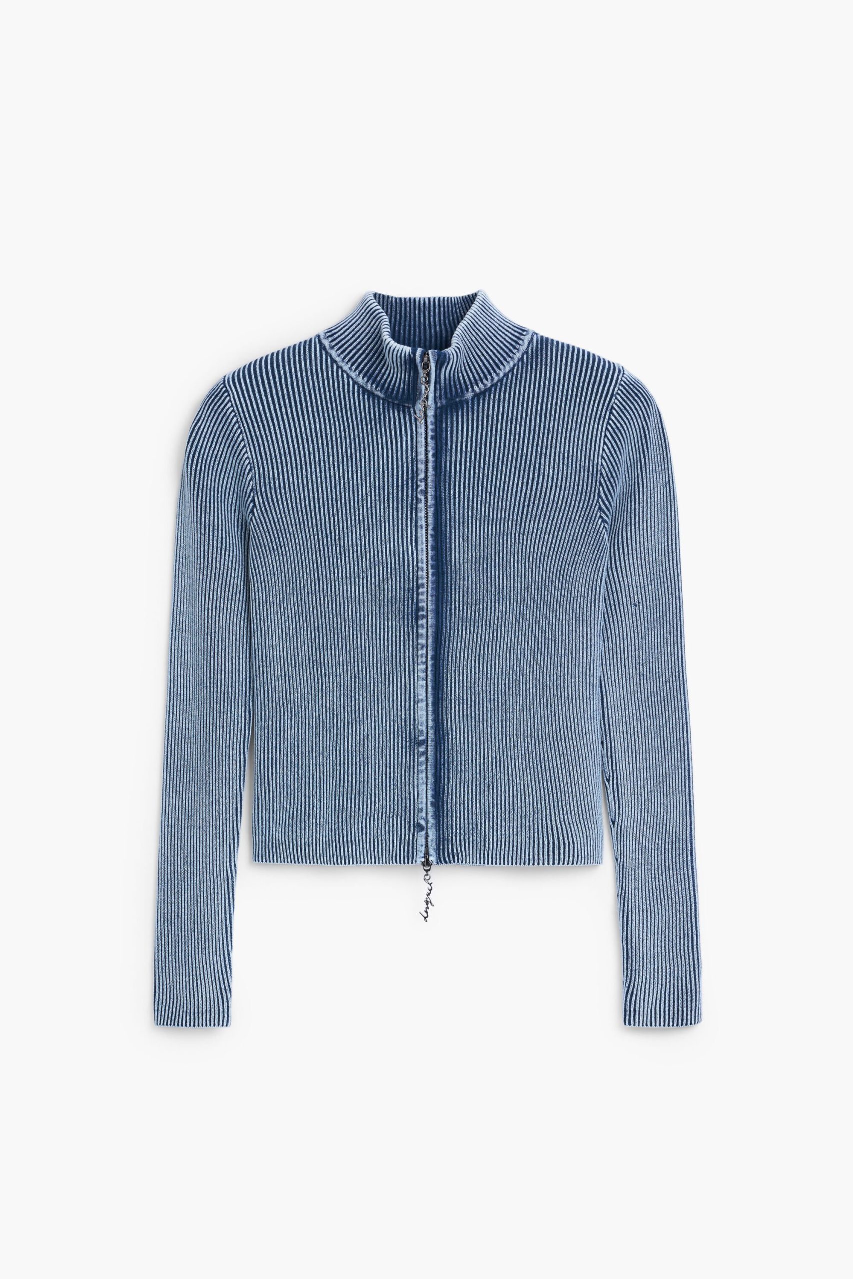 Thick sweater with front zipper, turtleneck, and distressed-effect design.