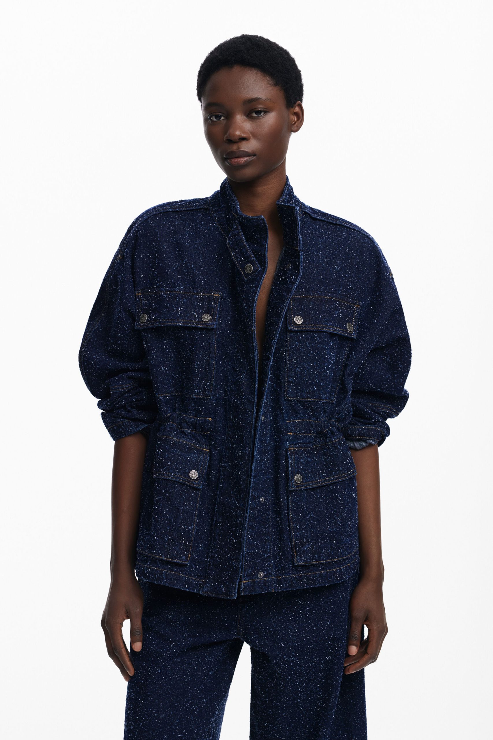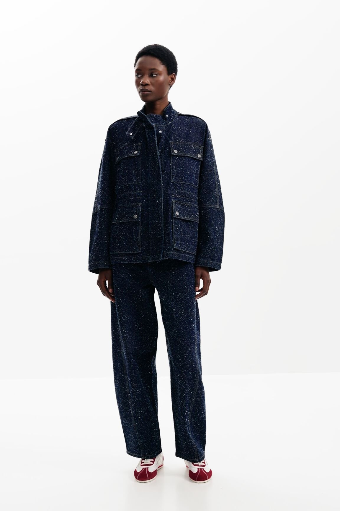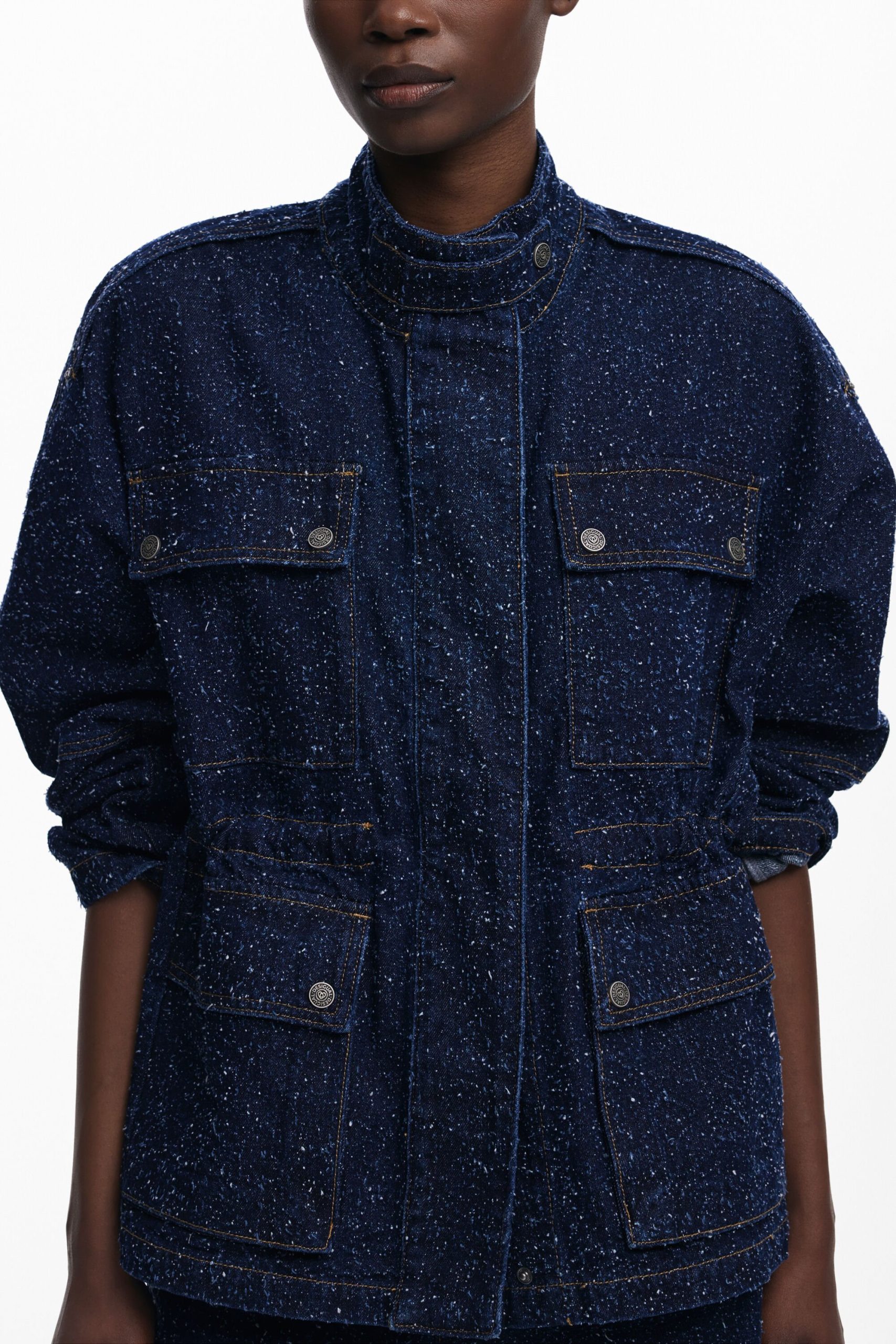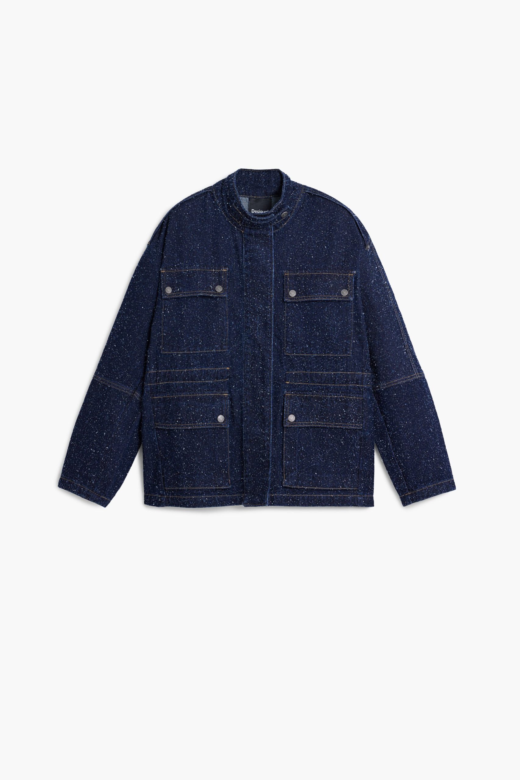Straight-cut jacket with trucker style, front flap pockets, and mottled print.