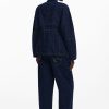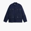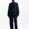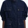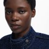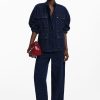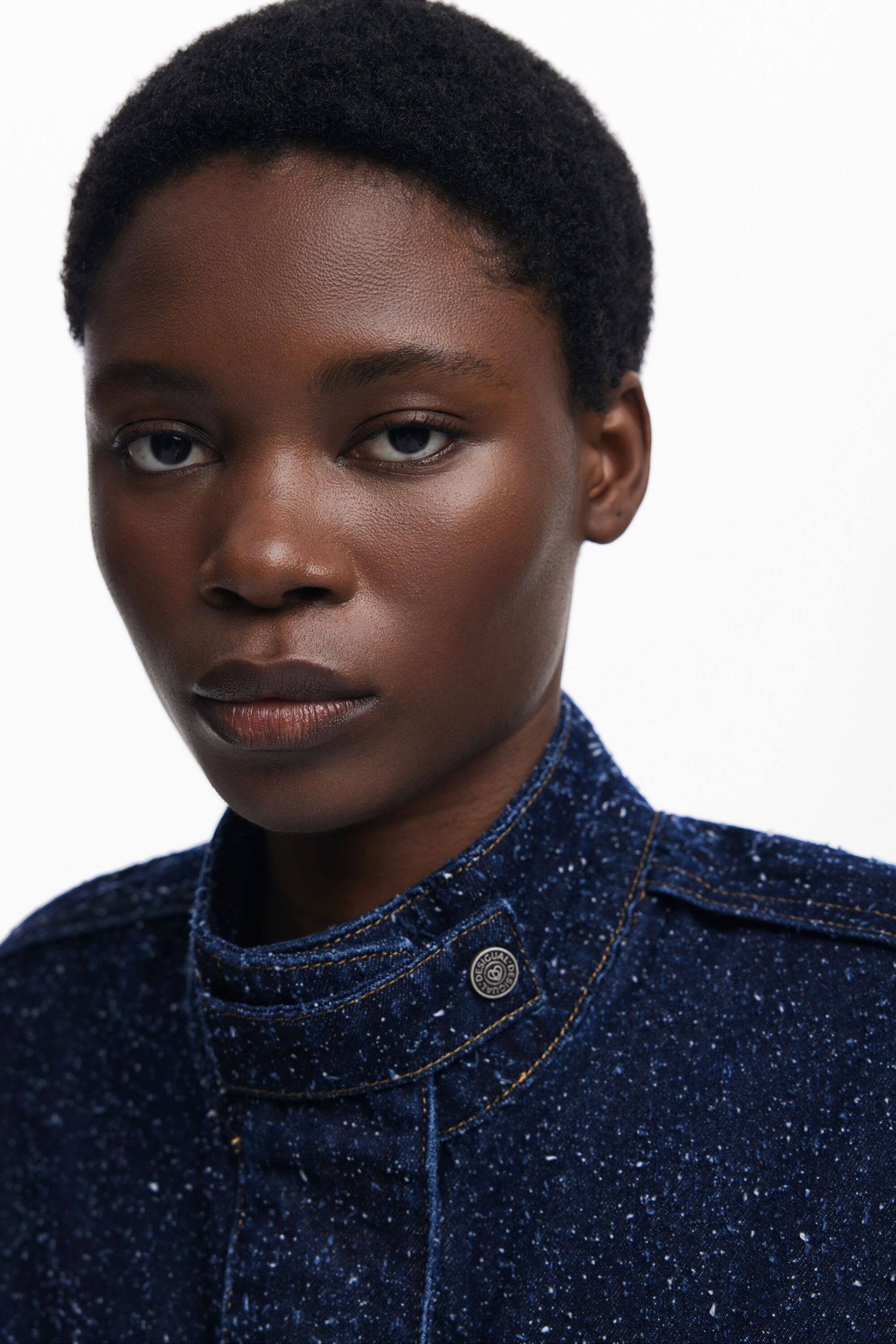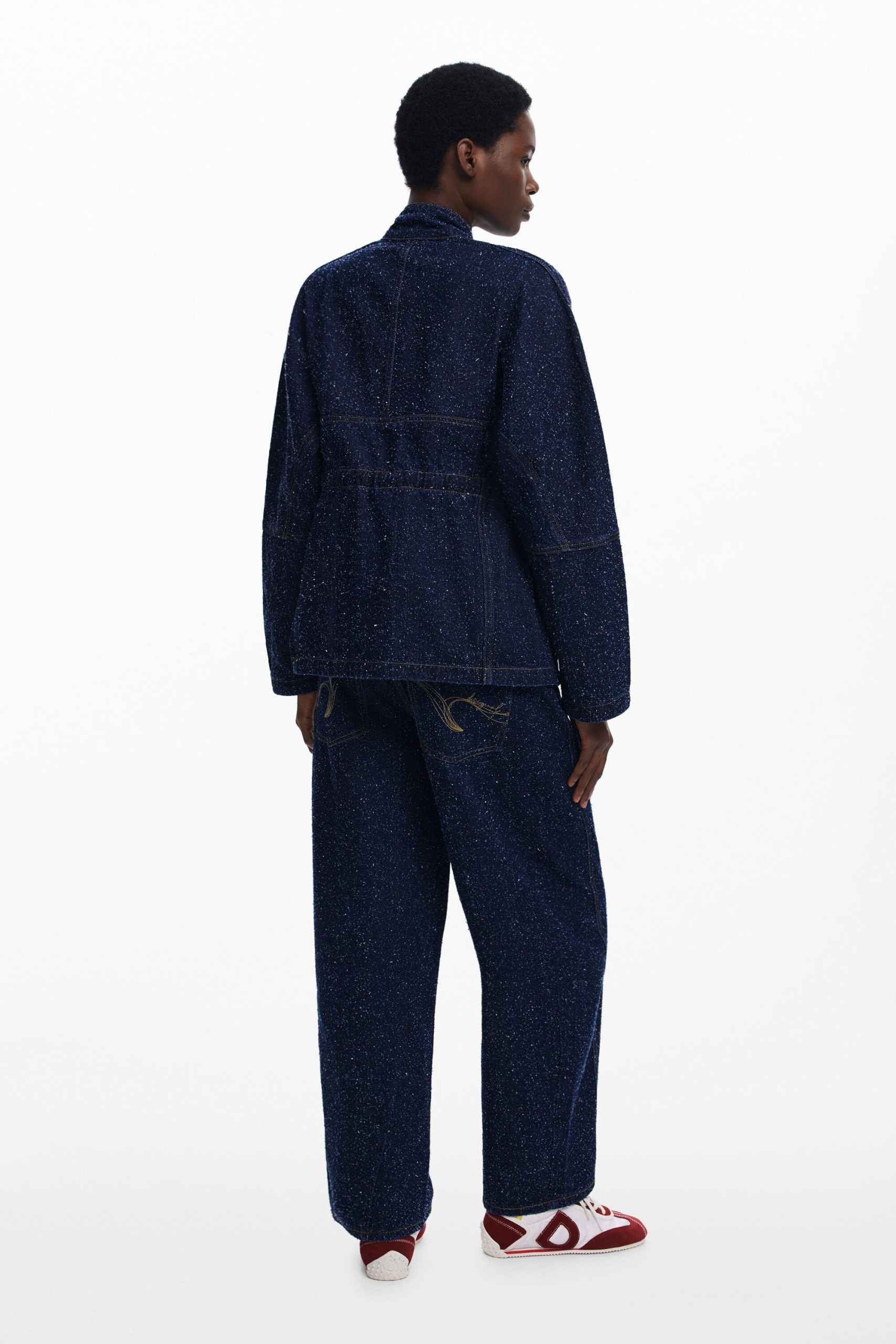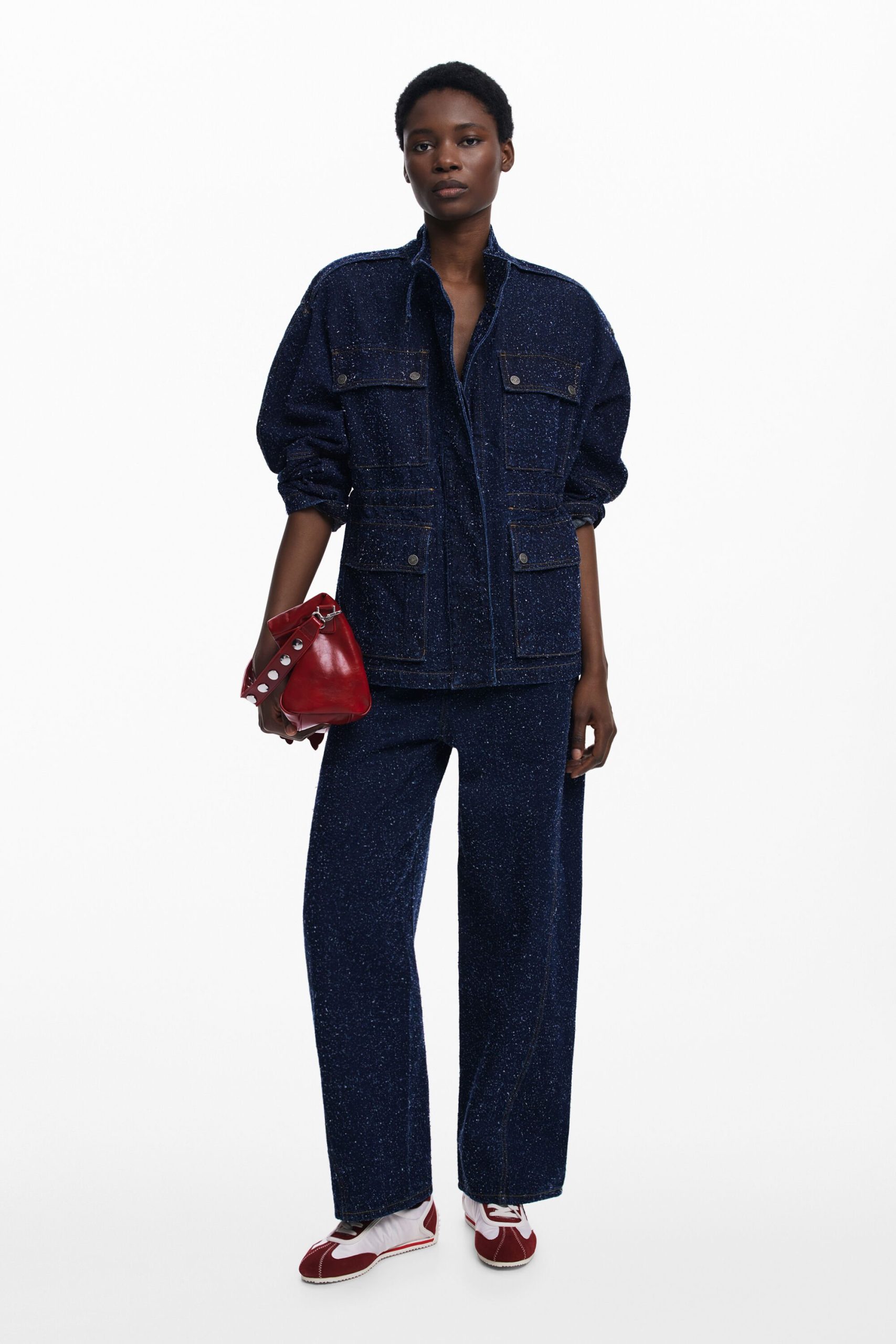 Straight-cut jacket with trucker style, front flap pockets, and mottled print.
