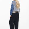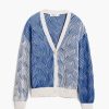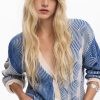 Buttoned cardigan-style knit sweater, long sleeves, and V-neck with two-tone embossed print.