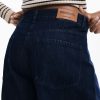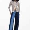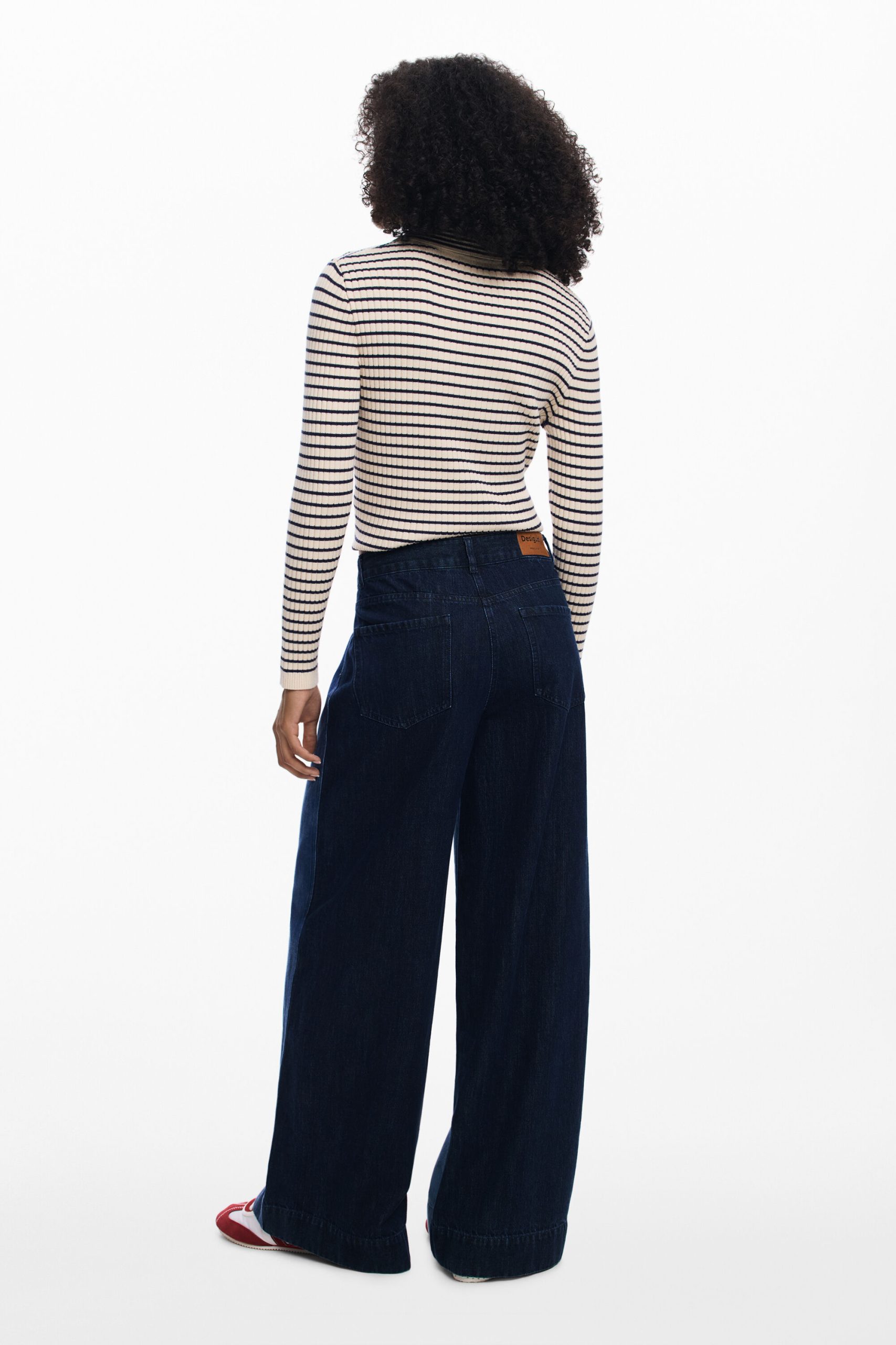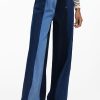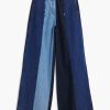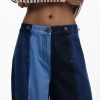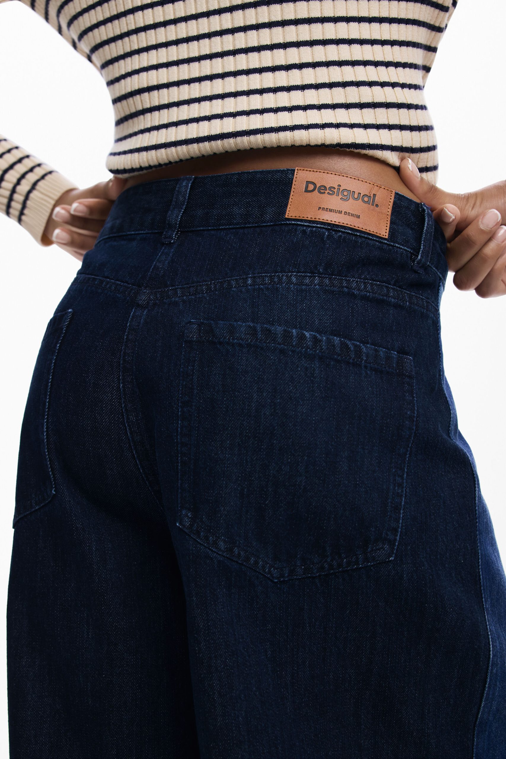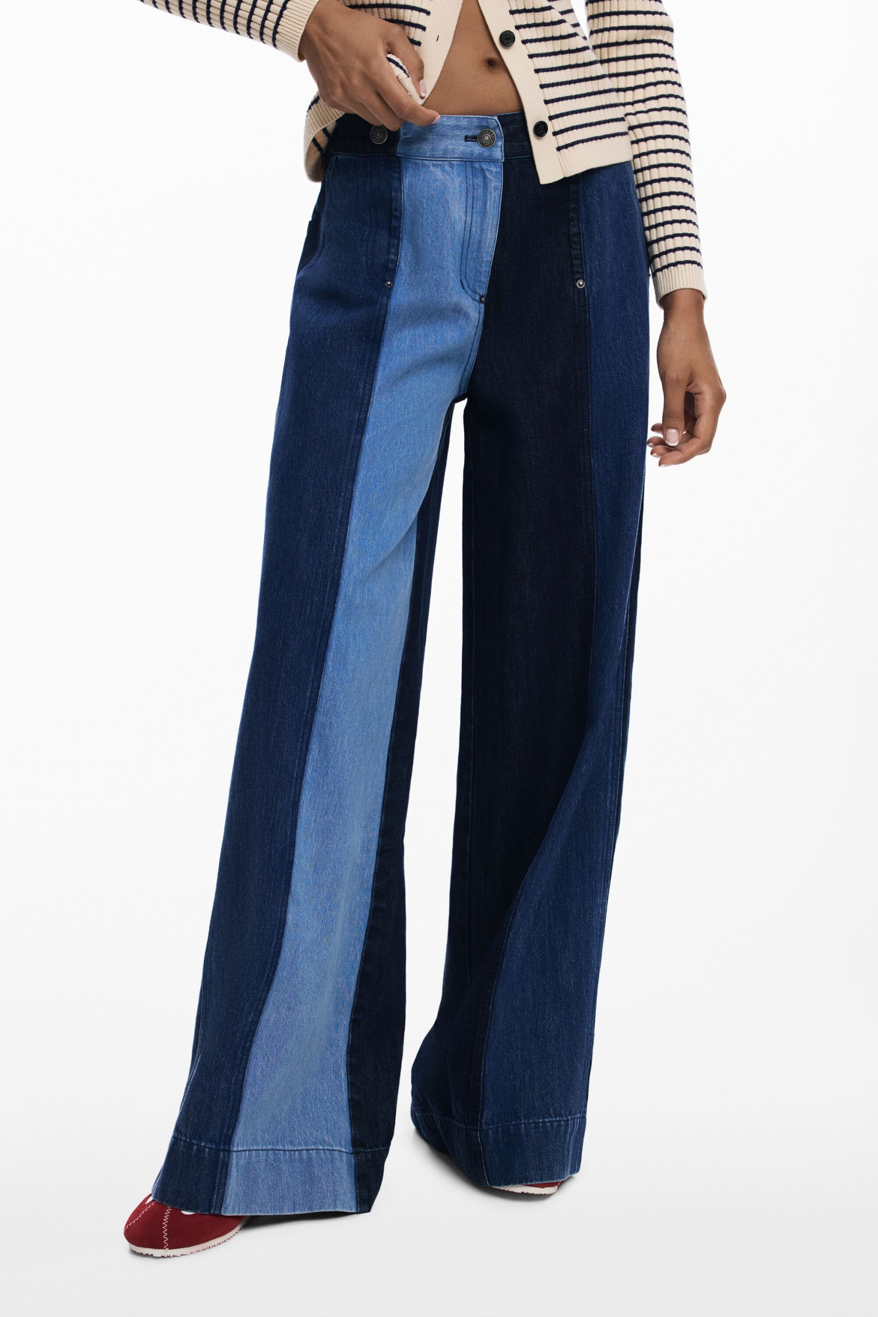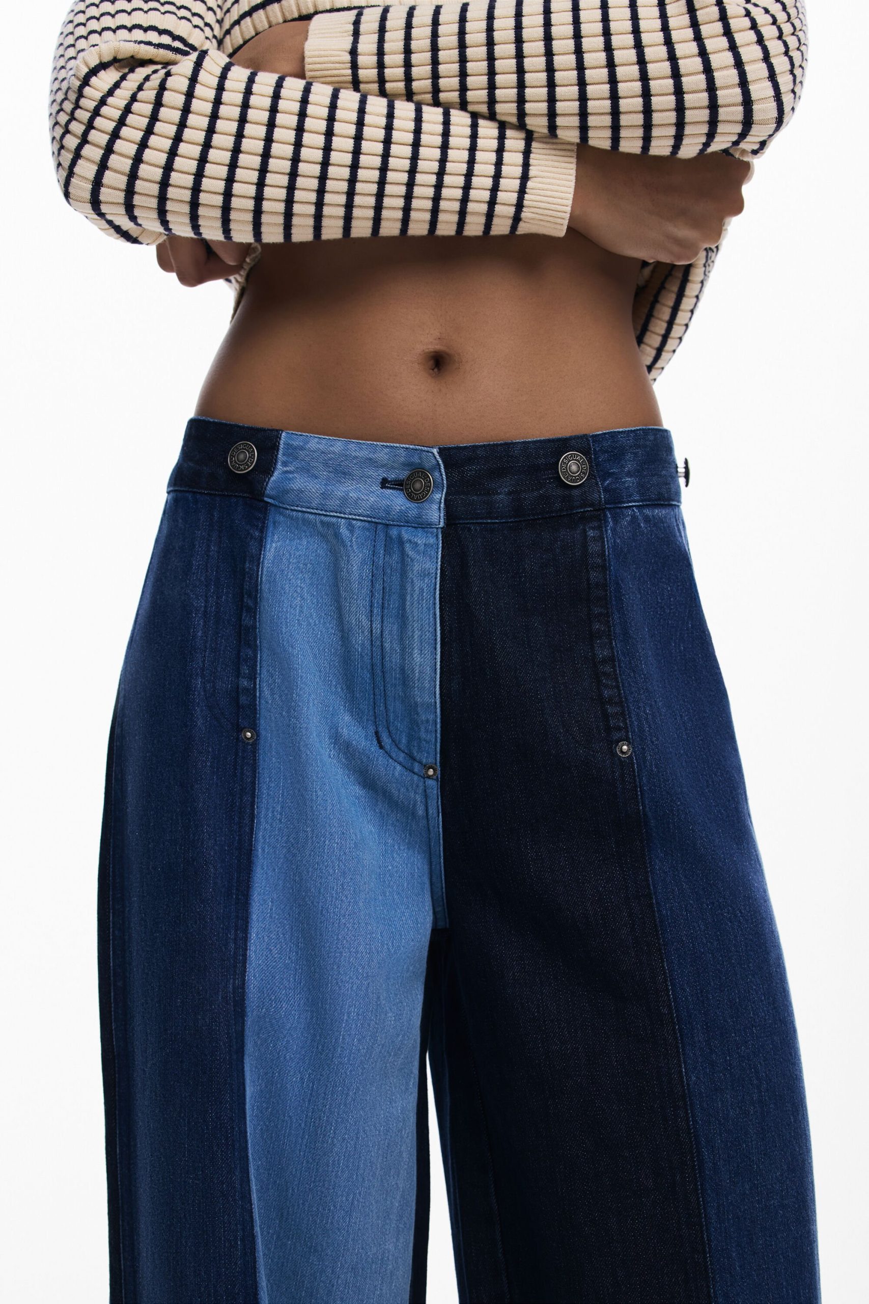 Long denim pants with panels, patchwork style, side and back pockets, and zipper and button closure.